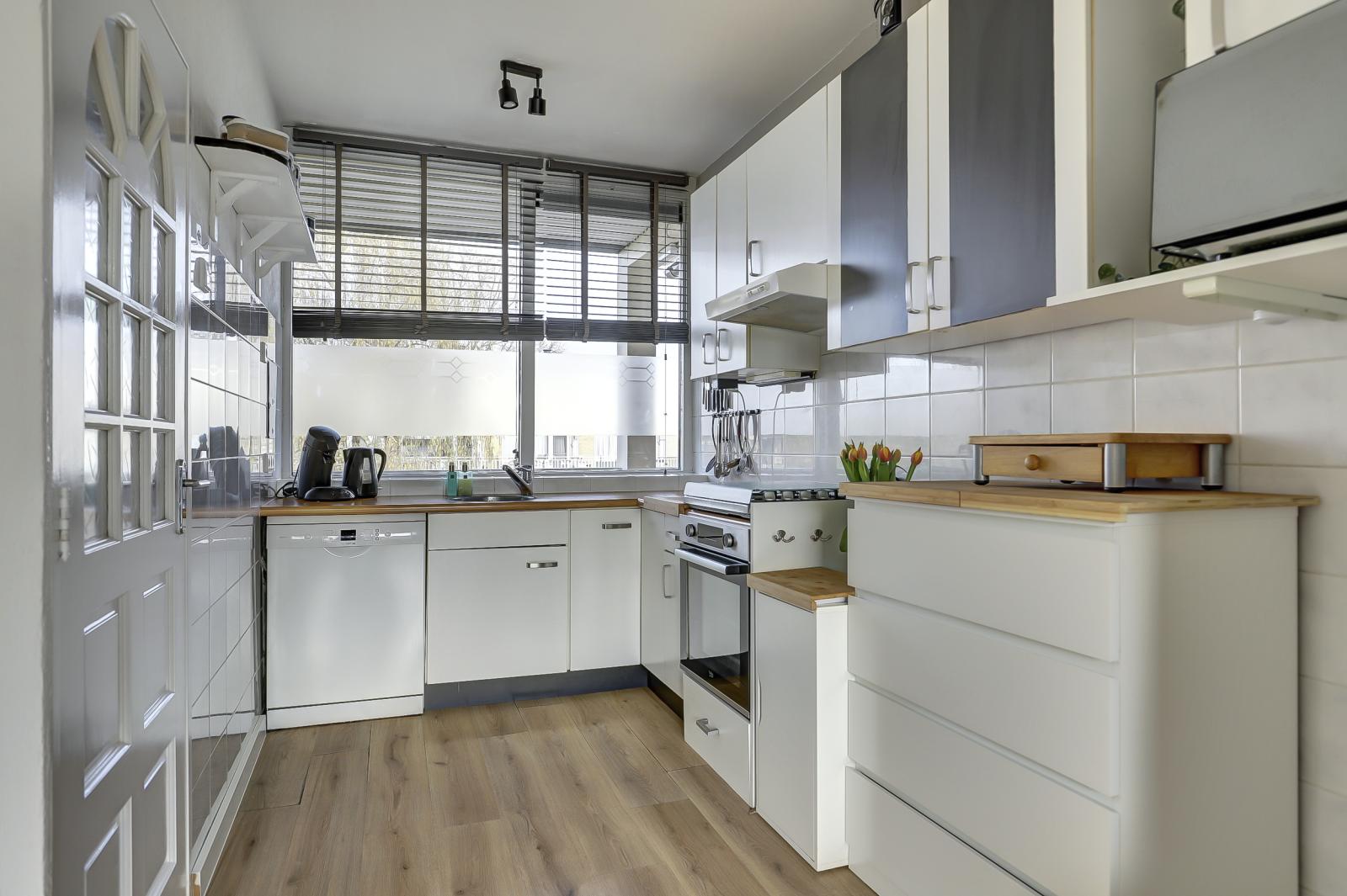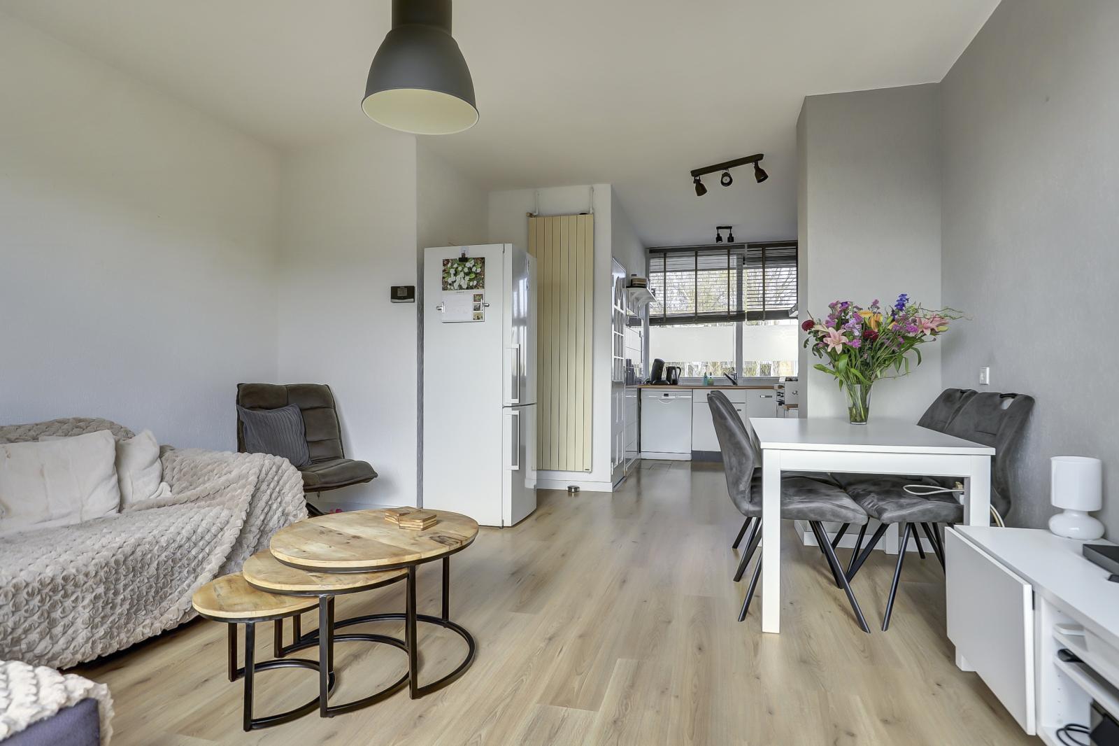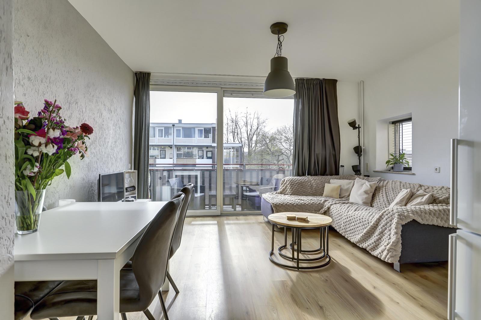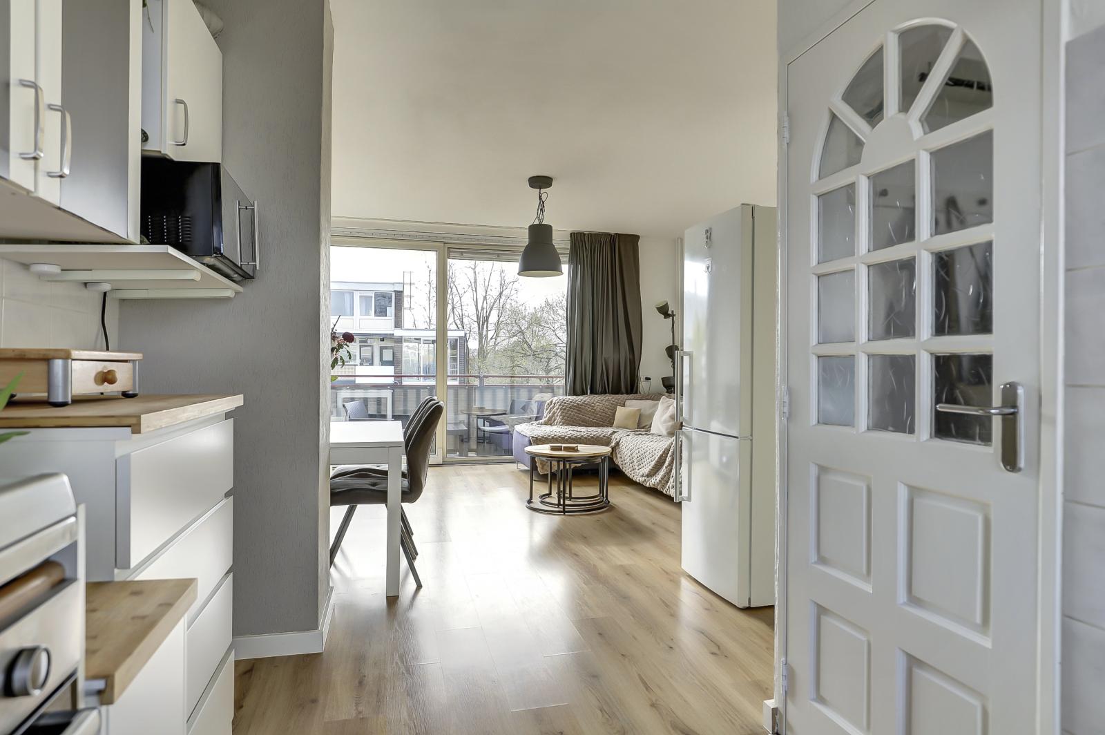De indeling is uiterst praktisch. Aangezien het hoekappartement betreft, is er een extra raam aan de zijkant dat voor veel extra lichtinval zorgt. De woonkamer beschikt over een grote schuifpui naar het balkon op het oosten. Hier geniet je in de ochtend heerlijk van je eerste kop koffie in de zon. De open keuken sluit naadloos aan op de lichte woonkamer.