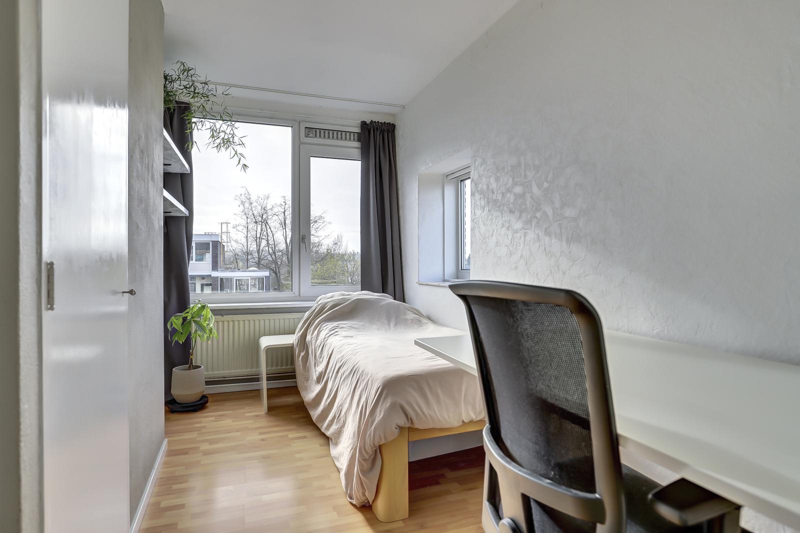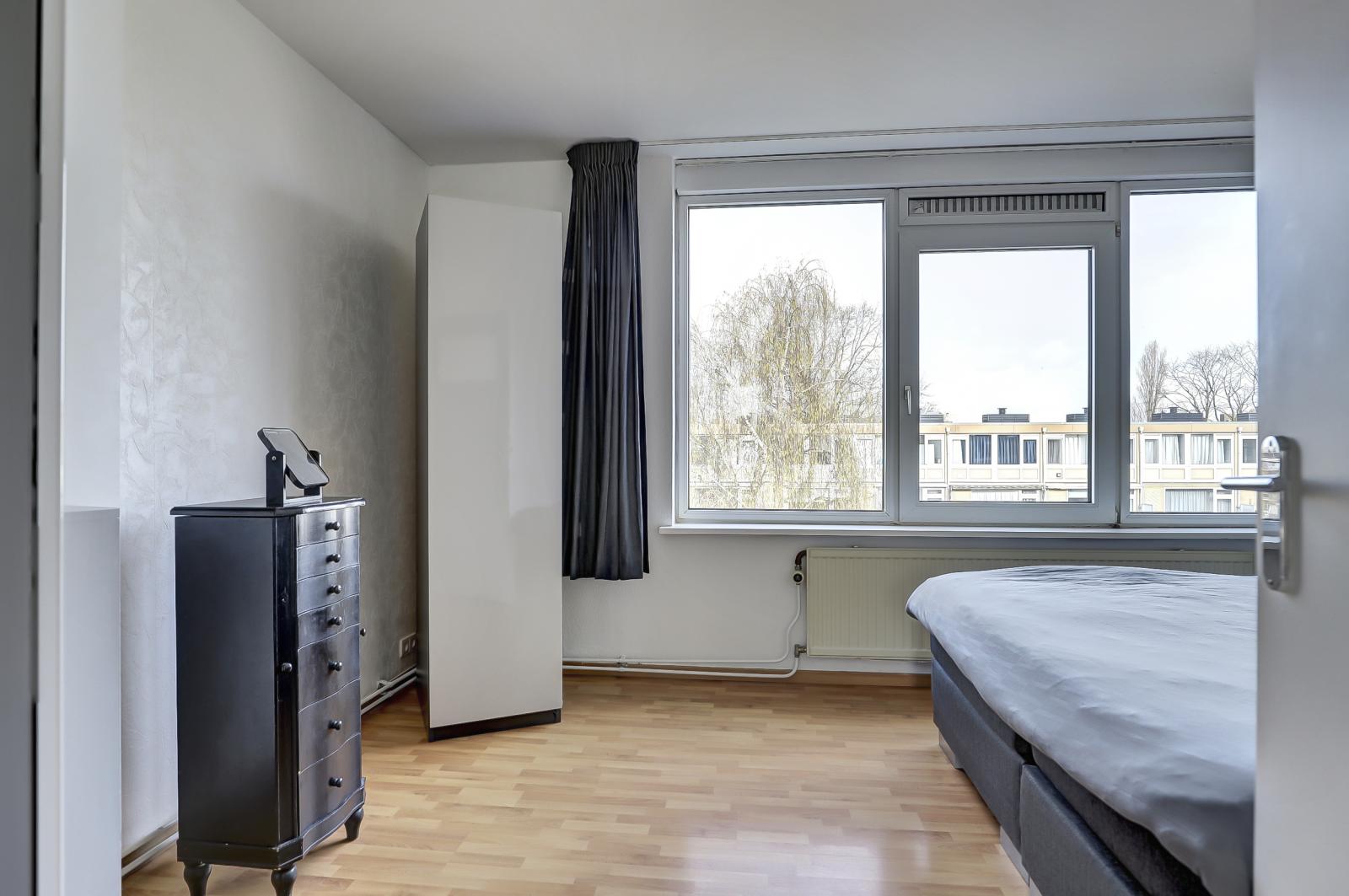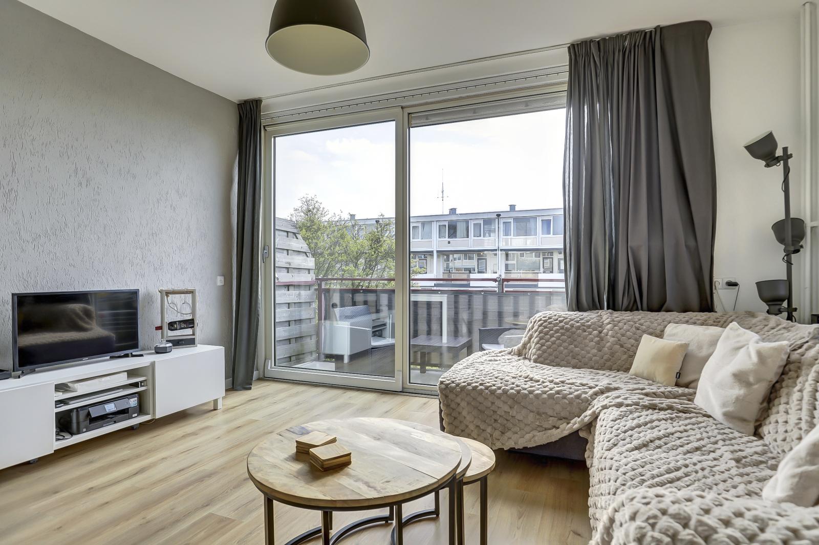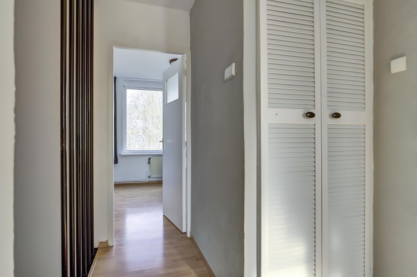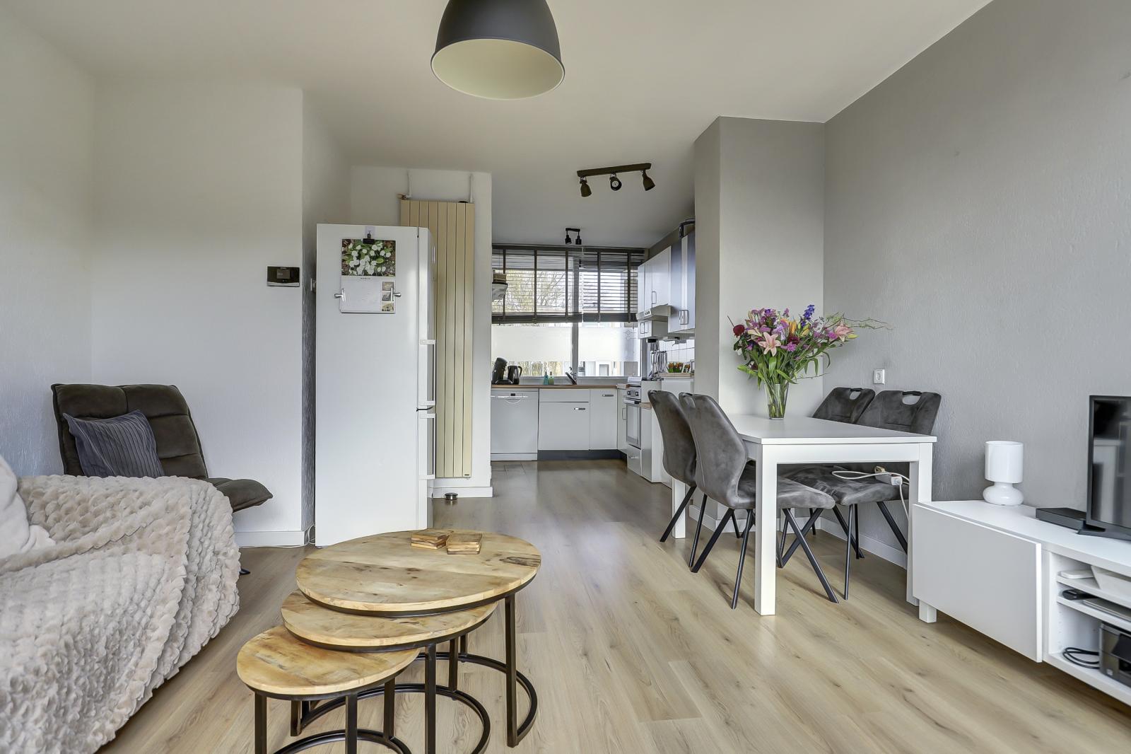 De indeling is uiterst praktisch. Aangezien het hoekappartement betreft, is er een extra raam aan de zijkant dat voor veel extra lichtinval zorgt. De woonkamer beschikt over een grote schuifpui naar het balkon op het oosten. Hier geniet je in de ochtend heerlijk van je eerste kop koffie in de zon. De open keuken sluit naadloos aan op de lichte woonkamer.