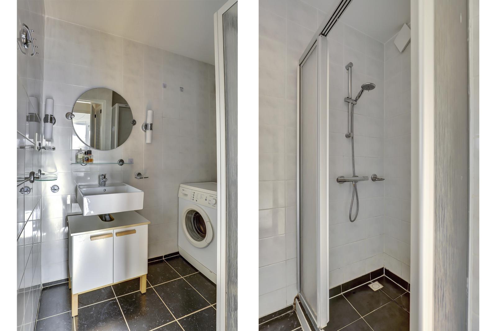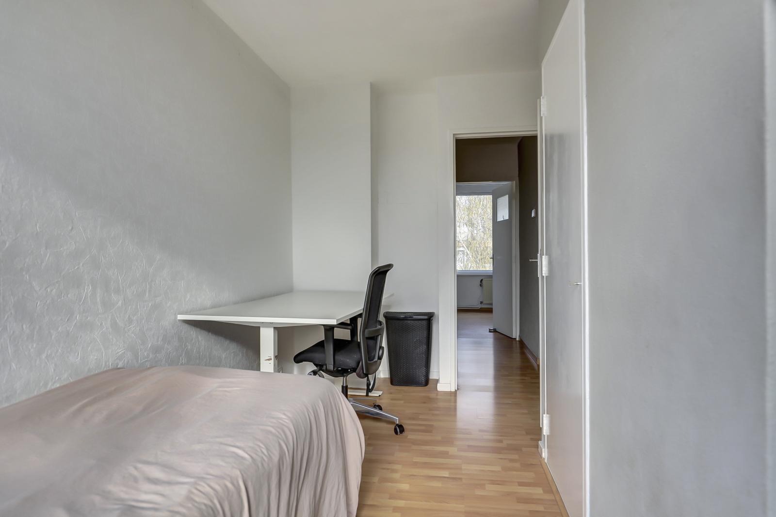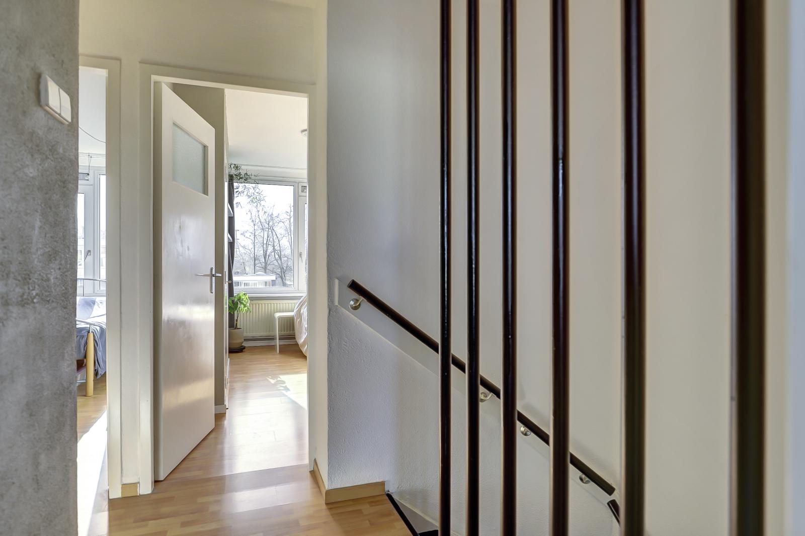 Tweede verdieping: Vaste trap naar ruime overloop, drie in grootte variërende slaapkamers, functioneel ingerichte badkamer voorzien van een douche, wastafel en aansluiting voor de wasmachine.