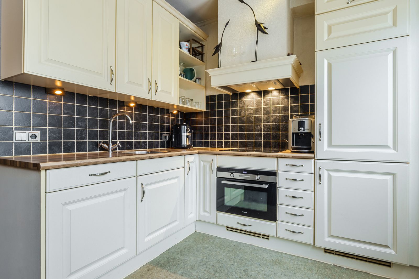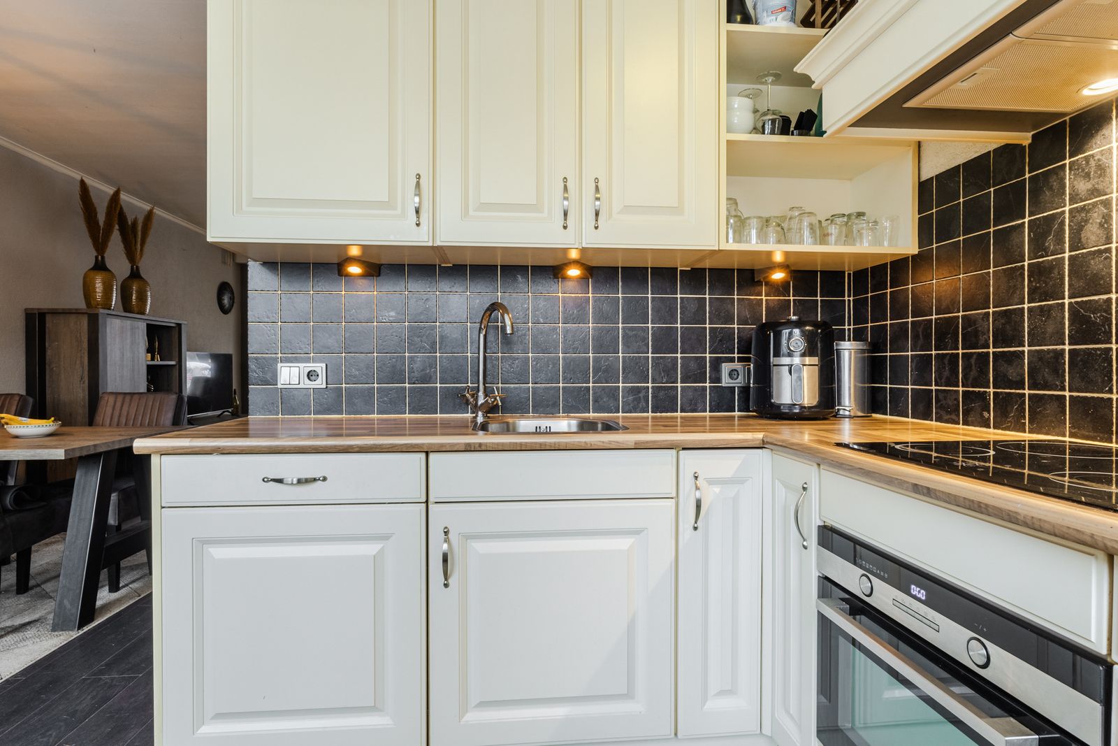 De woning is aan de voorzijde uitgebouwd op zowel de begane grond als de eerste verdieping. Hierdoor is er op de begane grond een heerlijk ruime woonkamer ontstaan met een groot zitgedeelte aan de voorzijde. De moderne open keuken (2008) bevindt zich aan de achterzijde en is voorzien van diverse inbouwapparatuur, waaronder een vaatwasser, inductiekookplaat, afzuigkap, combi-oven en een koel-/vriescombinatie. Vanuit de hal bereik je het toilet en de trap naar de verdieping.