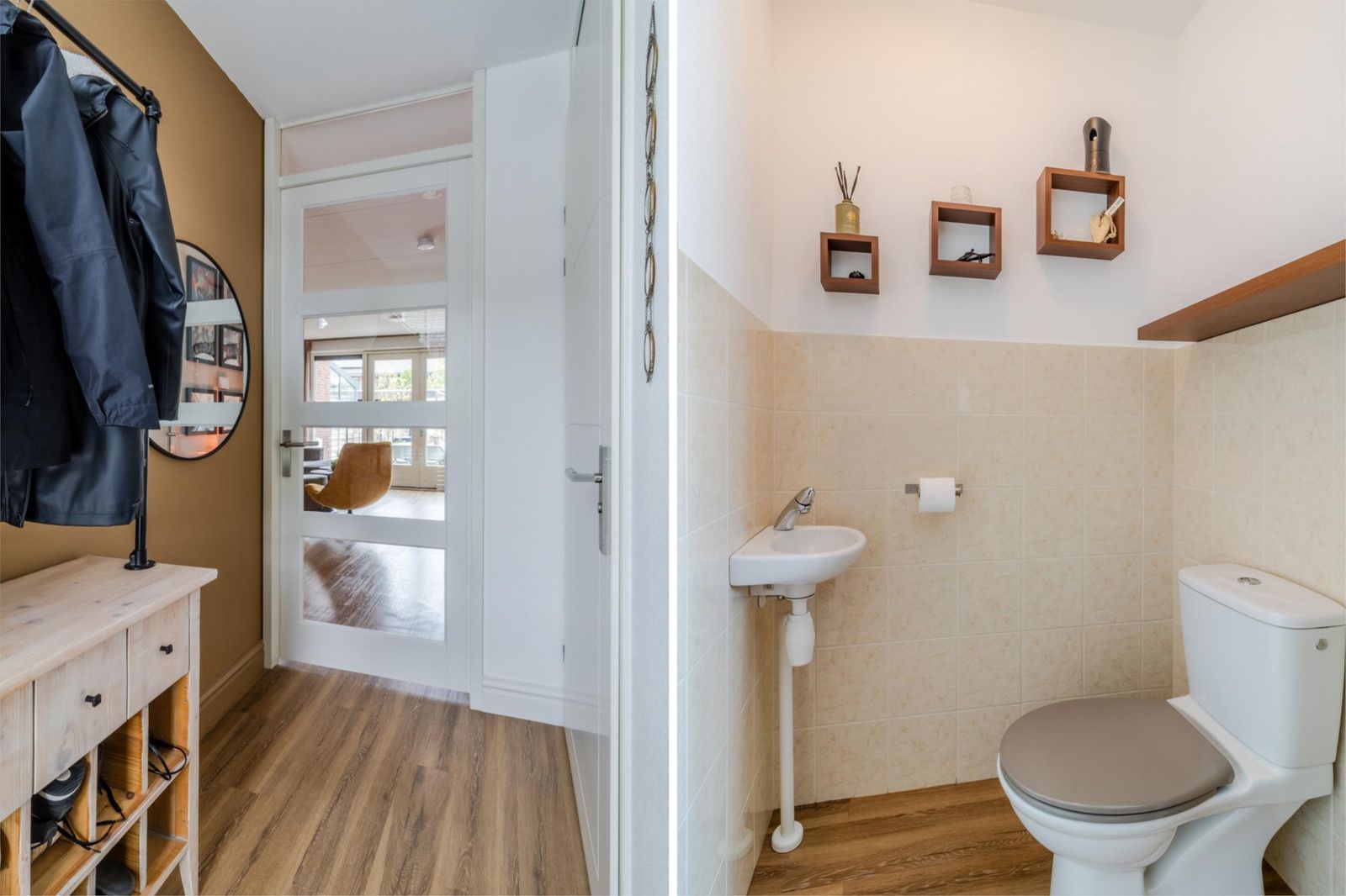 Via de voortuin bereik je de entree, met meterkast en een deels betegelde toiletruimte met staand toilet en fonteintje. De ruime entree geeft ook toegang tot de woonkamer.