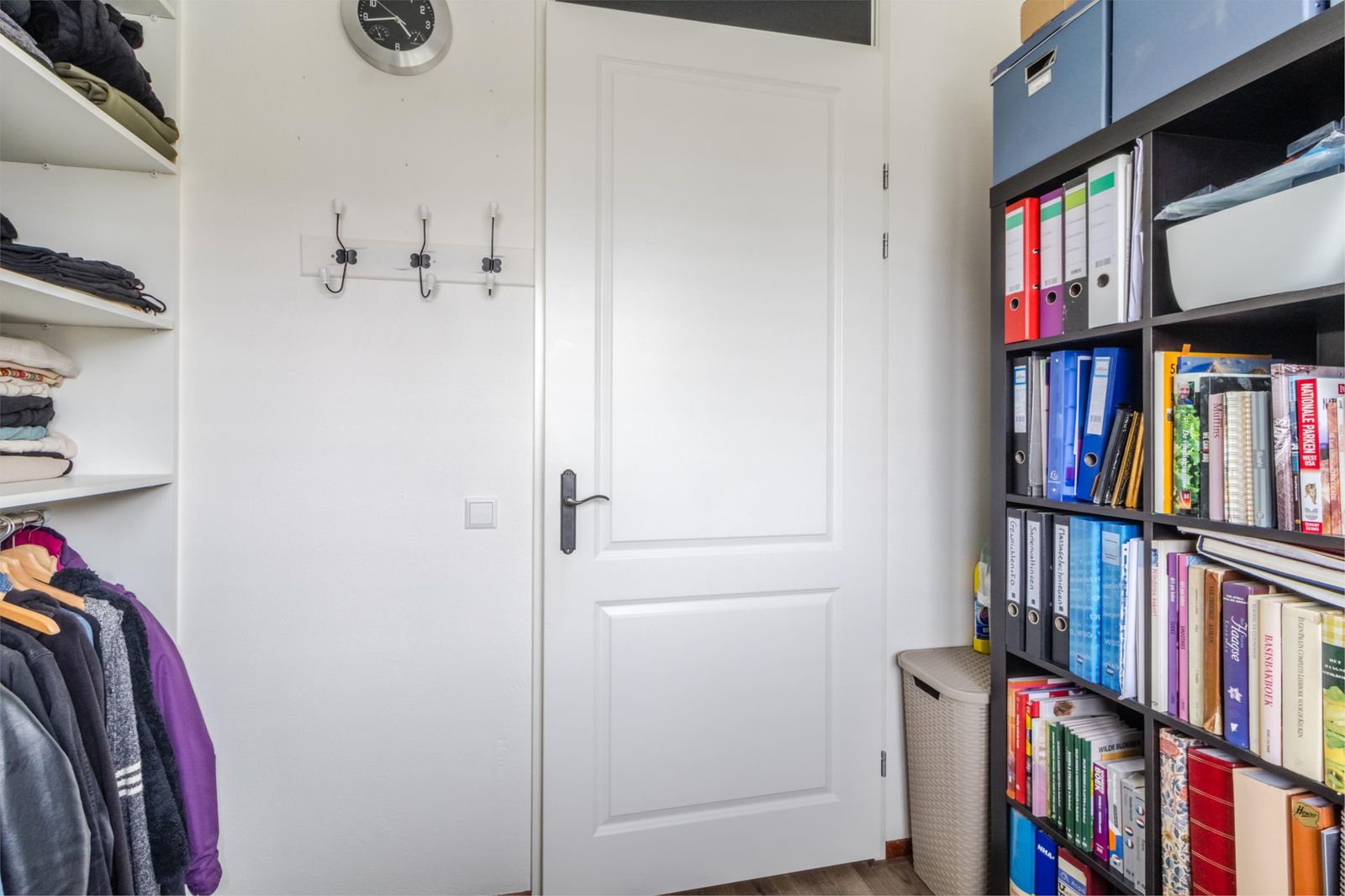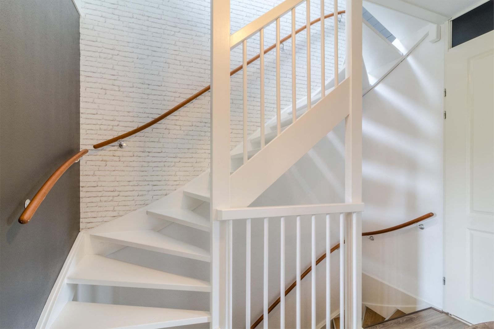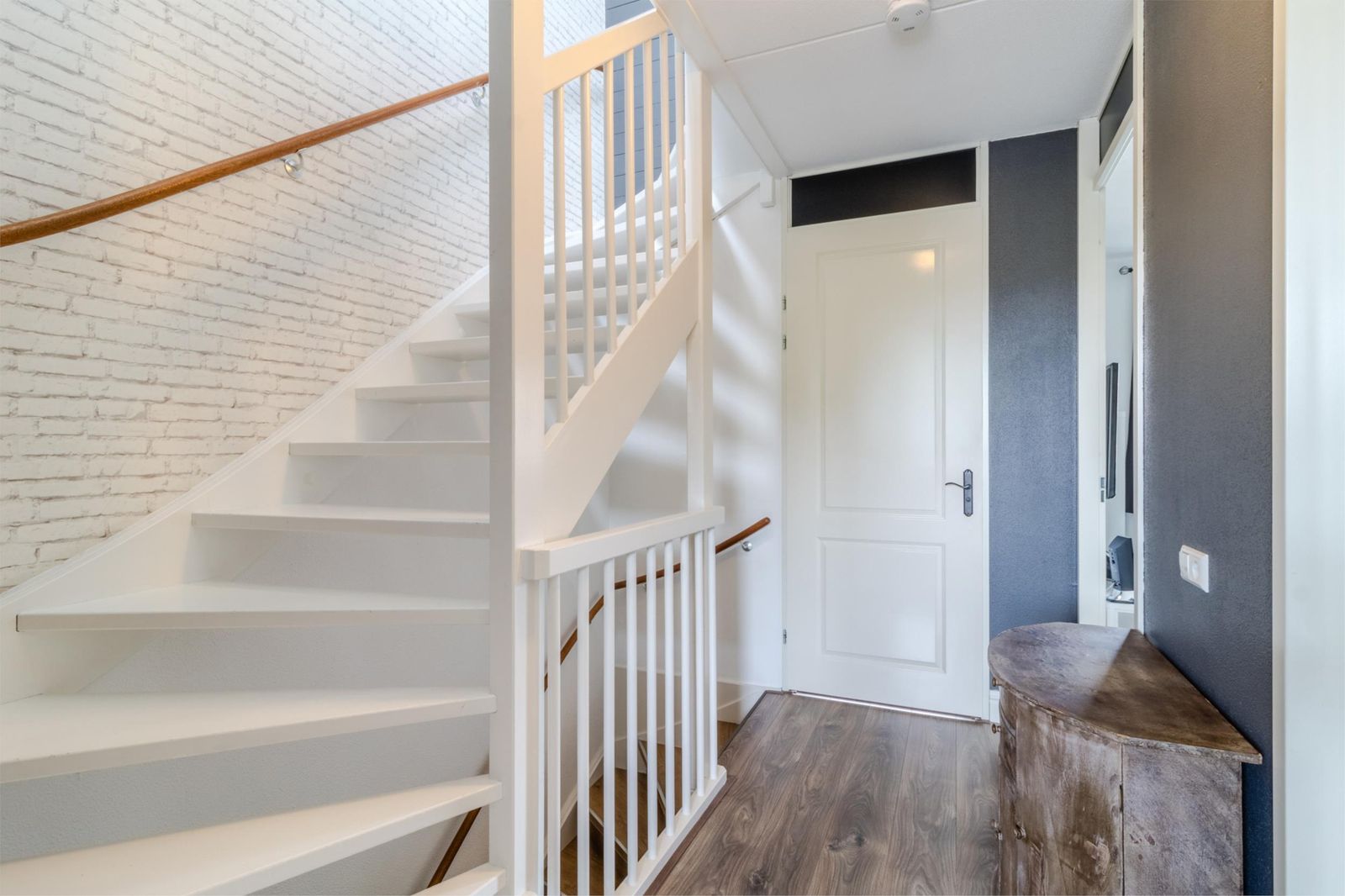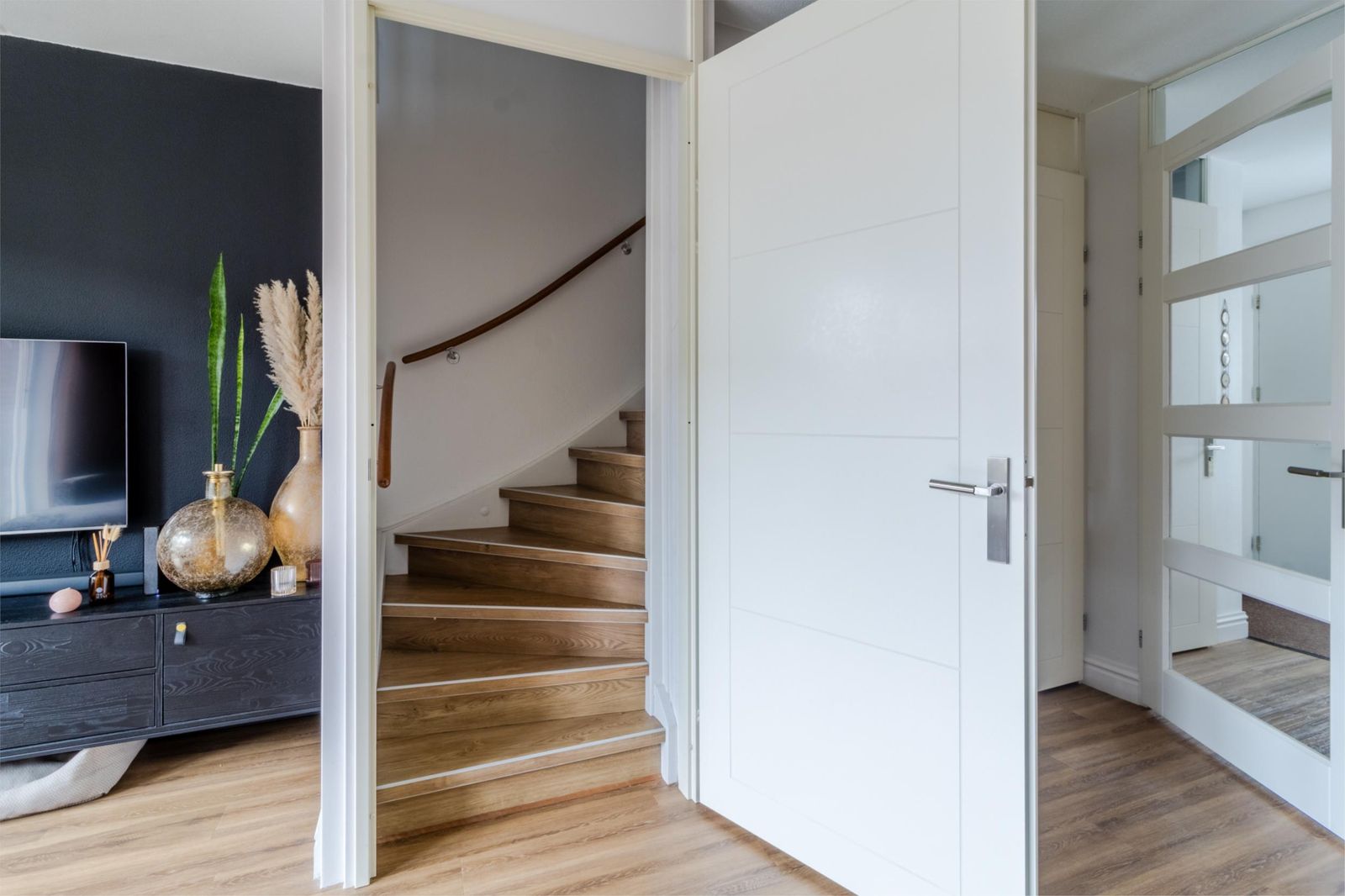 Vanuit de woonkamer is ook toegang tot de praktische voorraad-/trapkast en trapopgang naar de 1e verdieping.
