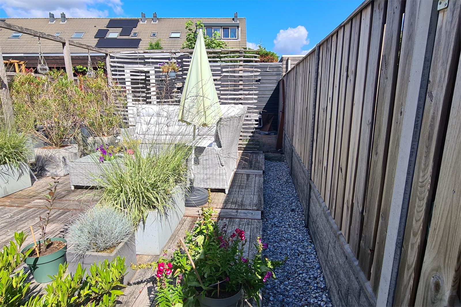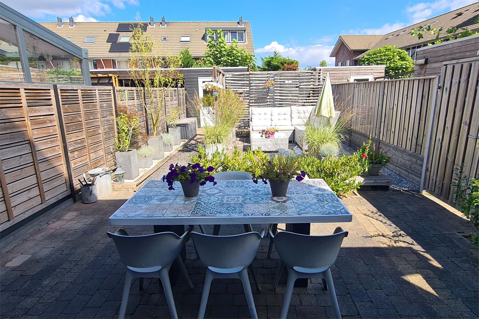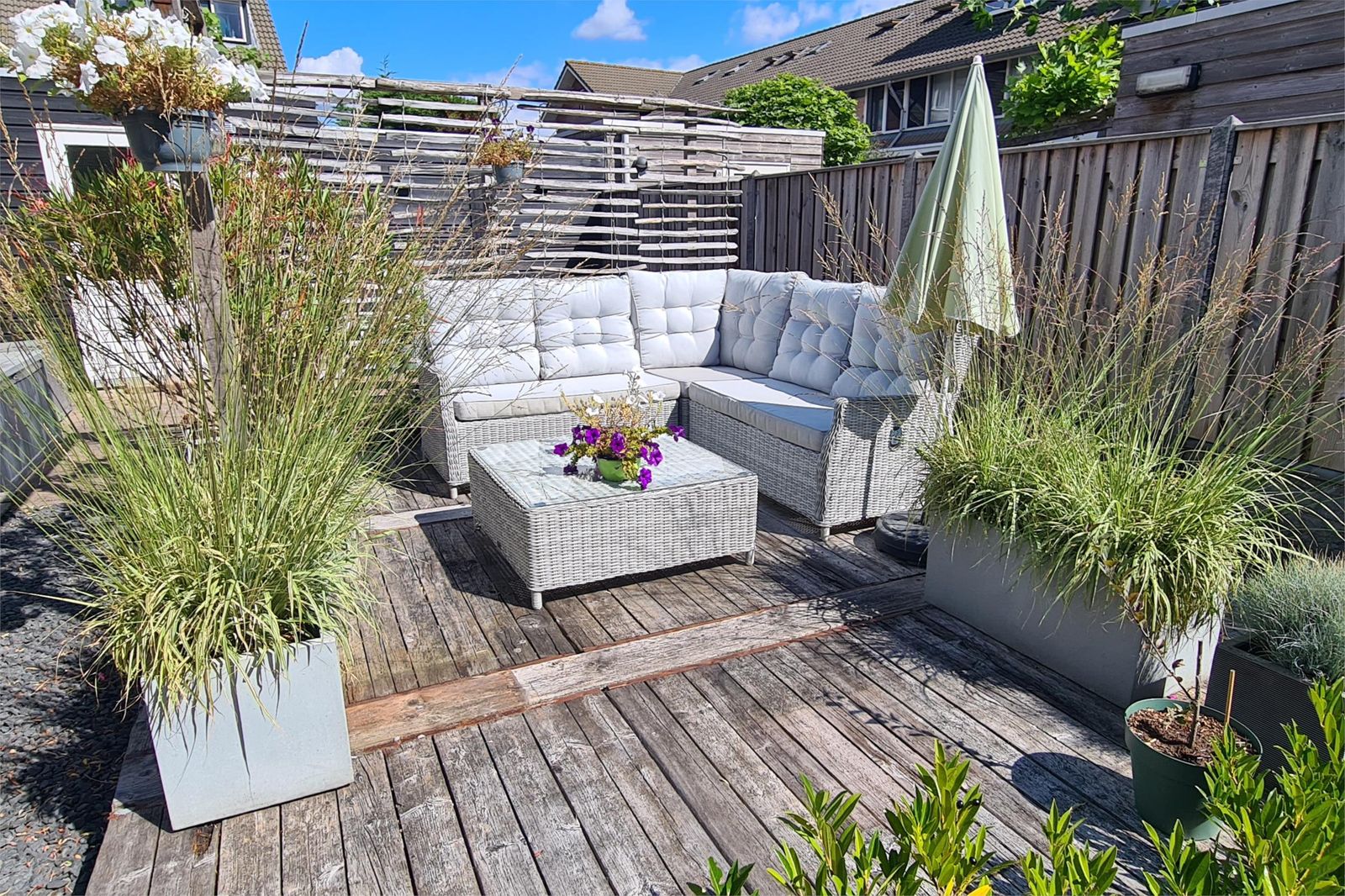 De tuin heeft maar liefst drie terrassen, waaronder een ruim terras in het midden op houten vlonderdelen. Dit centrale terras is omringd door plantenbakken en via een grindpad loop je door naar het achtergelegen terras en de houten berging van ca.17m², voorzien van elektra.