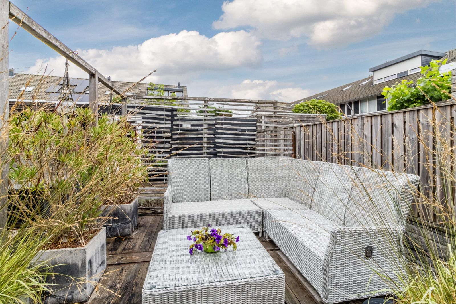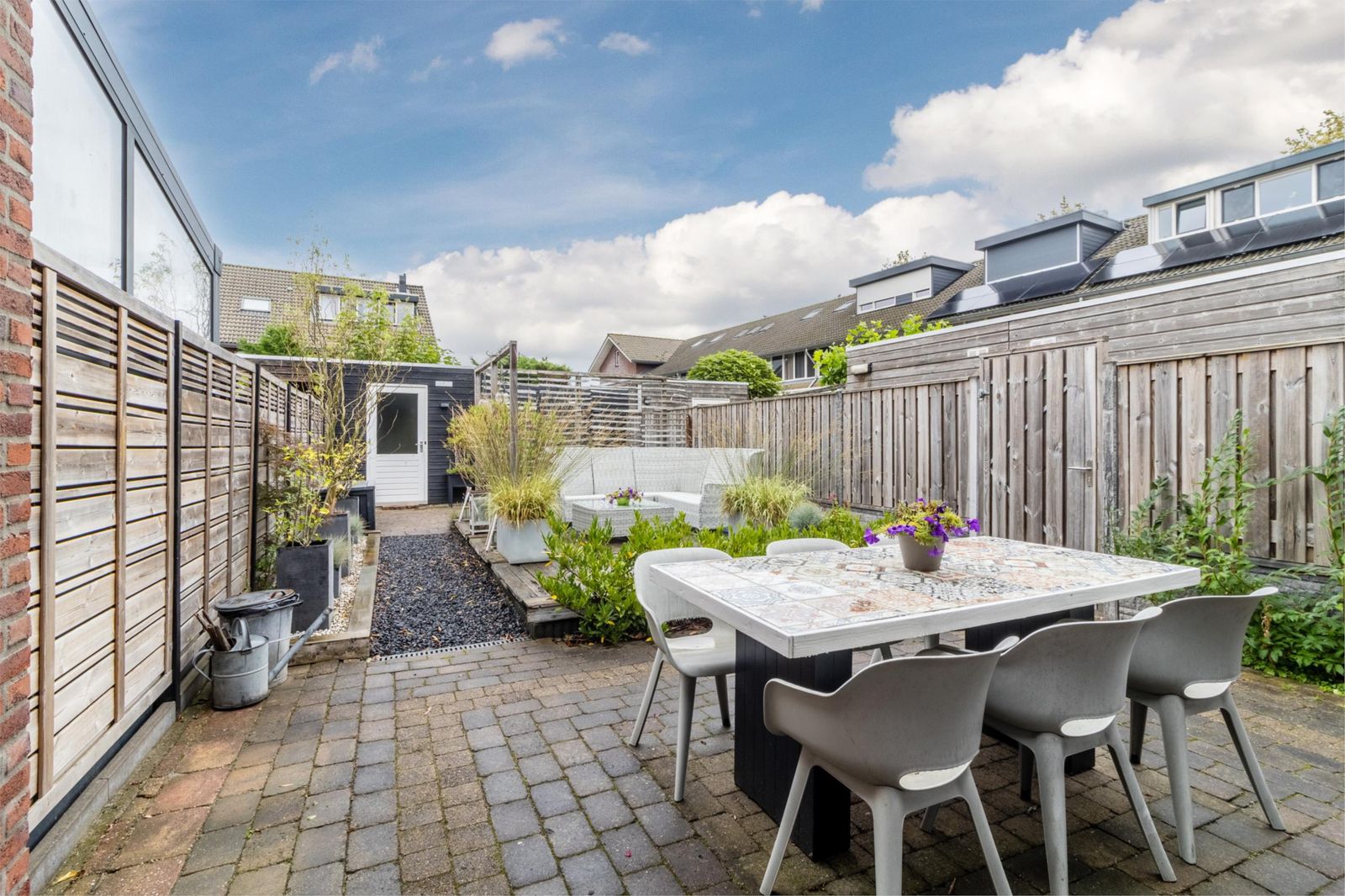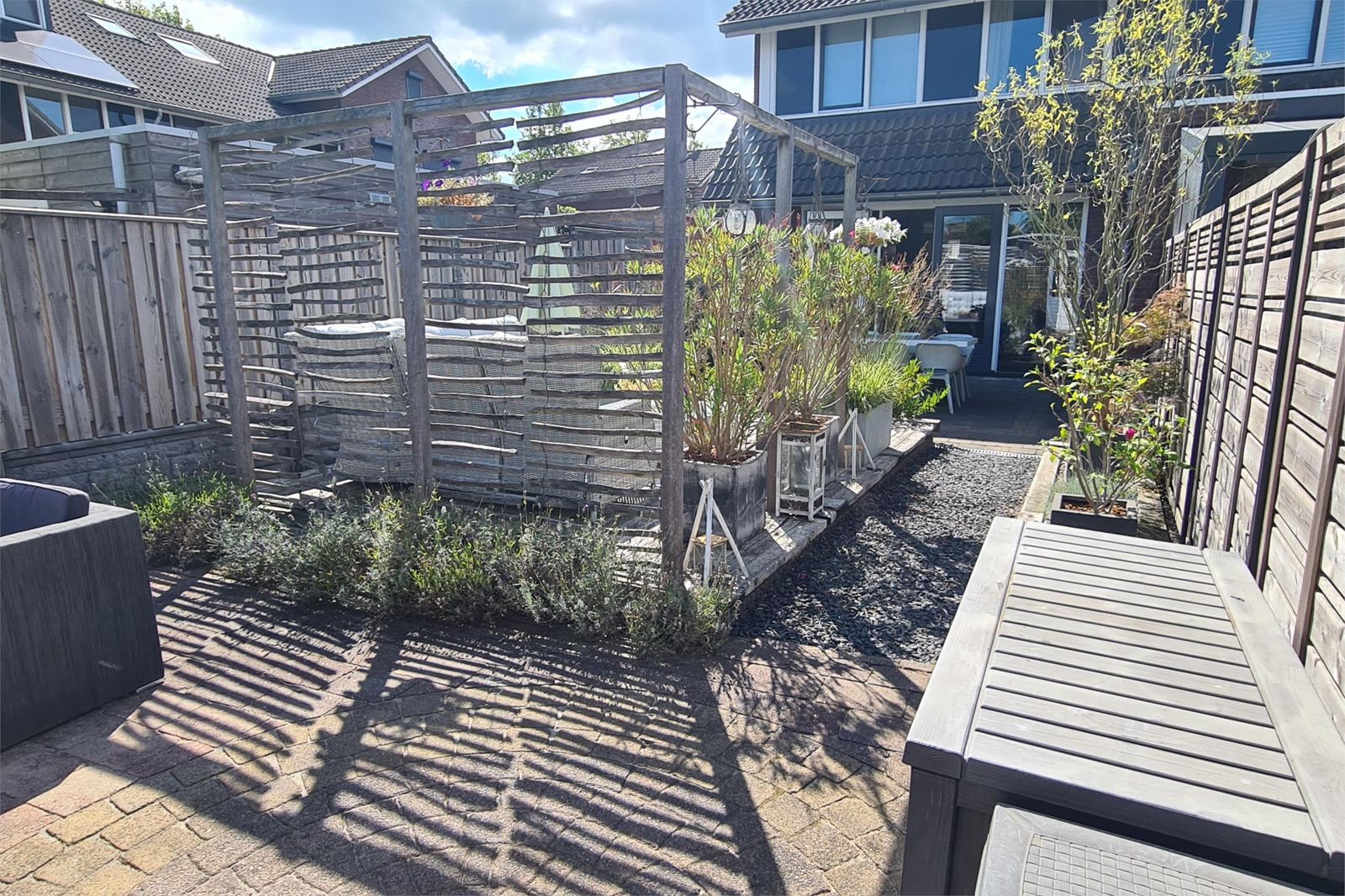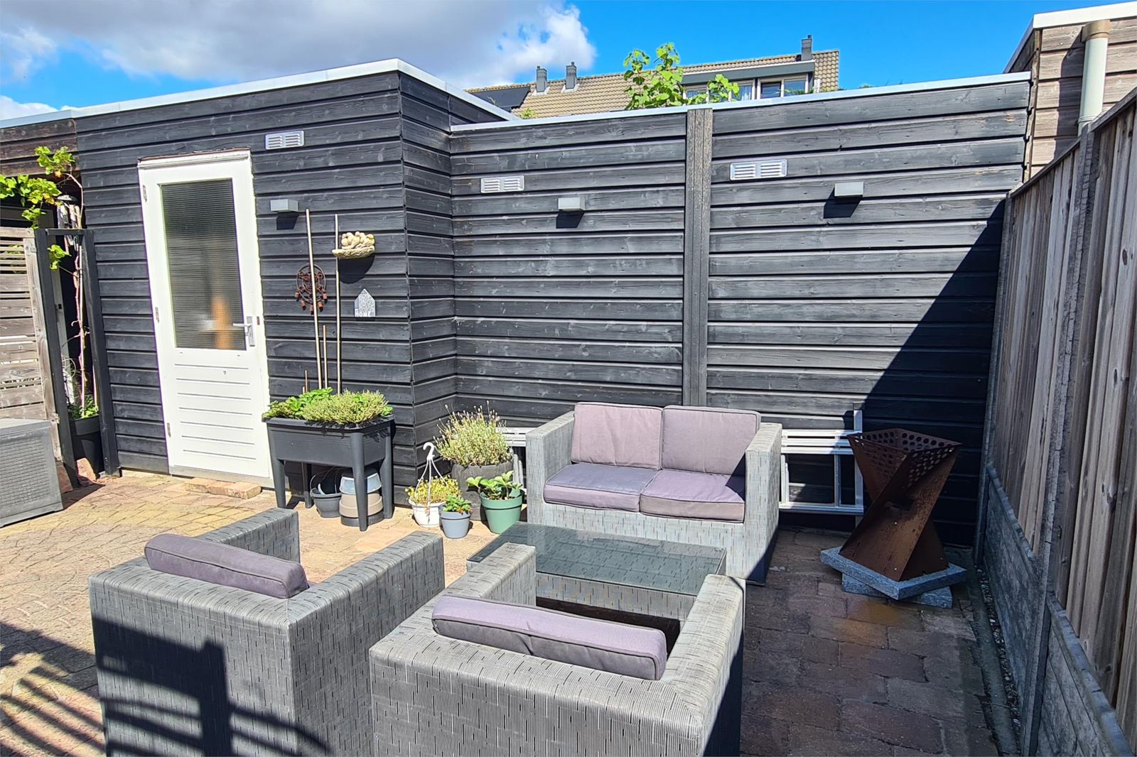 De tuin heeft maar liefst drie terrassen, waaronder een ruim terras in het midden op houten vlonderdelen. Dit centrale terras is omringd door plantenbakken en via een grindpad loop je door naar het achtergelegen terras en de houten berging van ca.17m², voorzien van elektra.