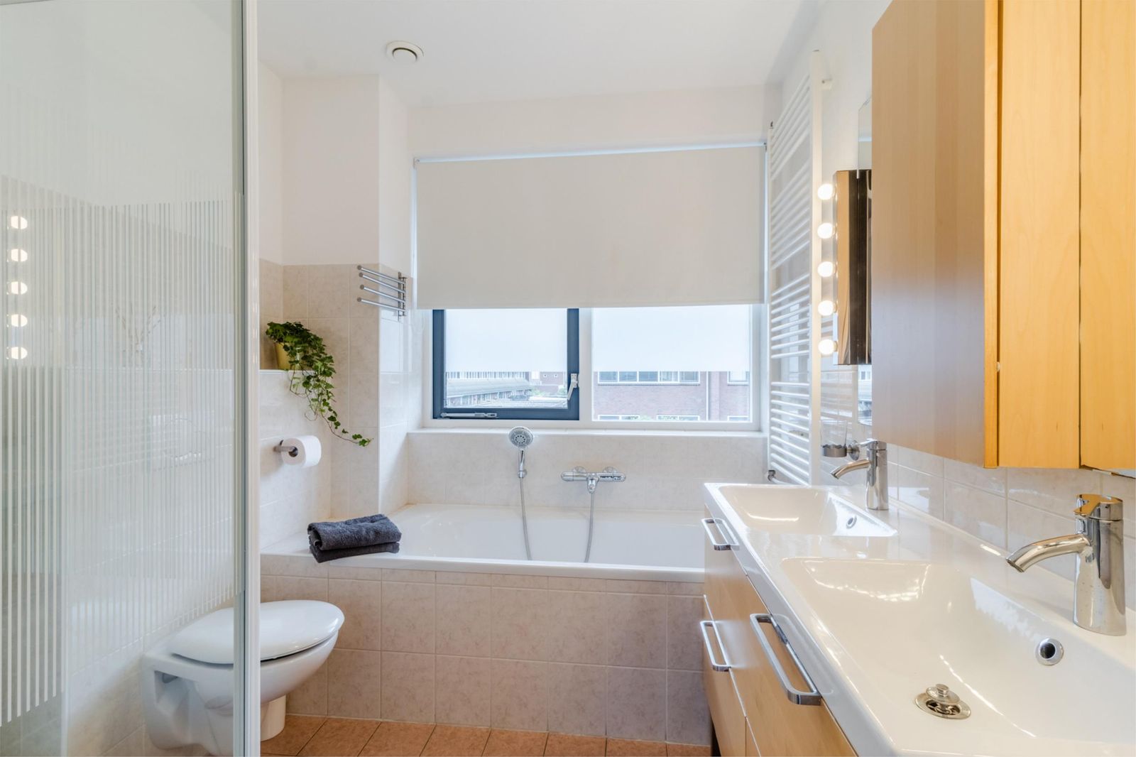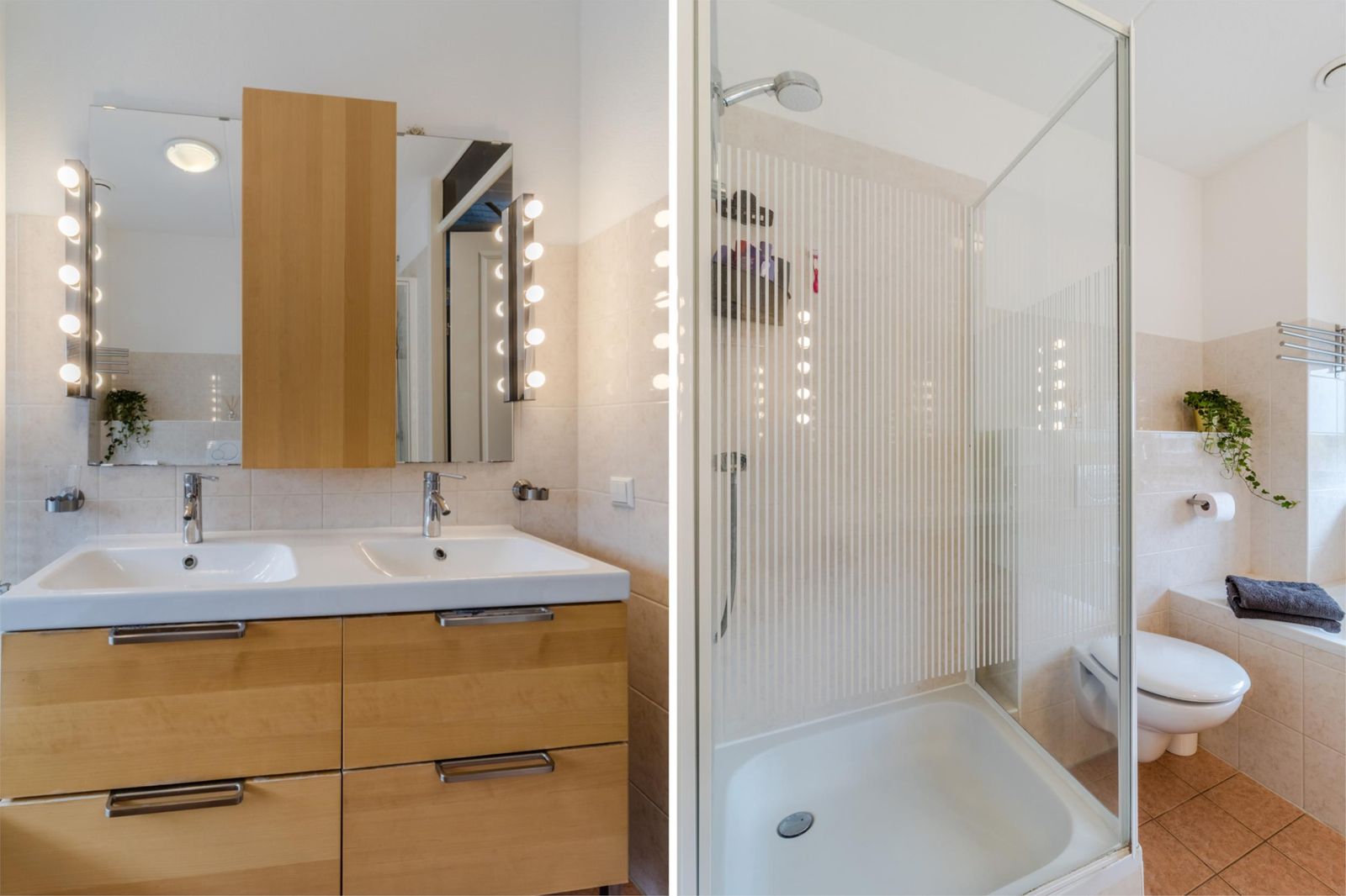 De badkamer is licht en royaal, volledig betegeld in een tijdloze stijl. Je vindt er een ligbad om heerlijk te ontspannen, een ruime douchecabine, een tweede toilet en een dubbele wastafel met stijlvol meubel en handige opbergruimte in de bovenkastjes.