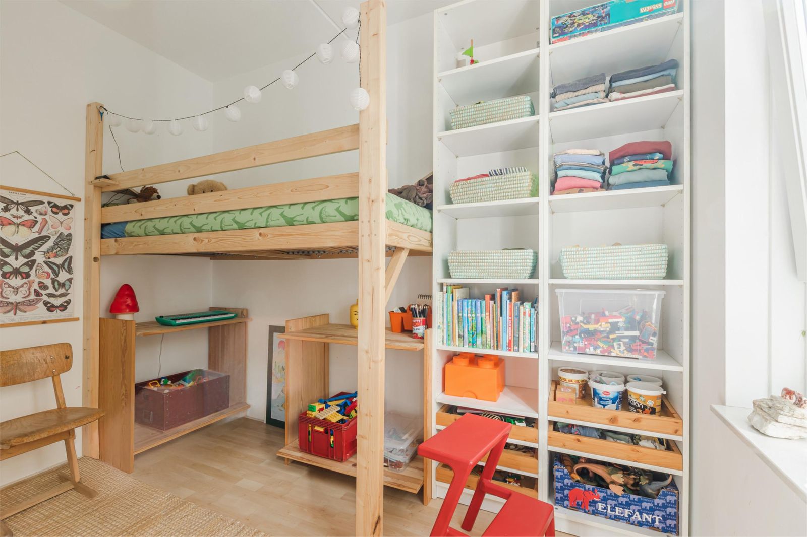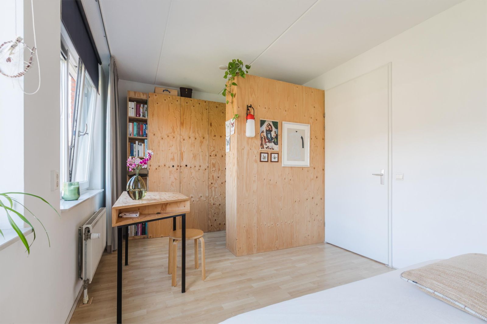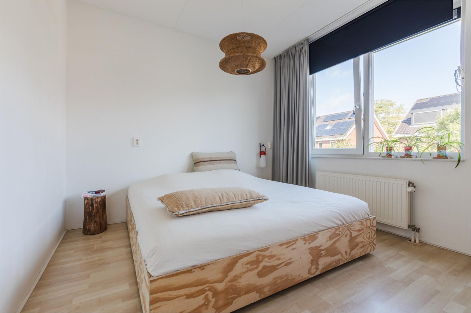 Tussen de woonkamer en de keuken bevindt zich een dichte houten trap naar boven. Vanuit de lichte overloop is aan de rechter kant een ruime slaapkamer gesitueerd. De op het noorden gelegen lichte en ruim opgezette kamer met inloopkast blijft ‘s zomers heerlijk koel. Er is voldoende ruimte voor een twee persoons bed en de houten kastenwand geeft veel opbergmogelijkheden. De kamer heeft zicht op de achtertuin. Op dezelfde etage bevindt zich ook de badkamer met ligbad, douche en toilet. De ruime overloop heeft een originele en speels gecreëerde gang met aan weerszijden nog 2 (slaap)kamers met schuifdeur. De verdieping is geheel voorzien van een lichte laminaatvloer.