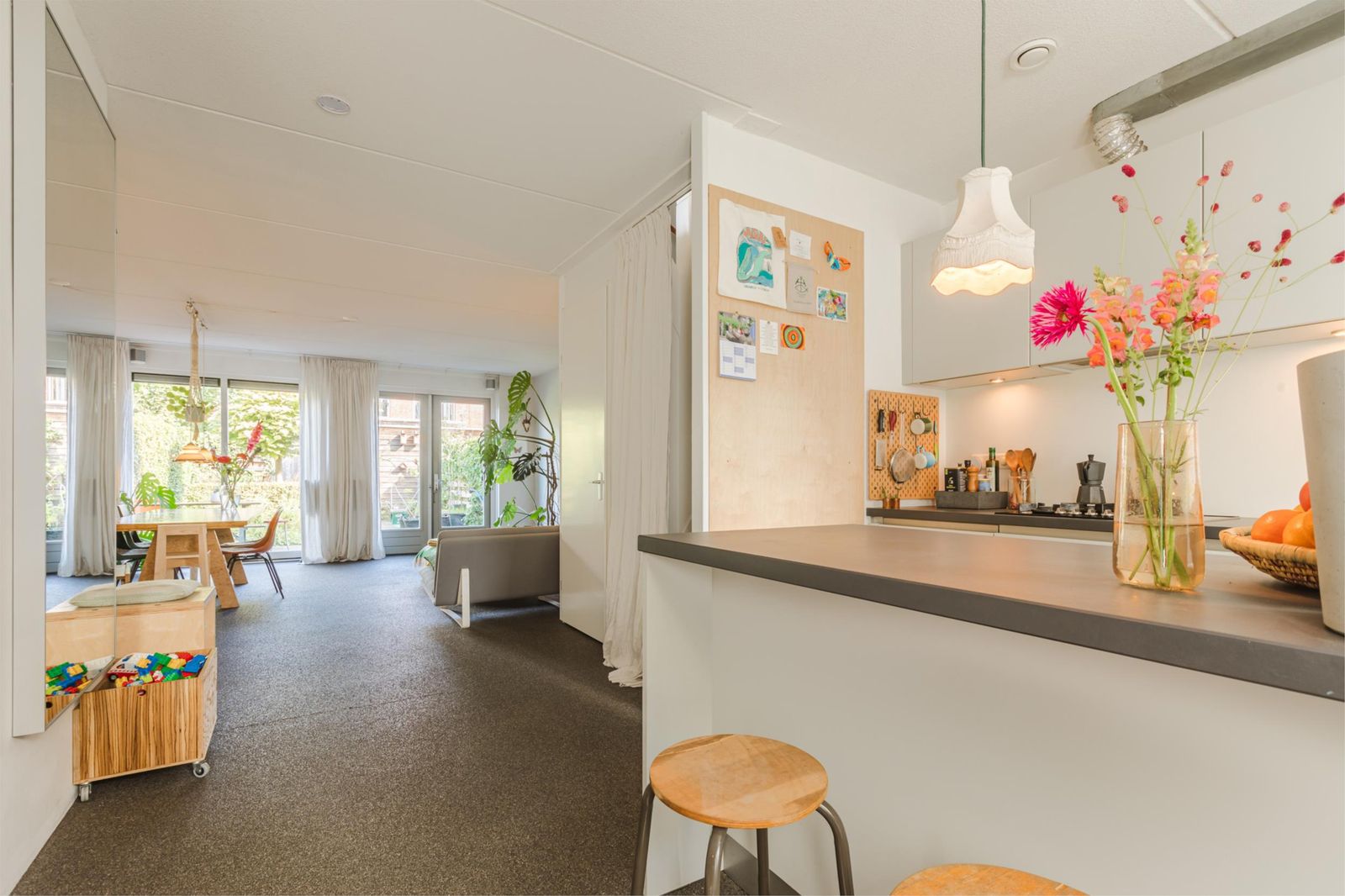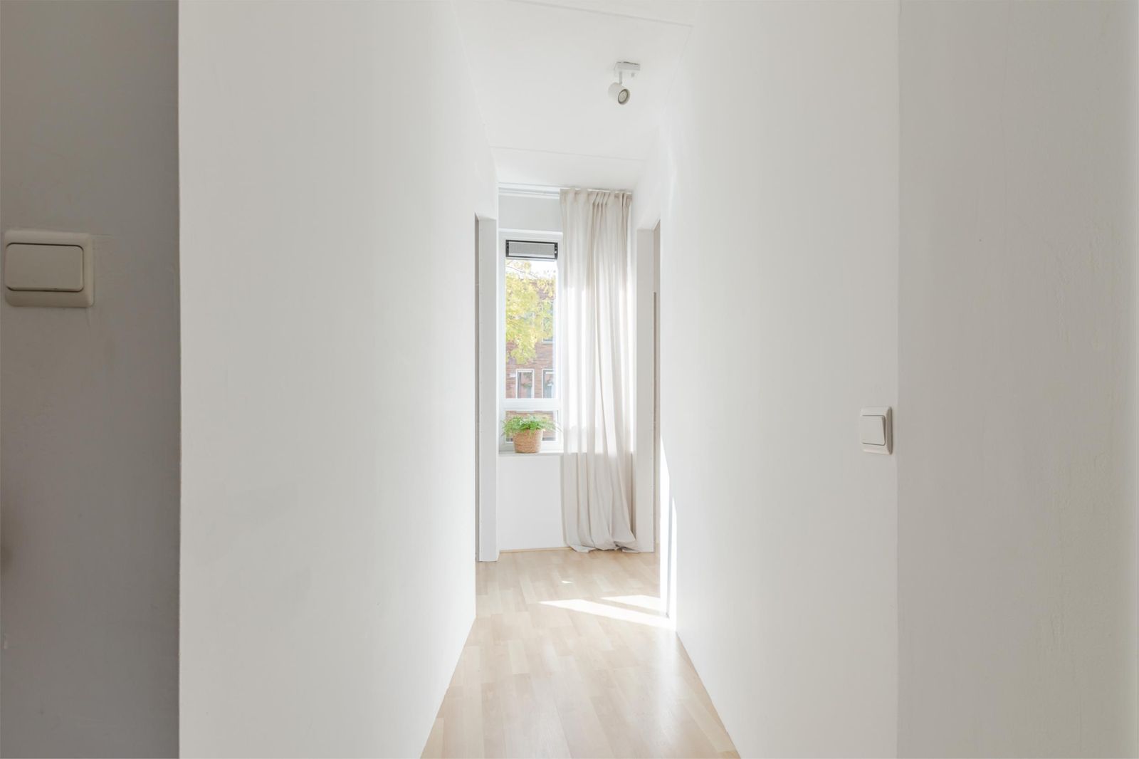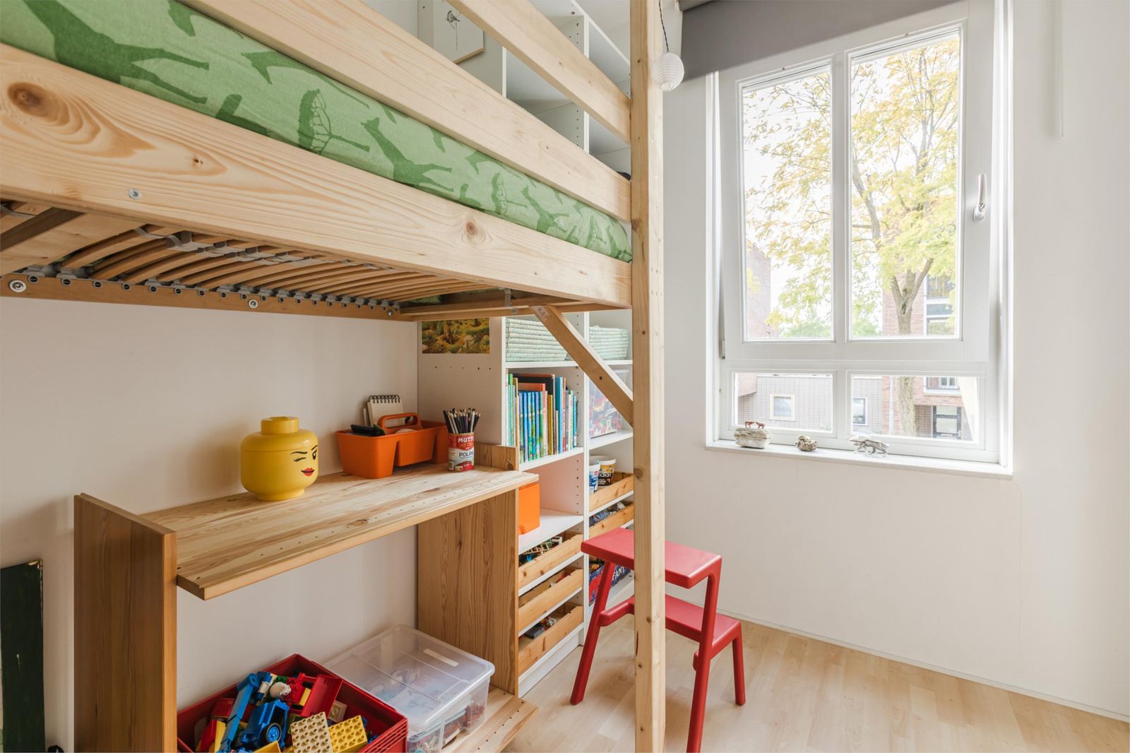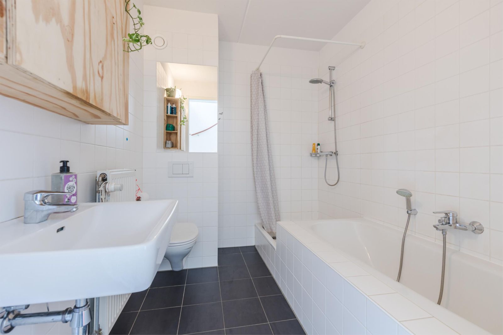 Tussen de woonkamer en de keuken bevindt zich een dichte houten trap naar boven. Vanuit de lichte overloop is aan de rechter kant een ruime slaapkamer gesitueerd. De op het noorden gelegen lichte en ruim opgezette kamer met inloopkast blijft ‘s zomers heerlijk koel. Er is voldoende ruimte voor een twee persoons bed en de houten kastenwand geeft veel opbergmogelijkheden. De kamer heeft zicht op de achtertuin. Op dezelfde etage bevindt zich ook de badkamer met ligbad, douche en toilet. De ruime overloop heeft een originele en speels gecreëerde gang met aan weerszijden nog 2 (slaap)kamers met schuifdeur. De verdieping is geheel voorzien van een lichte laminaatvloer.