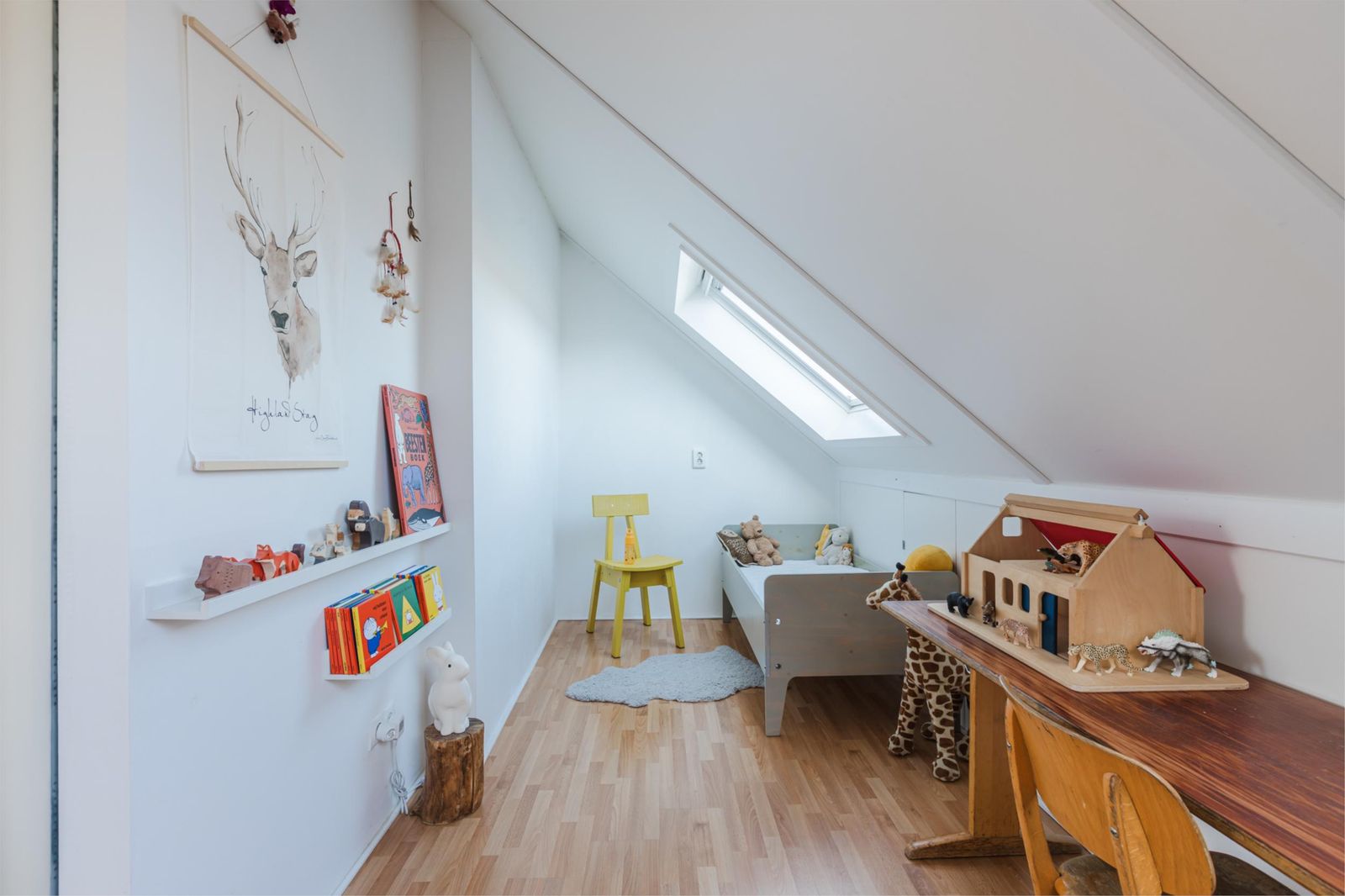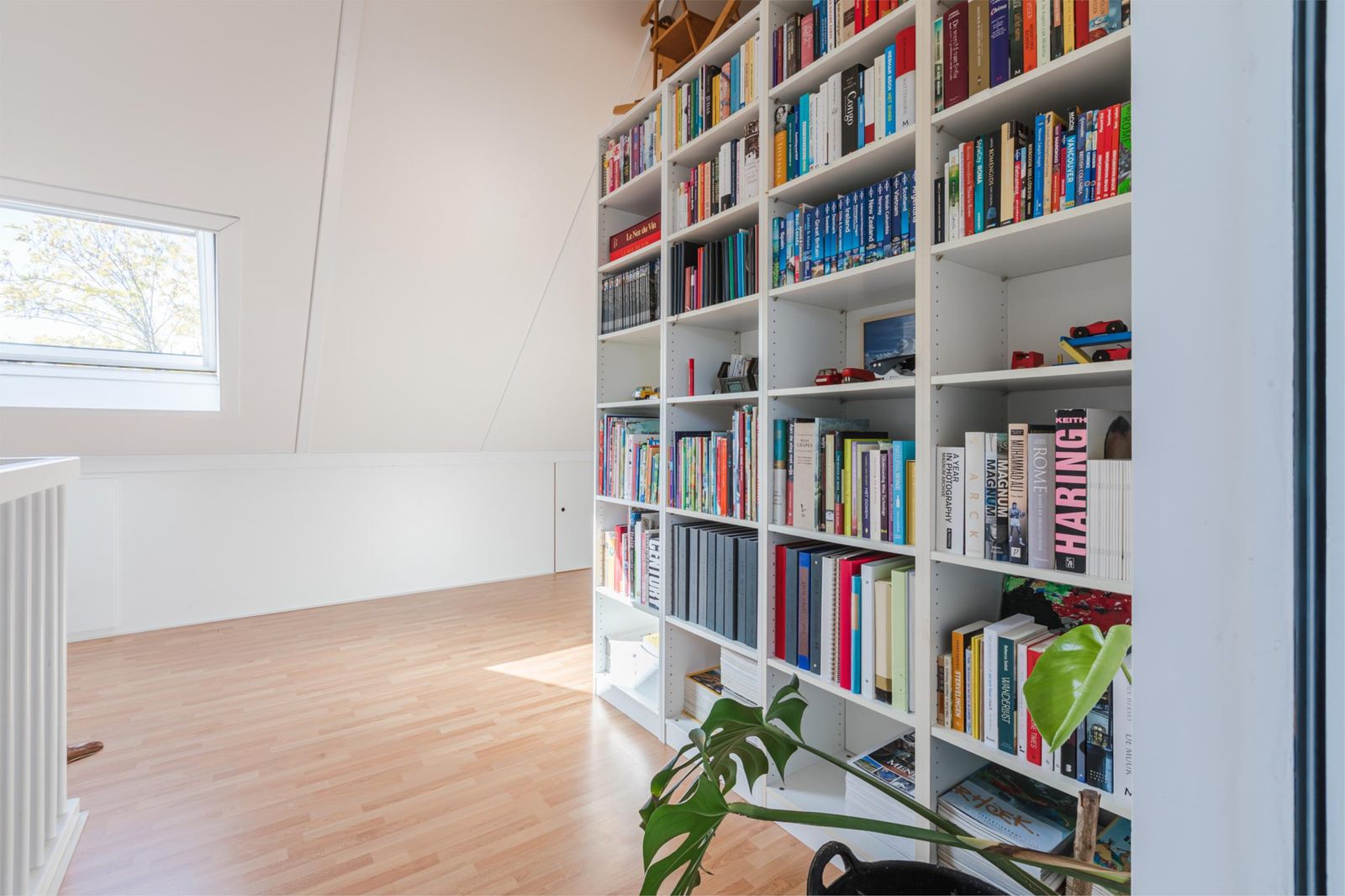 Via een open houten trap bereik je de tweede verdieping. Deze heeft een hoog schuin dak met aan zowel de noord als de zuidzijde Velux dakramen. Op zolder is een vierde slaapkamer aanwezig met glazen schuifdeur.