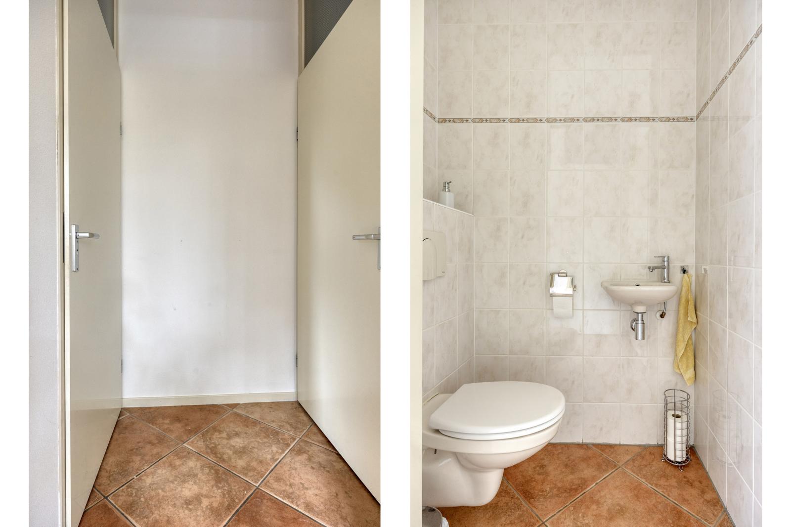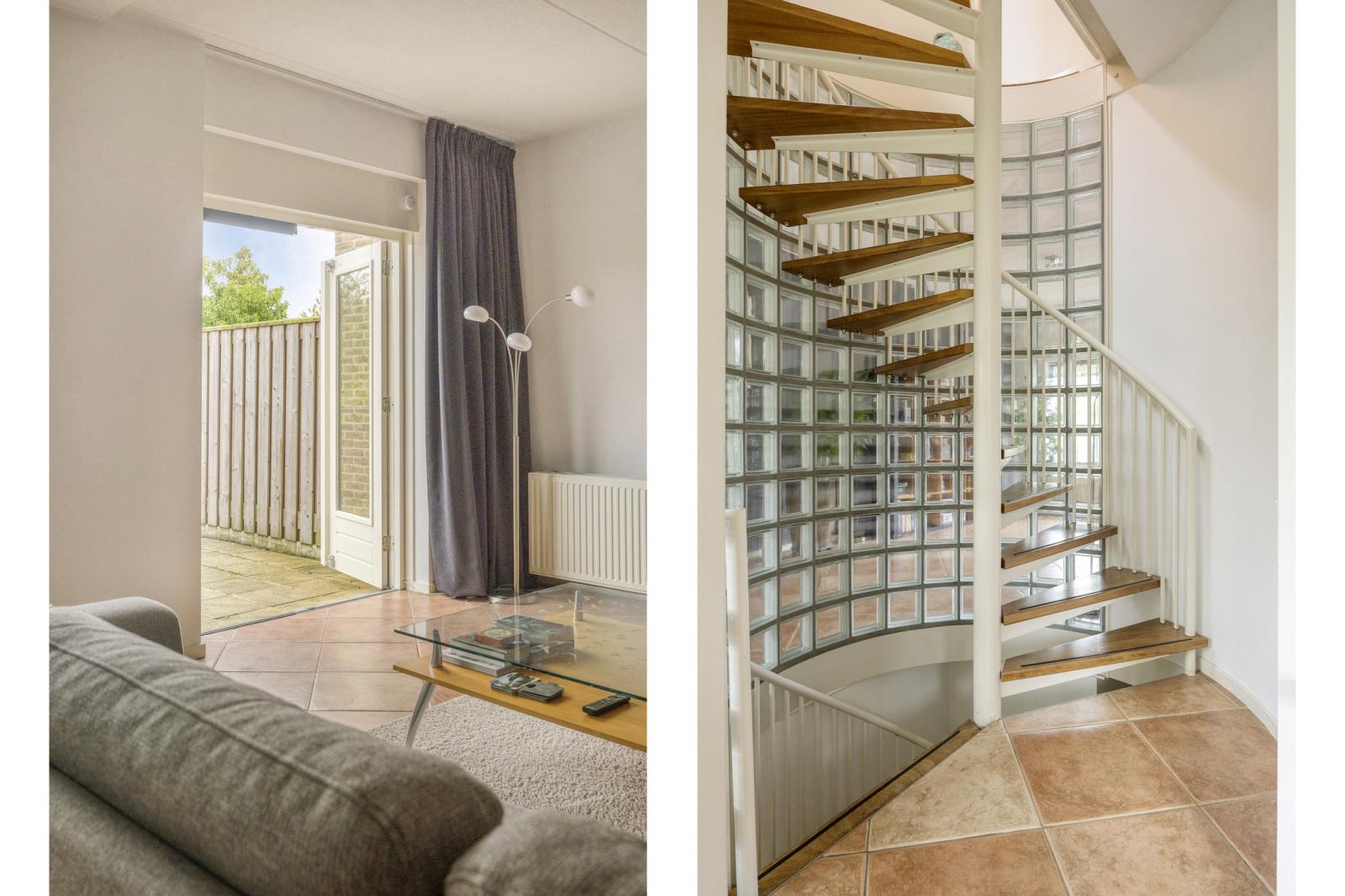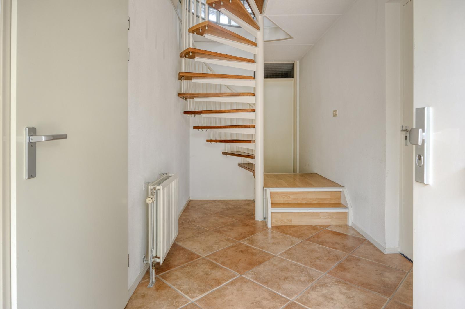 Entree, hal, garderobe, meterkast (glasvezel, 3 fasen en stadsverwarming aanwezig). Aan de linkerzijde een deur naar de kantoorruimte/slaapkamer, welke voorzien is een laminaatvloer en een raam voor natuurlijke lichtinval. Rechts een deur naar de garage, welke voorzien is van een handmatige garagedeur. De speelse wenteltrap naar eerste verdieping bevindt zich in het midden van de hal met daarachter nog een waskamer.