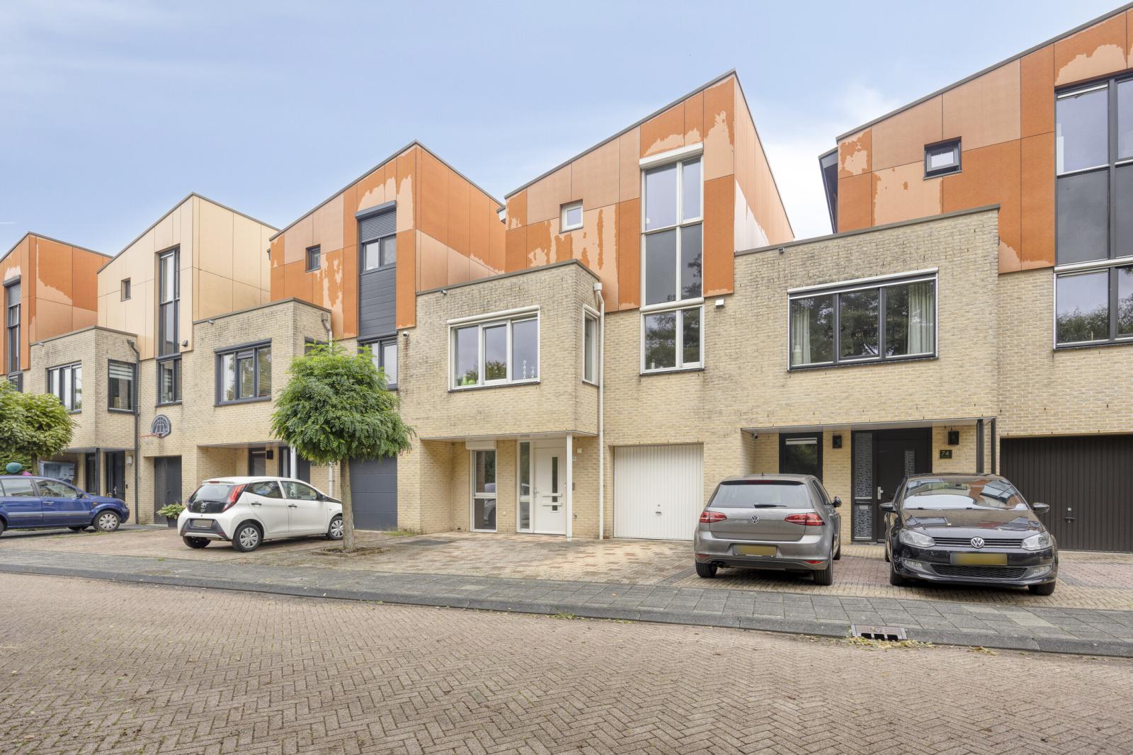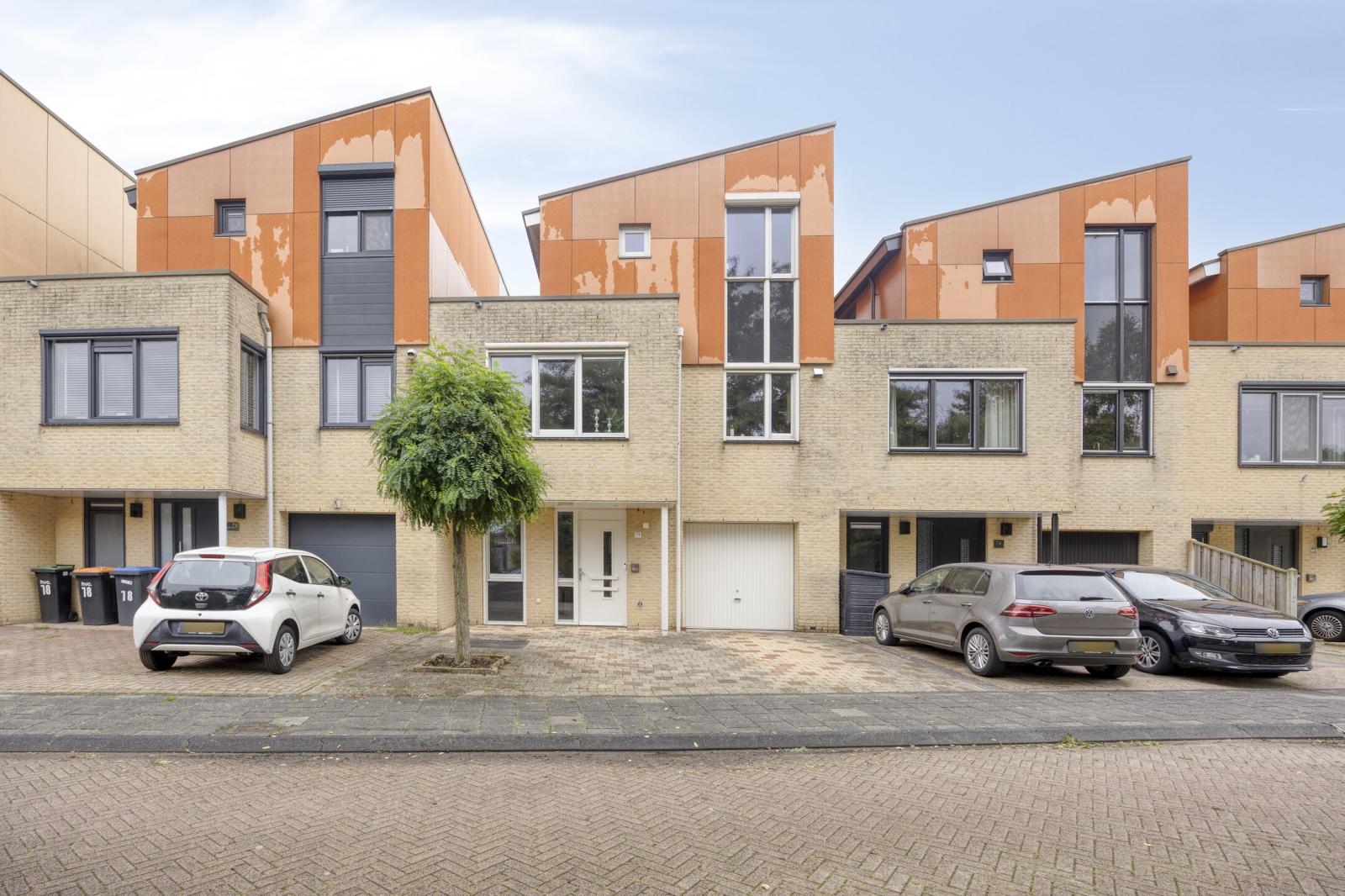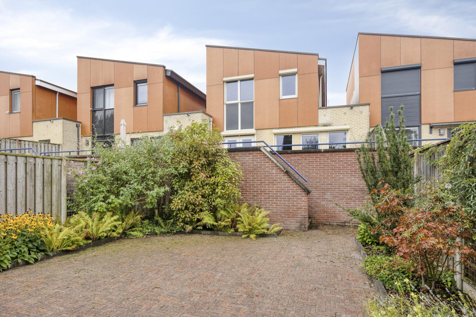 Deze fraaie geschakelde eengezinswoning is prachtig gelegen met uitzicht op groen en water en staat op een ruime kavel van 227 m2 eigen grond. De woning heeft een speelse indeling en is op de begane grond voorzien van een garage, een wasruimte alsook een kantoorruimte. Een eigen salon of kantoor aan huis behoort hier zeker tot de mogelijkheden. De eerste verdieping (voorzien van vloerverwarming ) beschikt aan de voorzijde over een ruime keuken, welke van alle gemakken is voorzien, en een eetgedeelte. Aan de achterzijde bevindt zicht de ruime, lichte woonkamer met dubbele openslaande deuren naar het royale terras met tevens een trap naar de extra tuin op de begane grond. De tuin en het terras zijn op het noordoosten gelegen. De tweede verdieping bereikt u via een speelse wenteltrap omringd door glazen bouwblokken. Deze verdieping telt 3 ruime slaapkamers en de royale badkamer. Parkeren kunt u op eigen terrein met 2 auto's.