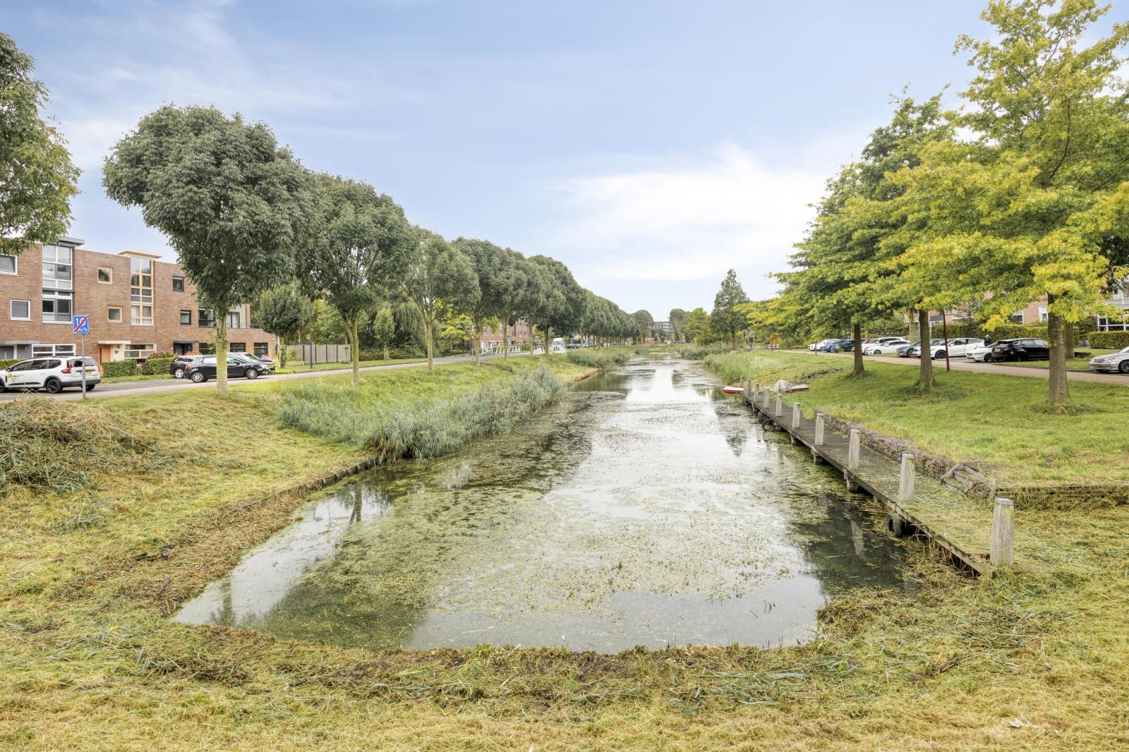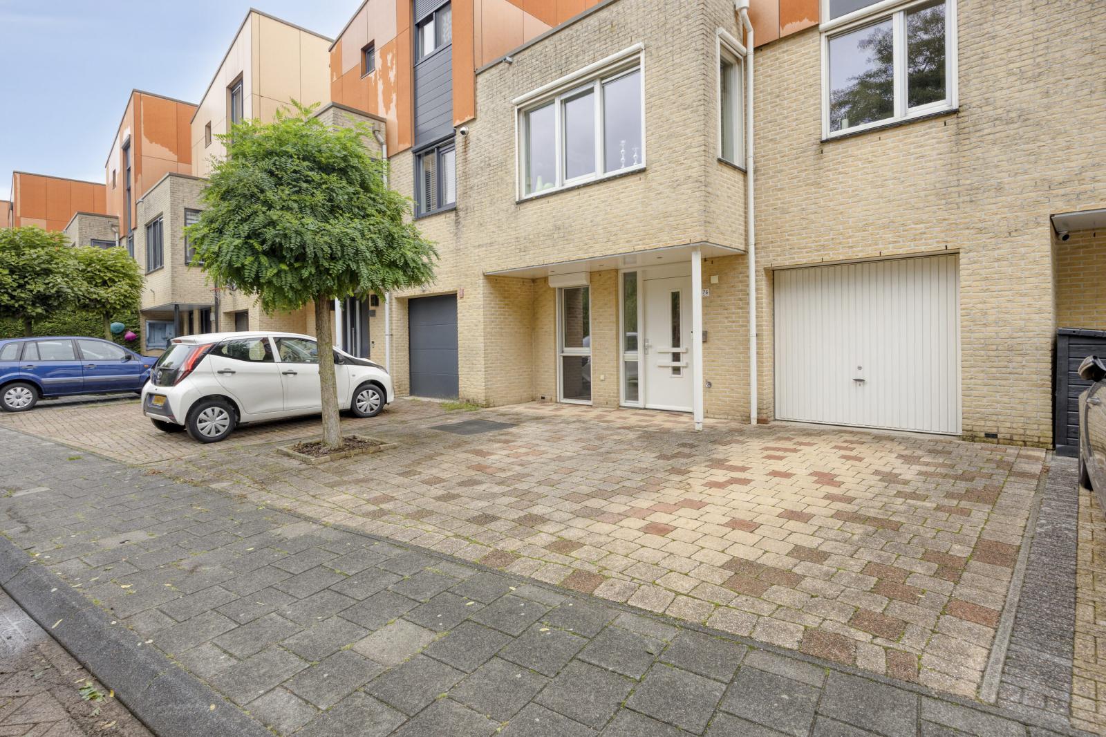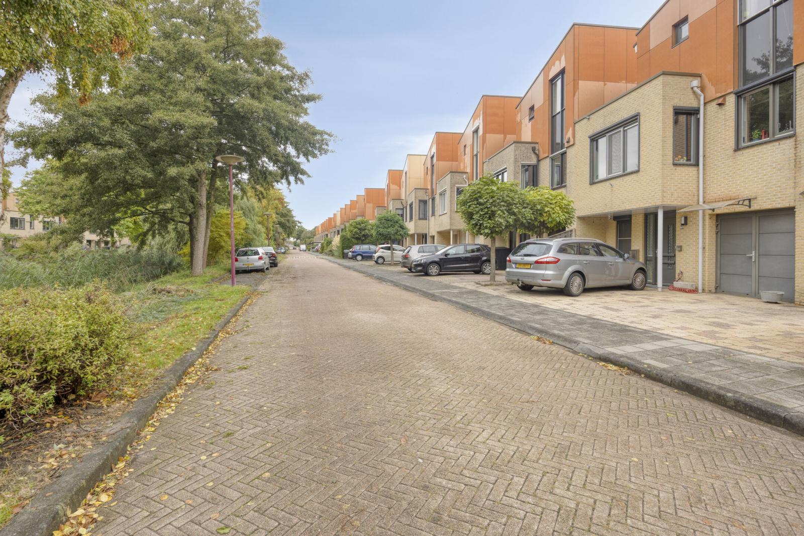 Deze fraaie geschakelde eengezinswoning is prachtig gelegen met uitzicht op groen en water en staat op een ruime kavel van 227 m2 eigen grond. De woning heeft een speelse indeling en is op de begane grond voorzien van een garage, een wasruimte alsook een kantoorruimte. Een eigen salon of kantoor aan huis behoort hier zeker tot de mogelijkheden. De eerste verdieping (voorzien van vloerverwarming ) beschikt aan de voorzijde over een ruime keuken, welke van alle gemakken is voorzien, en een eetgedeelte. Aan de achterzijde bevindt zicht de ruime, lichte woonkamer met dubbele openslaande deuren naar het royale terras met tevens een trap naar de extra tuin op de begane grond. De tuin en het terras zijn op het noordoosten gelegen. De tweede verdieping bereikt u via een speelse wenteltrap omringd door glazen bouwblokken. Deze verdieping telt 3 ruime slaapkamers en de royale badkamer. Parkeren kunt u op eigen terrein met 2 auto's.