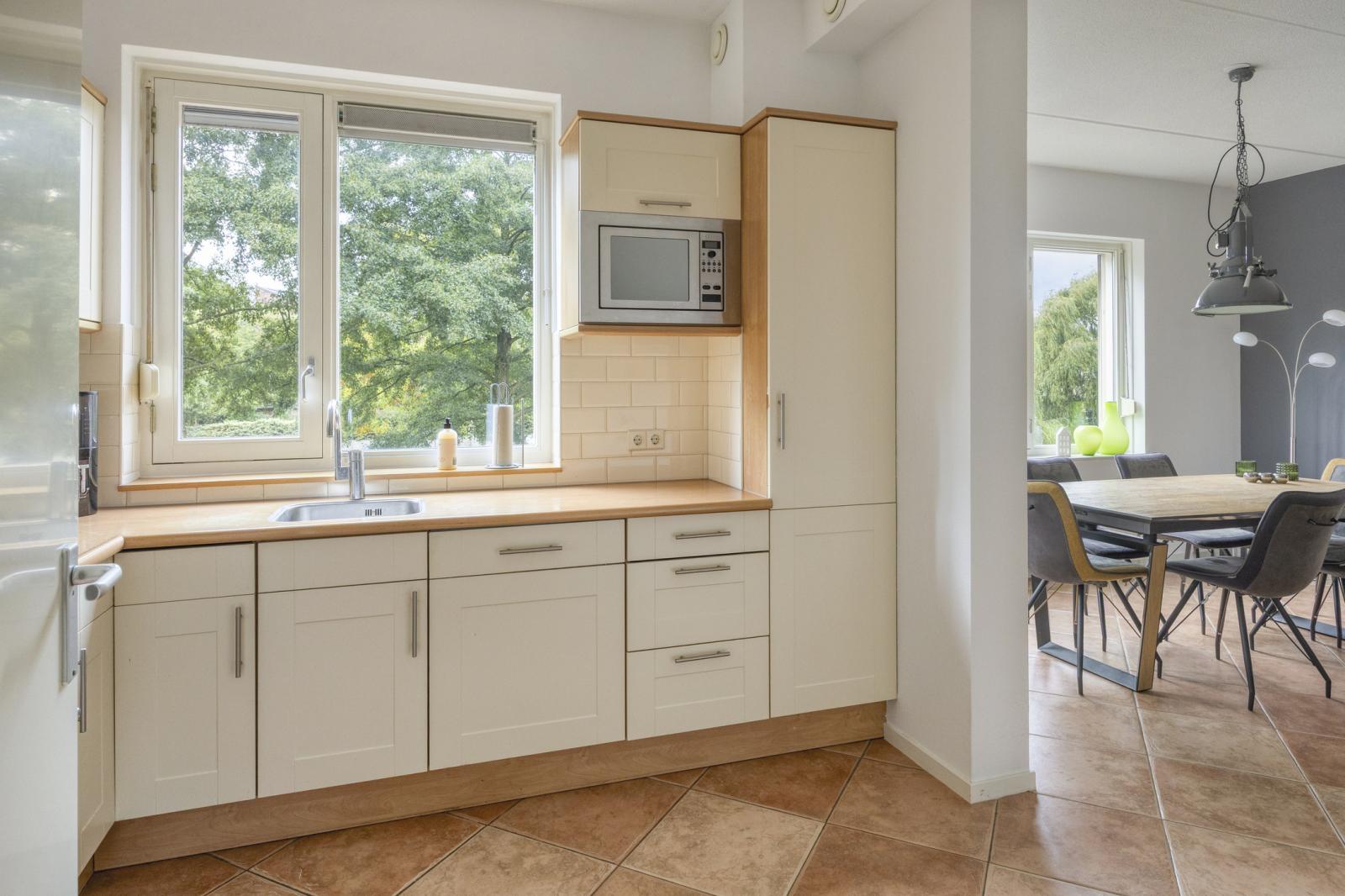 Aan de voorzijde van de woning bevindt zich het eetgedeelte en de keuken, welke voorzien is van een vaatwasser, inductie kookplaat, afzuigkap, combi oven/magnetron, extra magnetron en een koel-vries combinatie. Via een deur in de keuken bereikt u een hal met aansluitend een bergkast en de toiletruimte met hangcloset en fonteintje. Aan de achterzijde bevindt zich de ruime woonkamer met dubbel openslaande deuren naar het terras met lager gelegen tuin. Via de wenteltrap bereikt u de tweede verdieping.