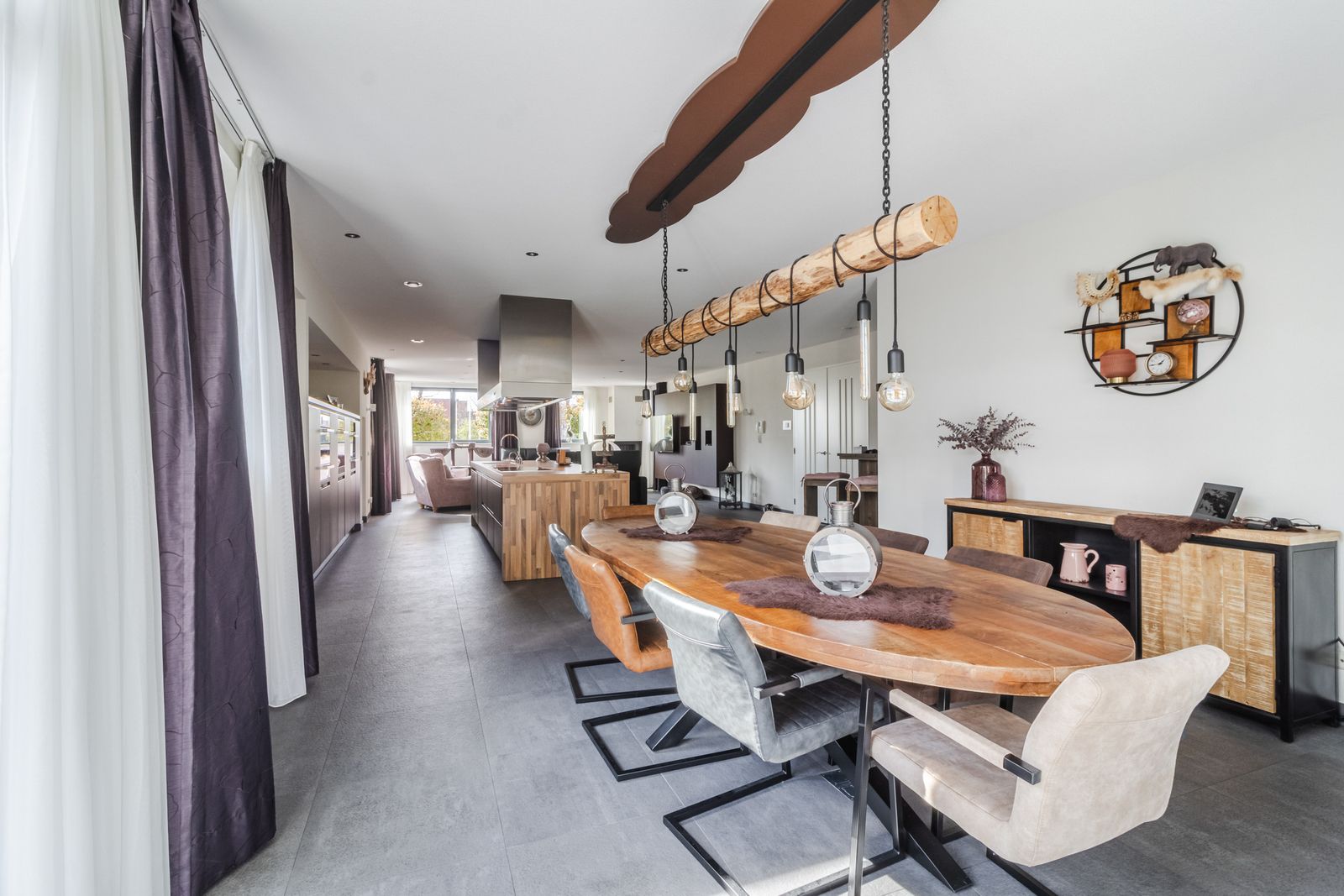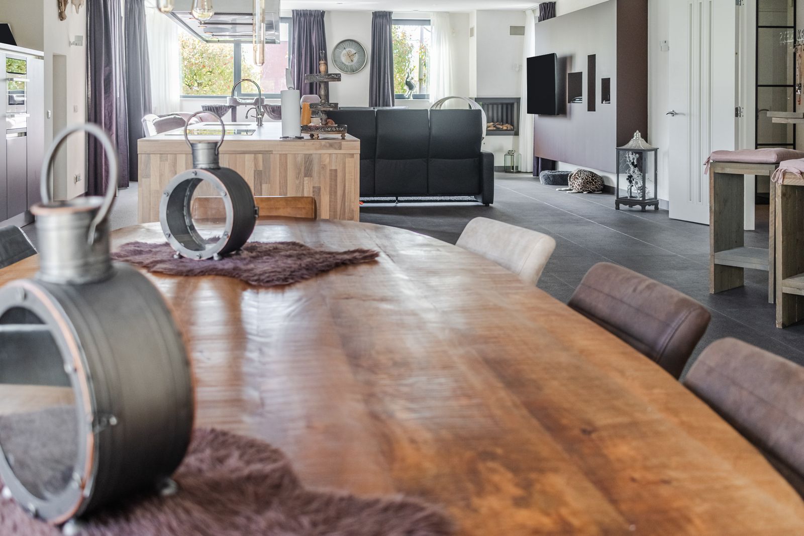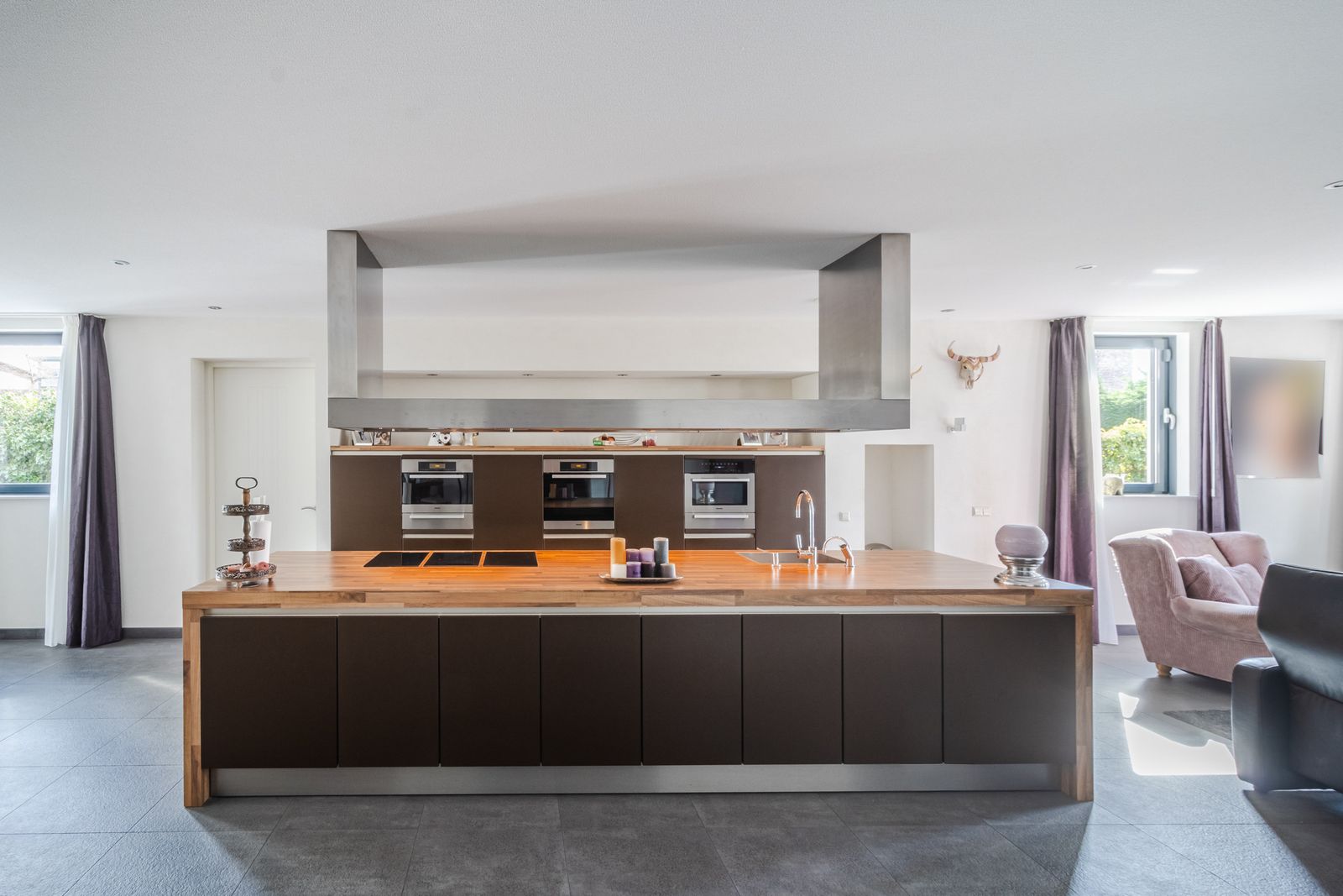 * luxe open keuken met kookeiland en inbouwapparatuur;
