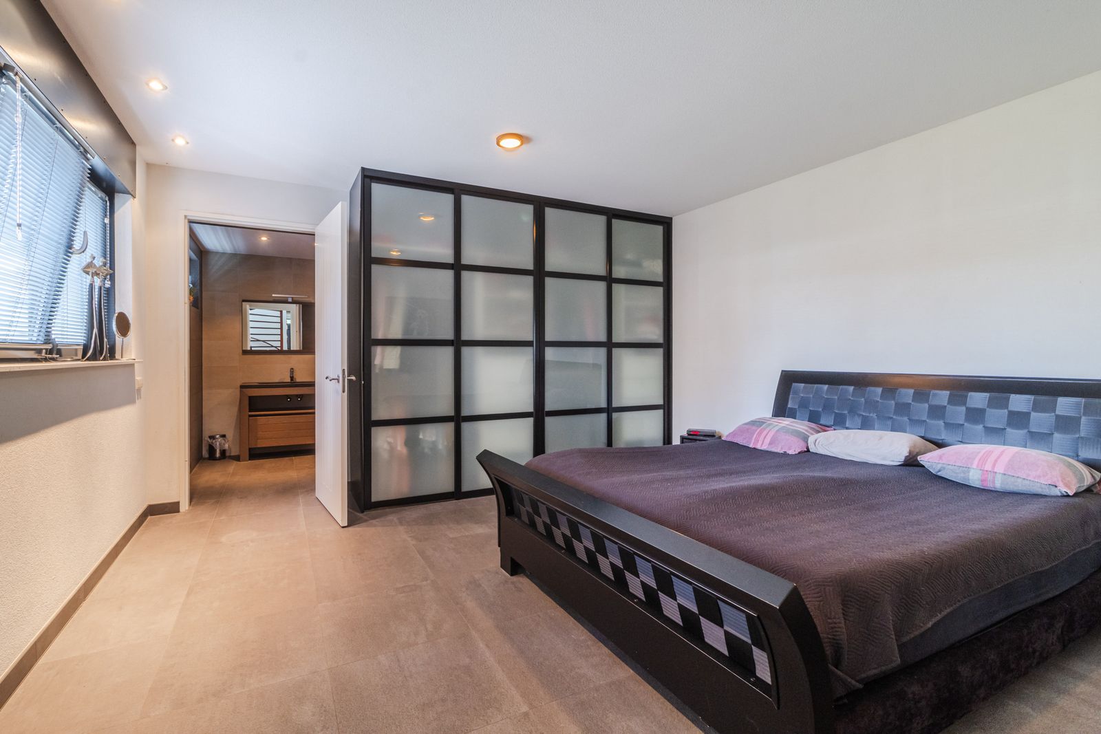 Slaapkamer (1) met badkamer en-suite voorzien van inloopdouche en dubbele wastafel.