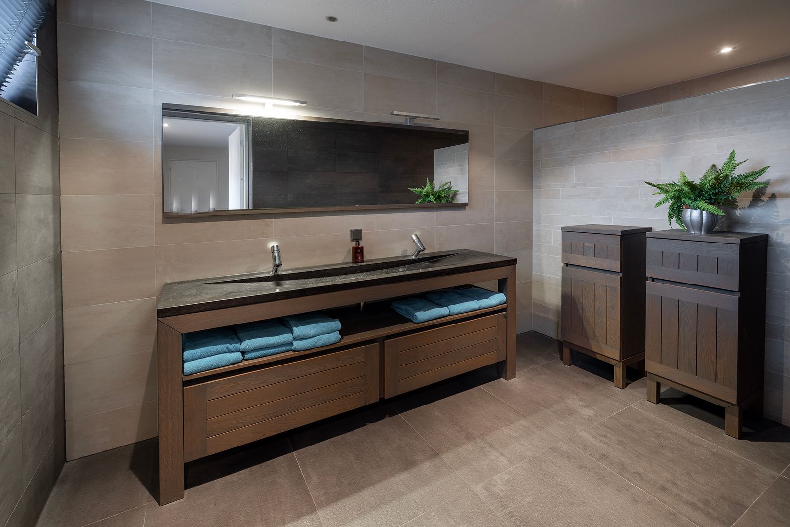 Badkamer met inloopdouche en dubbele wastafel