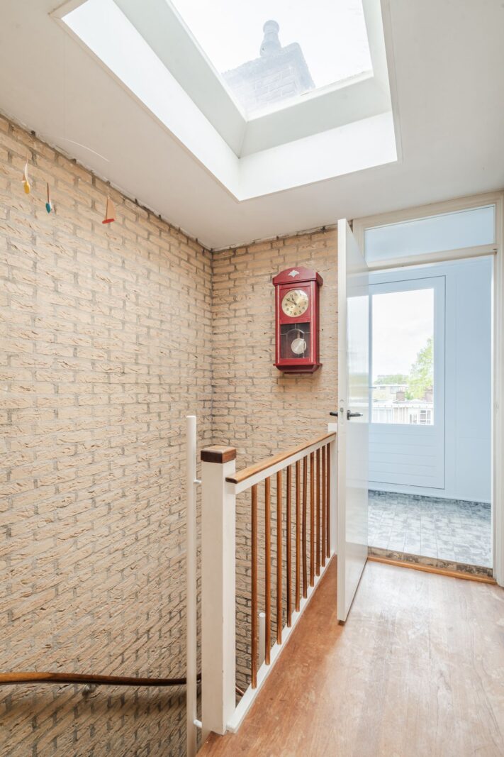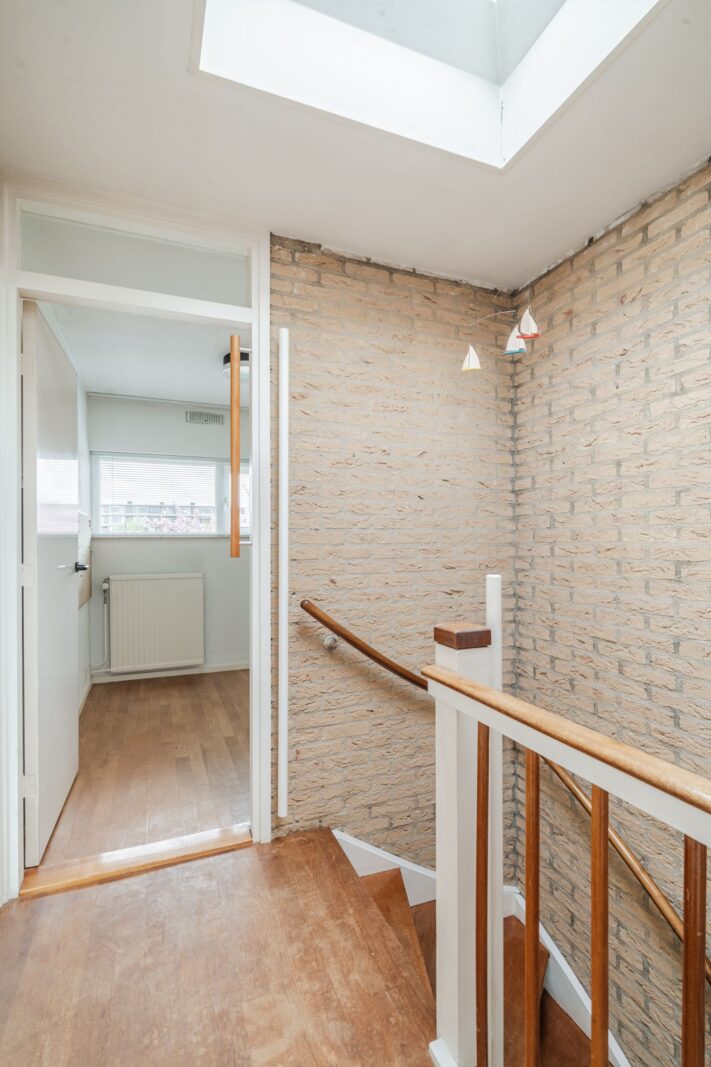 Op de tweede verdieping vind je een overloop met dakraam met toegang tot 2 slaapkamers en een wasruimte. De grote slaapkamer (4) heeft een groot raam met uitzicht op en een deur naar het riante dakterras. Op deze verdieping vind je nog een kleine slaapkamer (5), beide slaapkamers zijn voorzien van een mooie essenhouten parketvloer. Vanuit de overloop heb je toegang tot een praktische wasruimte. Hier vind je een stortbak en de aansluiting voor de wasmachine en droger. Ook vanuit deze wasruimte is er toegang tot het dakterras. Het dakterras biedt vrij uitzicht over de wijk en is een heerlijke plek om te ontspannen, met veel privacy.