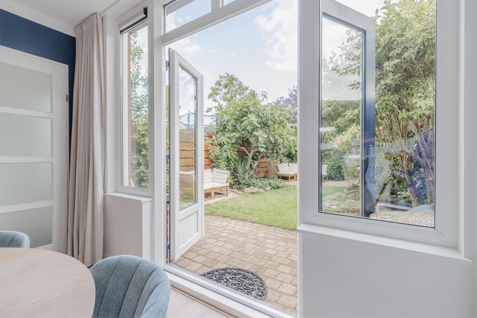 •Spacious and luminous garden-facing living room with underfloor heating, laminate flooring, smooth plastered walls/ceiling and double French doors to the garden.
