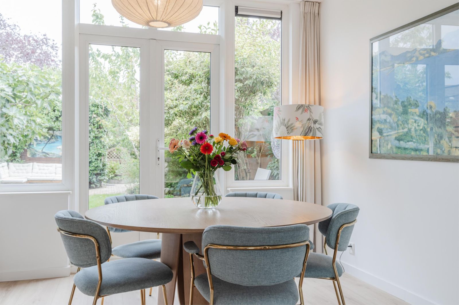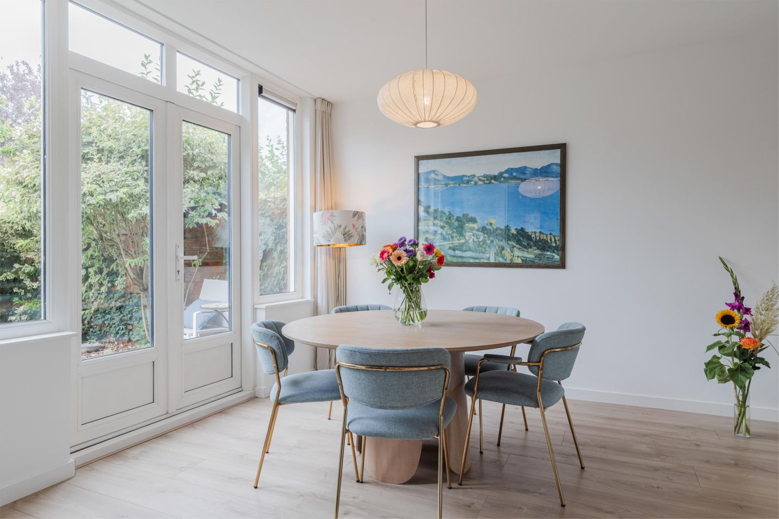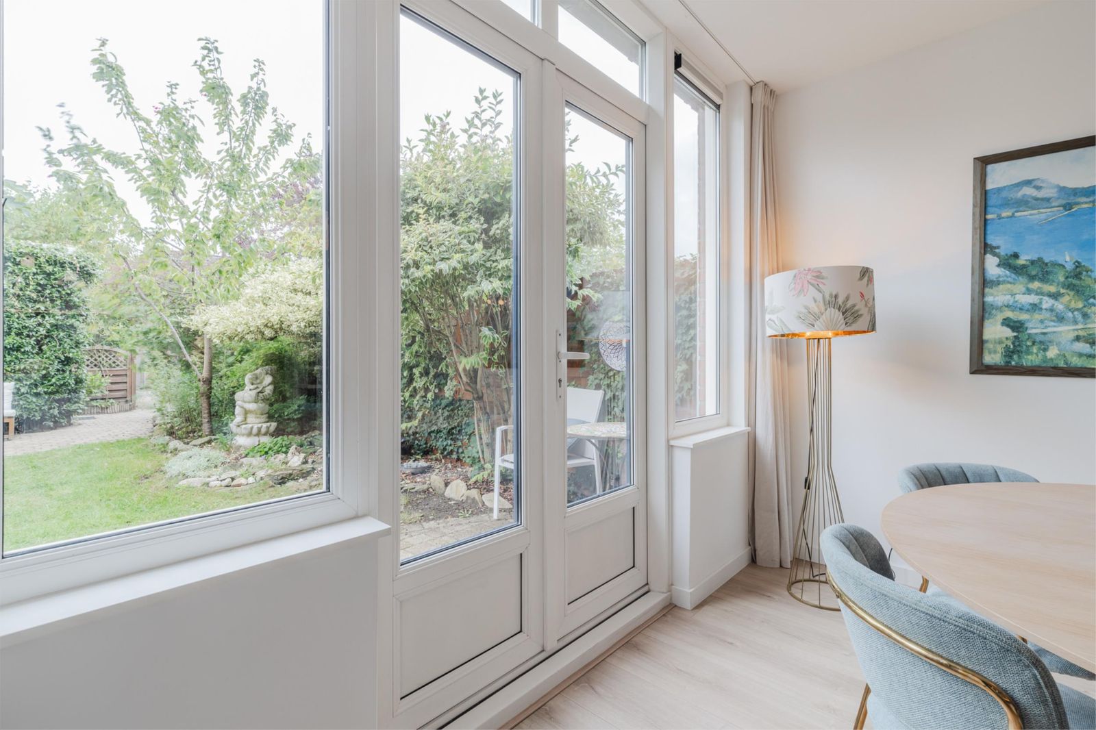 •Ruime, zonnige tuingerichte woonkamer met vloerverwarming, laminaatvloer, strak gestucte wanden/plafond en dubbele openslaande deuren naar de achtertuin.