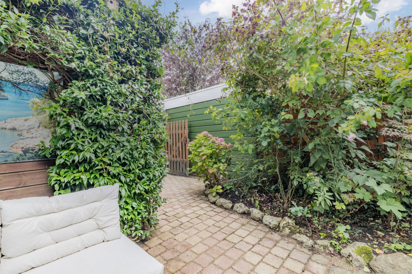 •Back garden of approx. 67 m², facing southeast, with paving, lawn, planted borders, back entrance and fencing.
