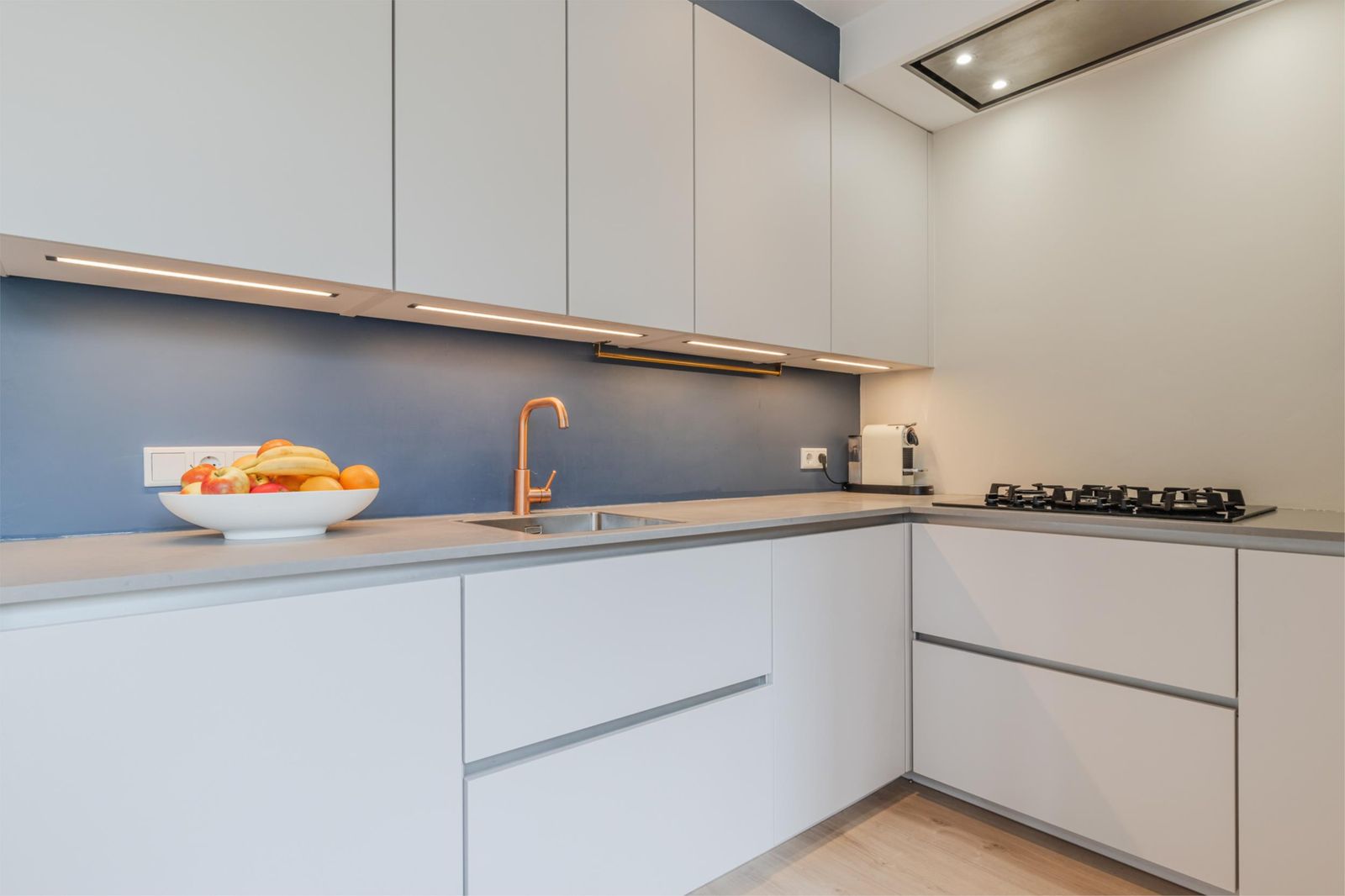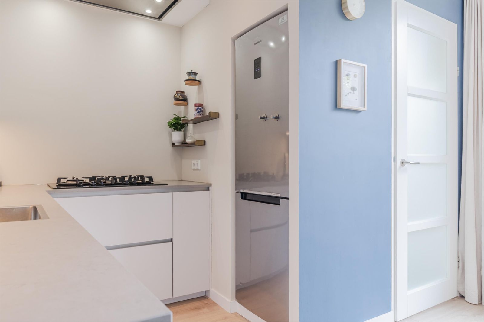 •Modern kitchen (2020) in corner arrangement with plenty of storage space, stainless steel sink and built-in appliances: 5-burner gas hob, dishwasher, fridge/freezer combination and oven (in the utility room).