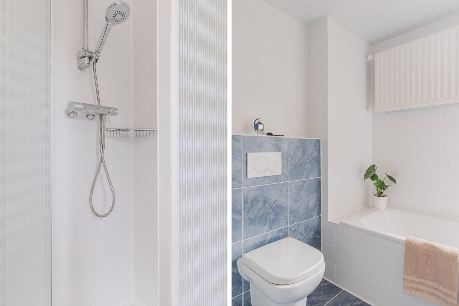 •Keurige badkamer (2010) met ligbad, douche, tweede toilet, wastafel, spiegelkast met verlichting, radiator en raam voor daglicht/ventilatie.