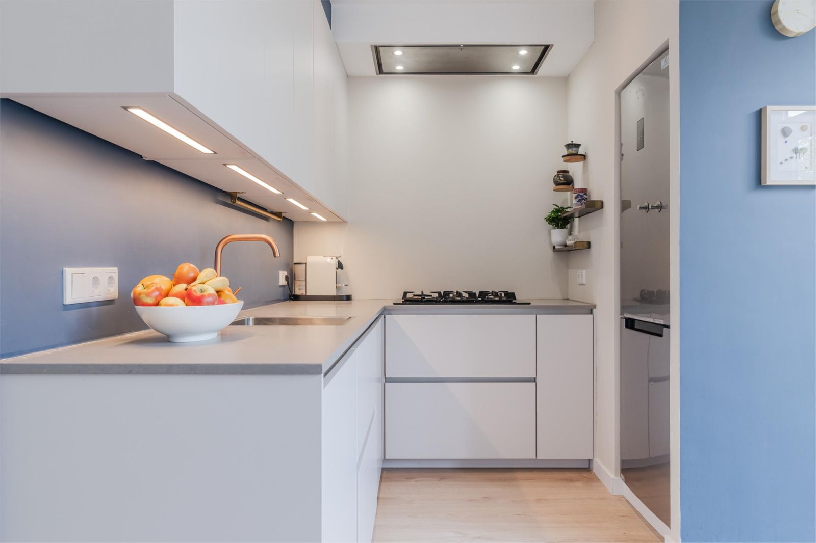 •Moderne half open keuken (2020) in hoekopstelling met veel bergruimte, RVS spoelbak en inbouwapparatuur: 5-pits gaskookplaat, vaatwasser, koel/vriescombinatie en oven (in de bijkeuken).