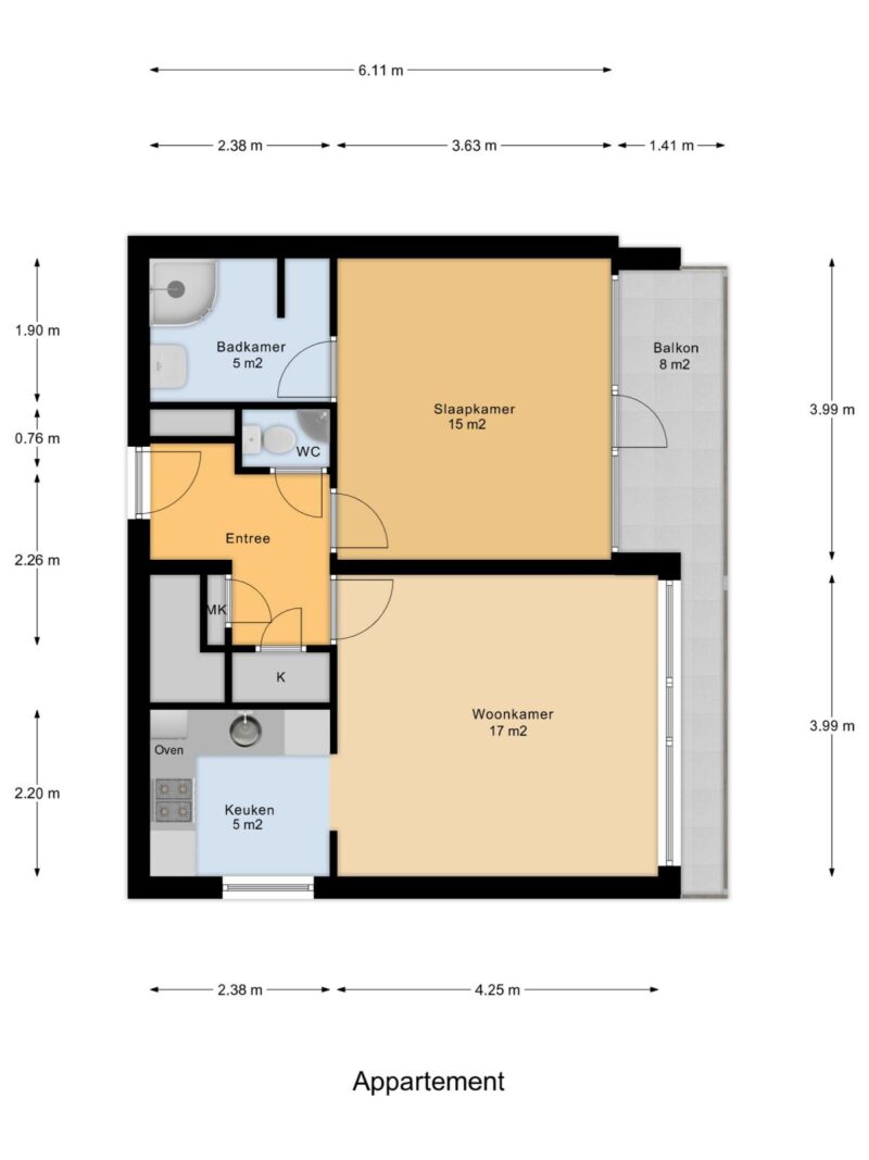 Begane grond: Afgesloten entree, brievenbussen en twee liften. Appartement: Hal, bergruimte, meterkast en modern, geheel betegeld, apart toilet met hoekfonteintje. Slaapkamer van 15 m² met toegang tot het balkon en de badkamer. Keurige lichte, geheel betegelde, badkamer met een douchecabine, wastafel en wasmachineaansluiting. Lichte woonkamer van 17 m². Open keuken met een L-vormige inbouwkeuken welke voorzien is van enkele inbouwapparatuur, te weten; - Koelkast, - 4 pits gasstel, - Afzuigkap. Door het gehele appartement ligt een laminaatvloer.