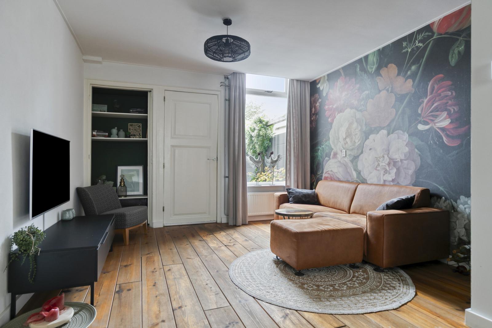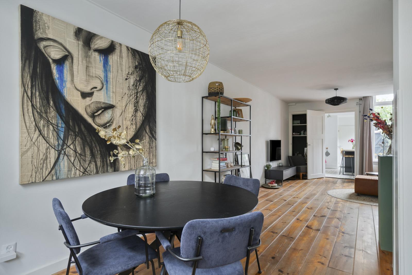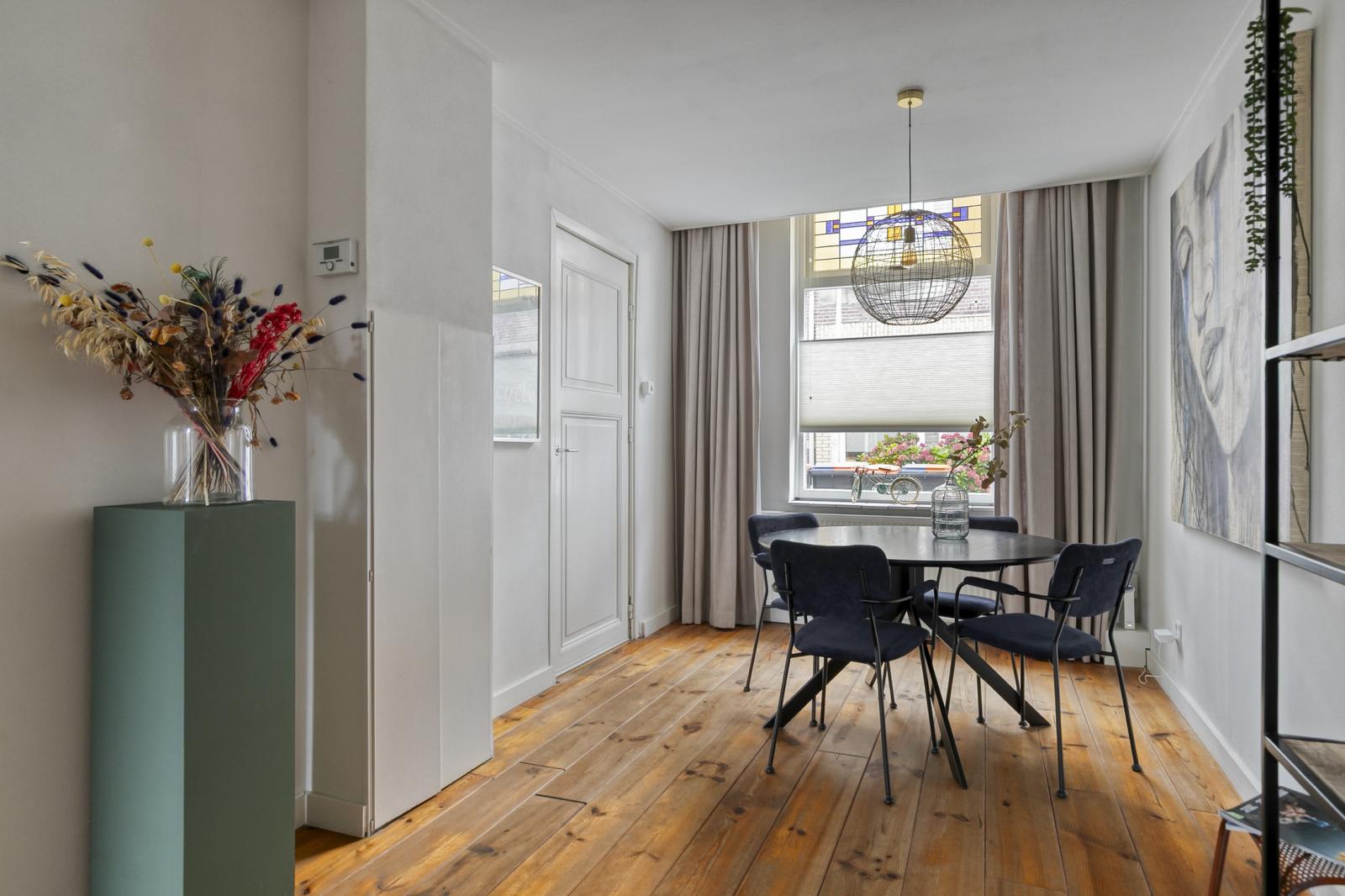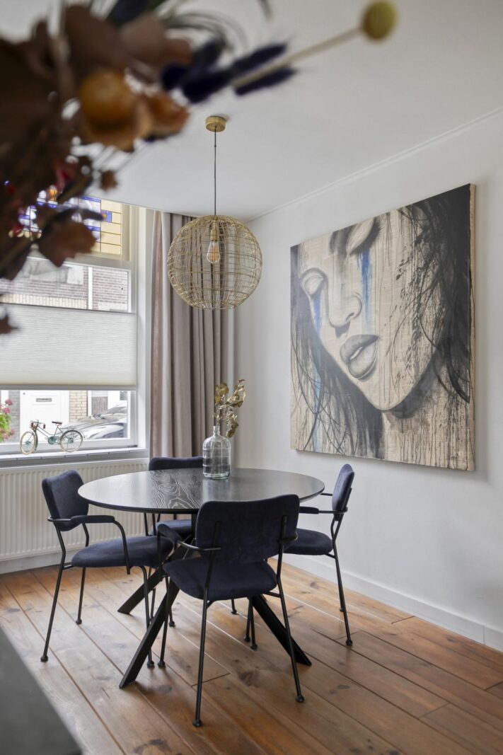 De hal met lambrisering zet de toon: verzorgd, authentiek, uitnodigend. In de woonkamer valt het licht royaal naar binnen; de houten vloer loopt mooi door en de paneeldeuren geven elke hoek karakter. Er is plek voor een lange eettafel én een knusse zithoek. Onder de trap zit een slimme bergkast voor alles wat je uit zicht wilt houden.