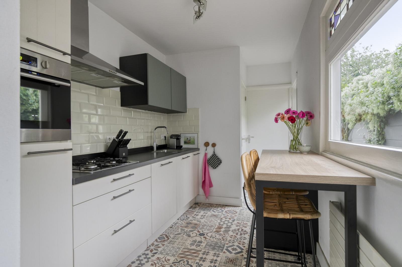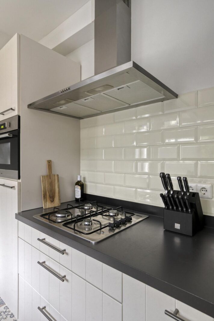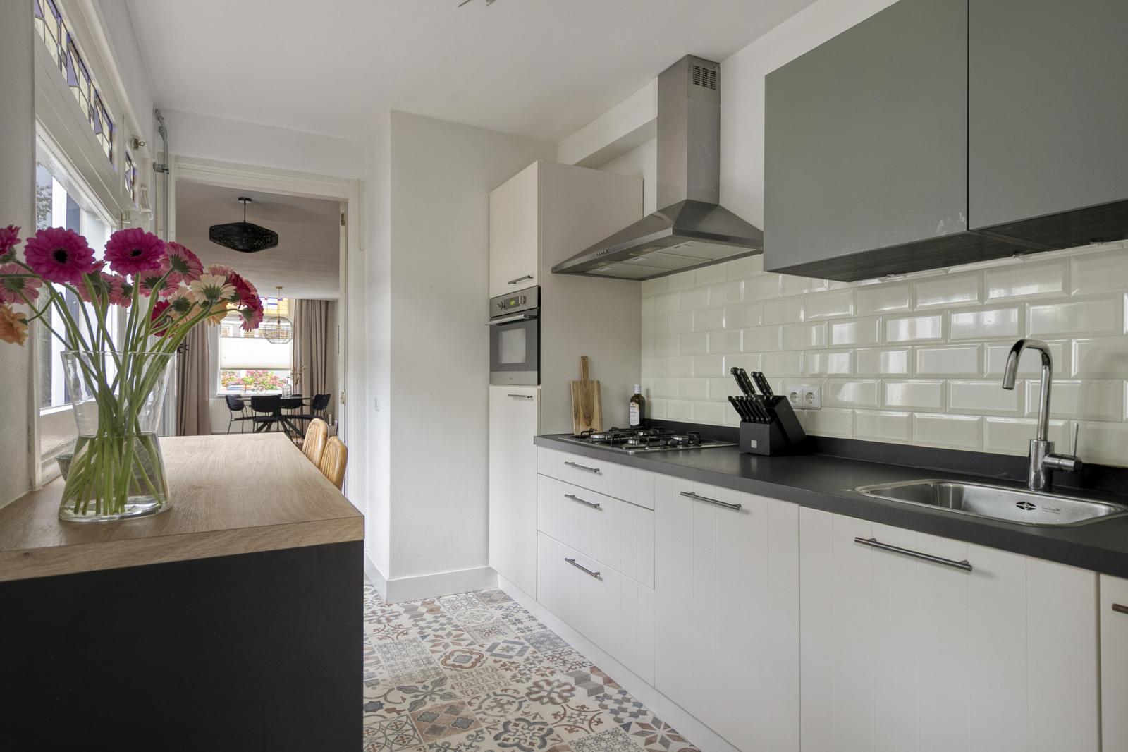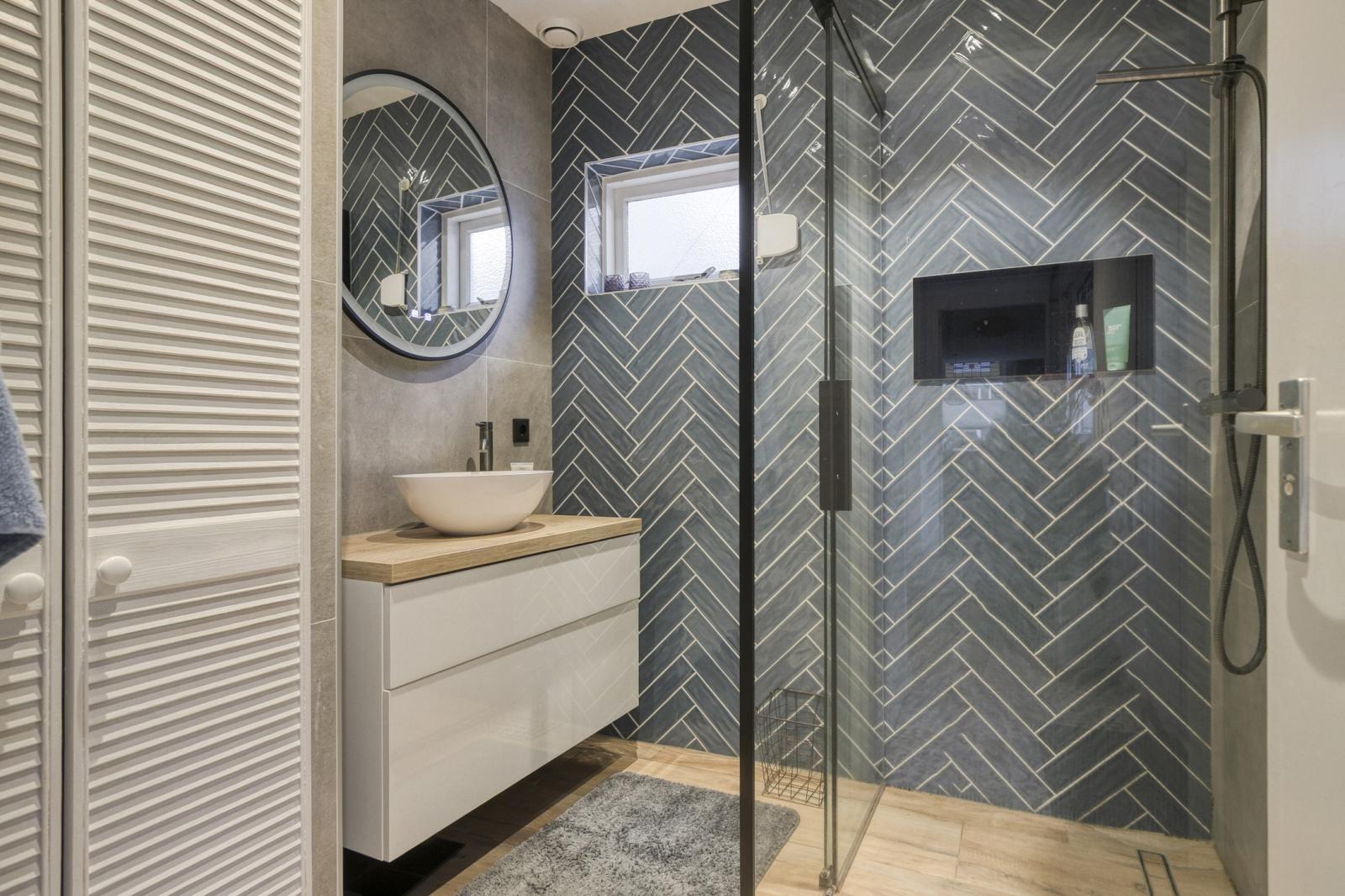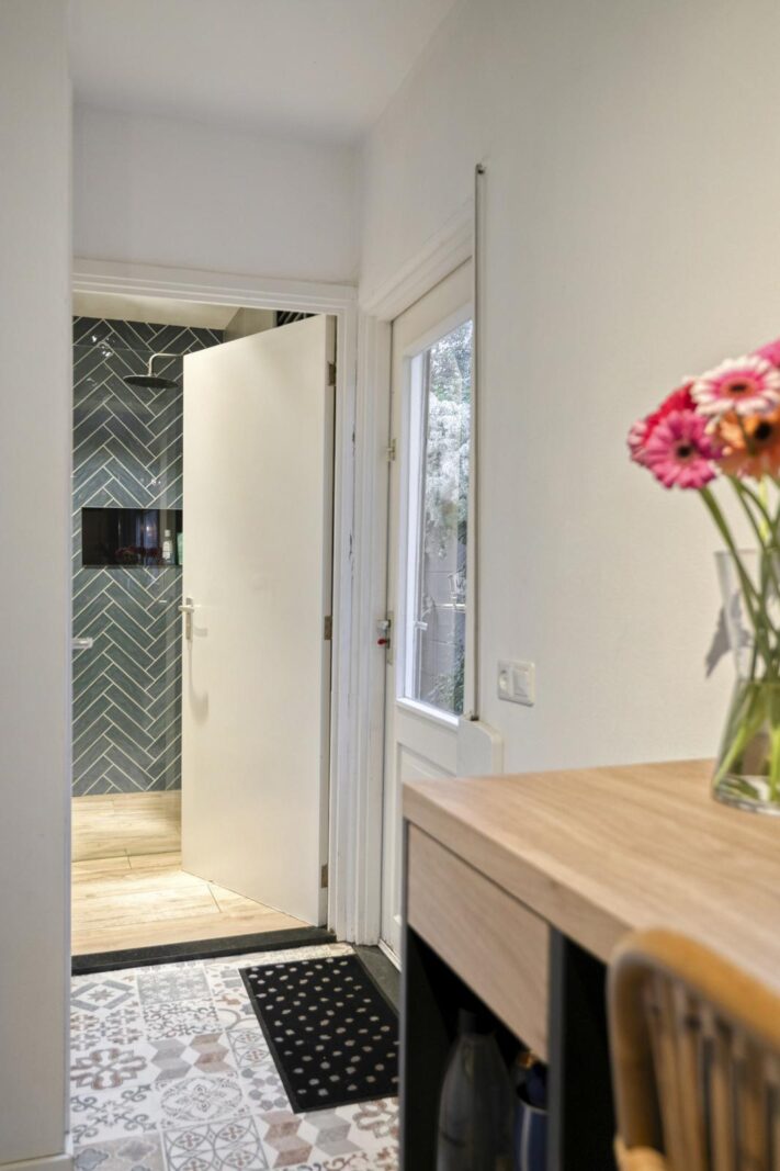 Achter de living ligt de complete keuken. Praktisch ingedeeld, compleet uitgerust (combi-oven, vaatwasser, koel-vries en 4-pits kookplaat met RVS-kap) en met een groot raam waar het daglicht zacht binnenvalt. De speelse vloertegels geven het geheel een frisse look. Aansluitend vind je een recentelijk vernieuwd modern toilet en een strak afgewerkte badkamer met inloopdouche en wastafelmeubel _ ideaal na een run door het park of een lange werkdag.