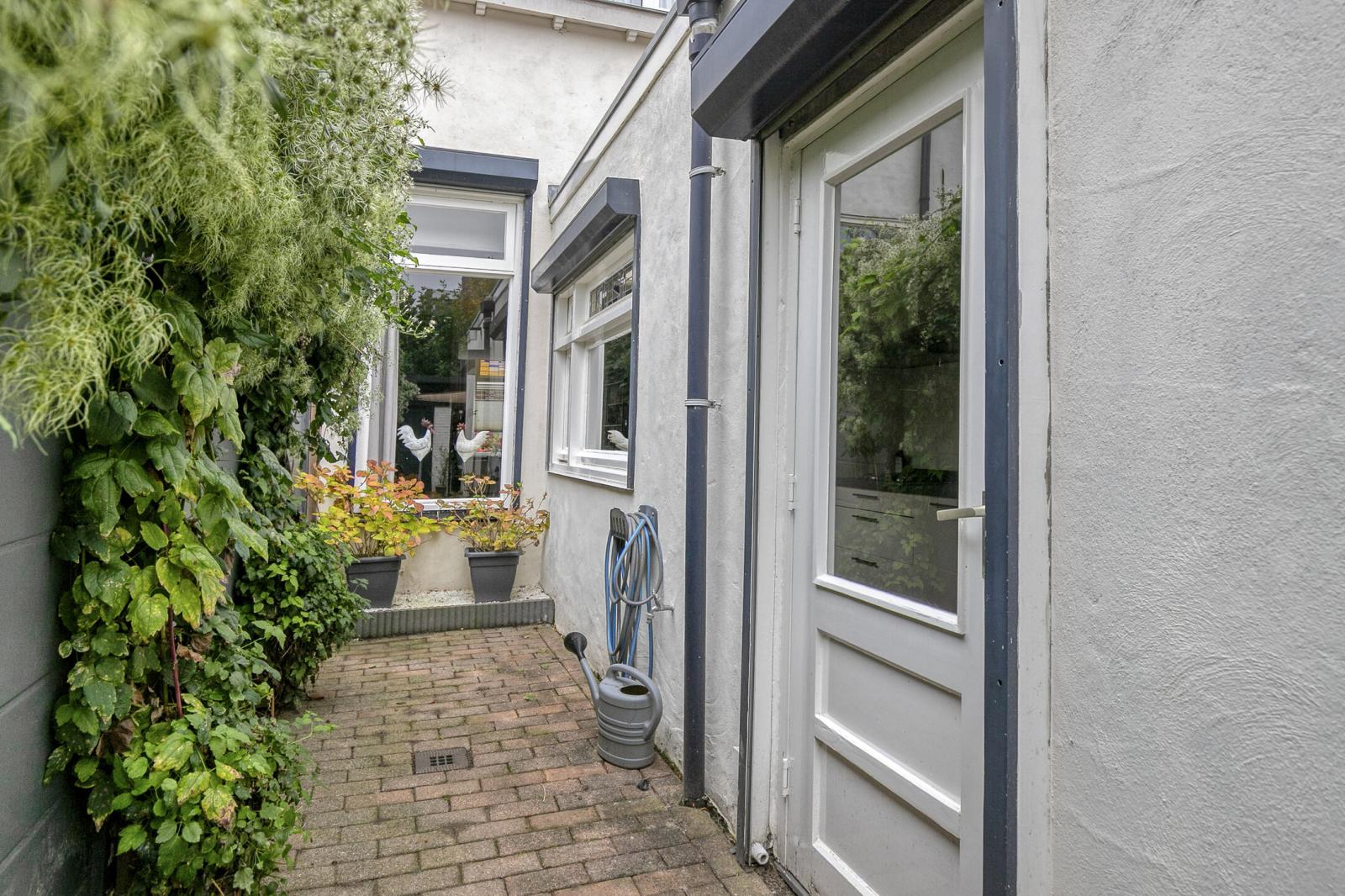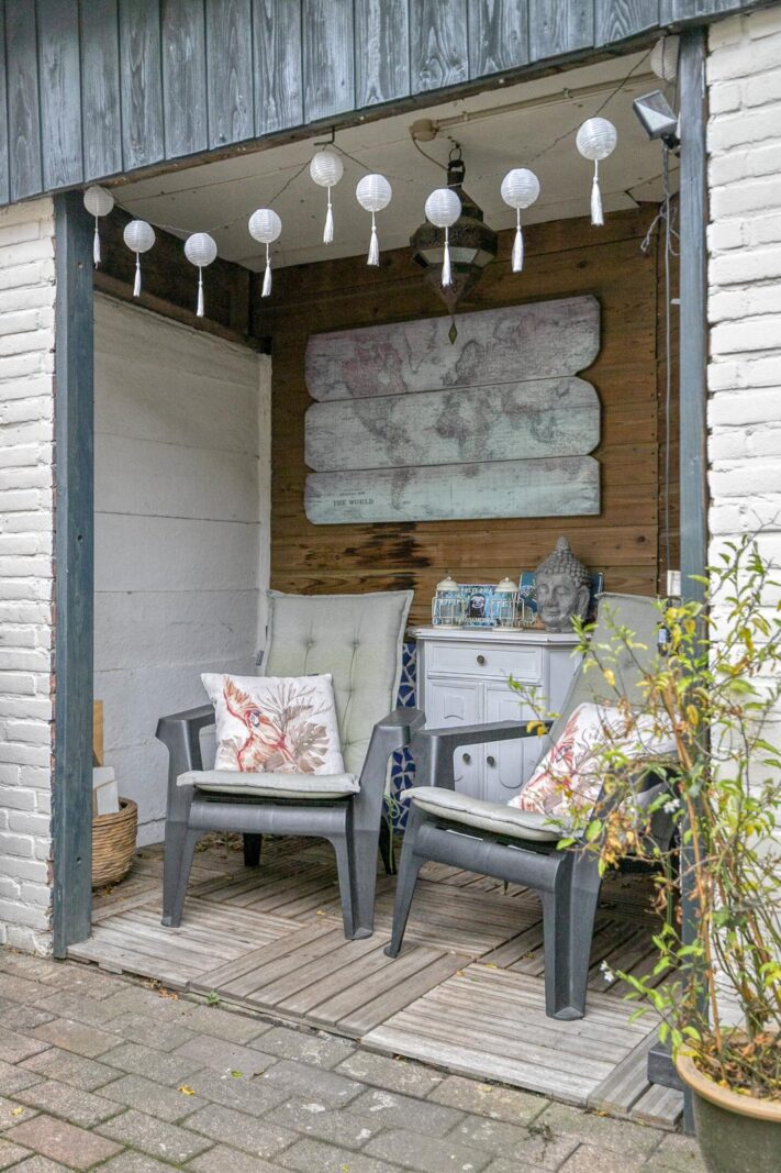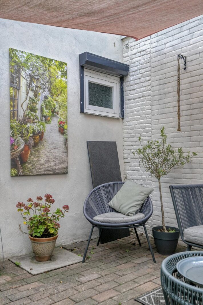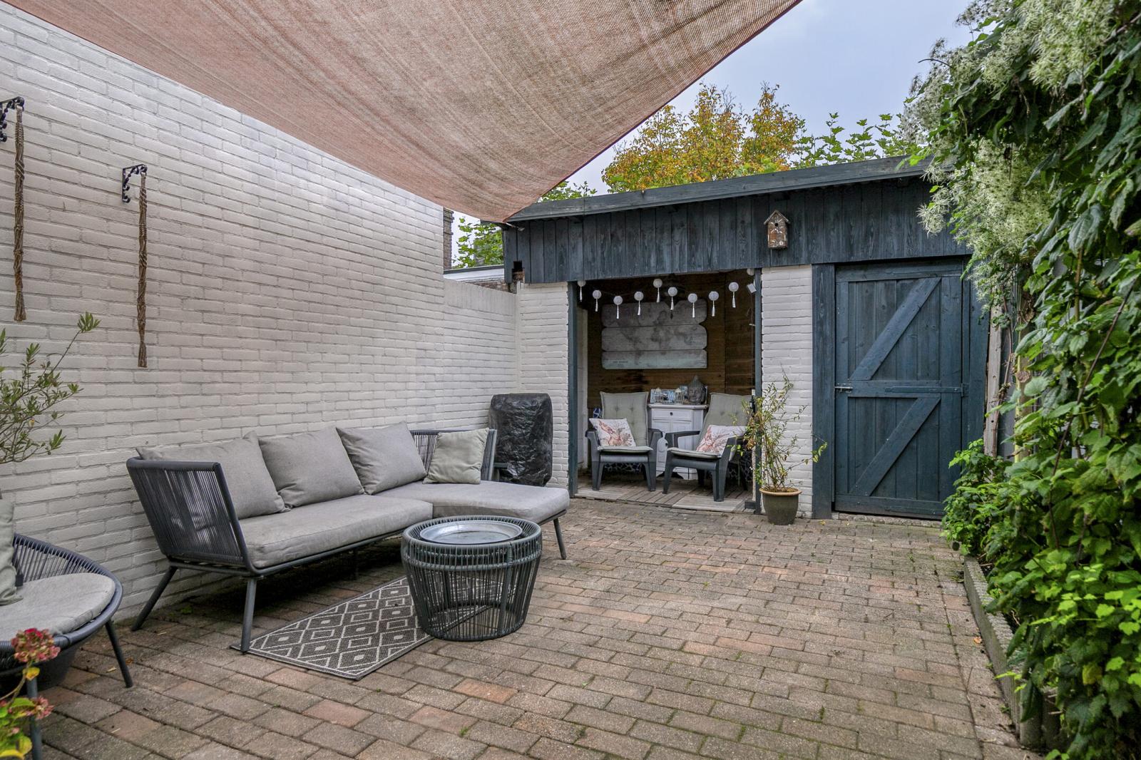 De patio is onderhoudsarm en voelt als een buitenkamer. Met meerdere zitplekken kies je 's ochtends voor zon en 's avonds voor schaduw. Achterin staat een stenen berging voor fietsen en tuinspullen; via de handige achterom rij je je bike zo naar binnen. De kleine veranda achterin is je relaxplek voor zwoele zomeravonden.