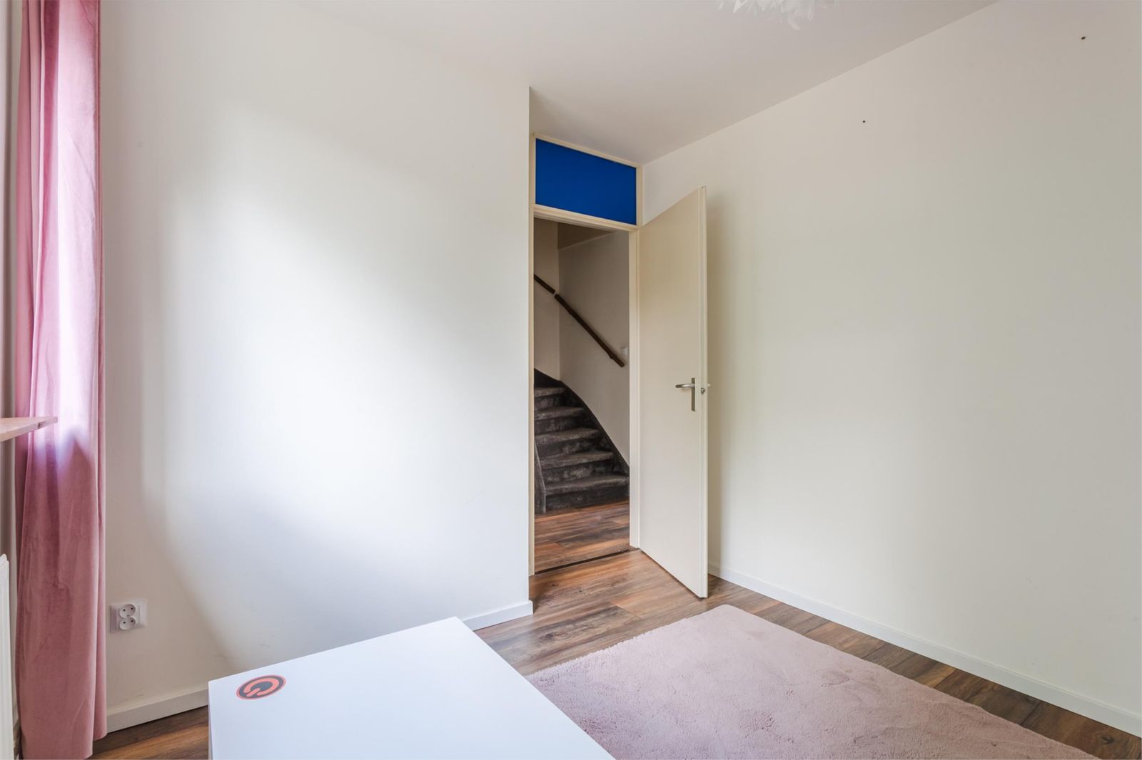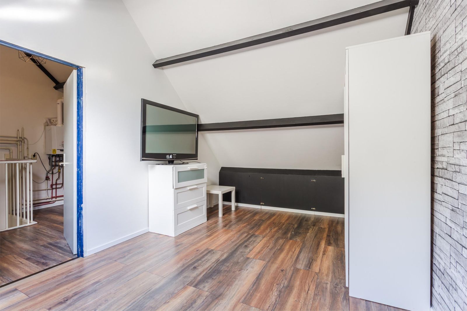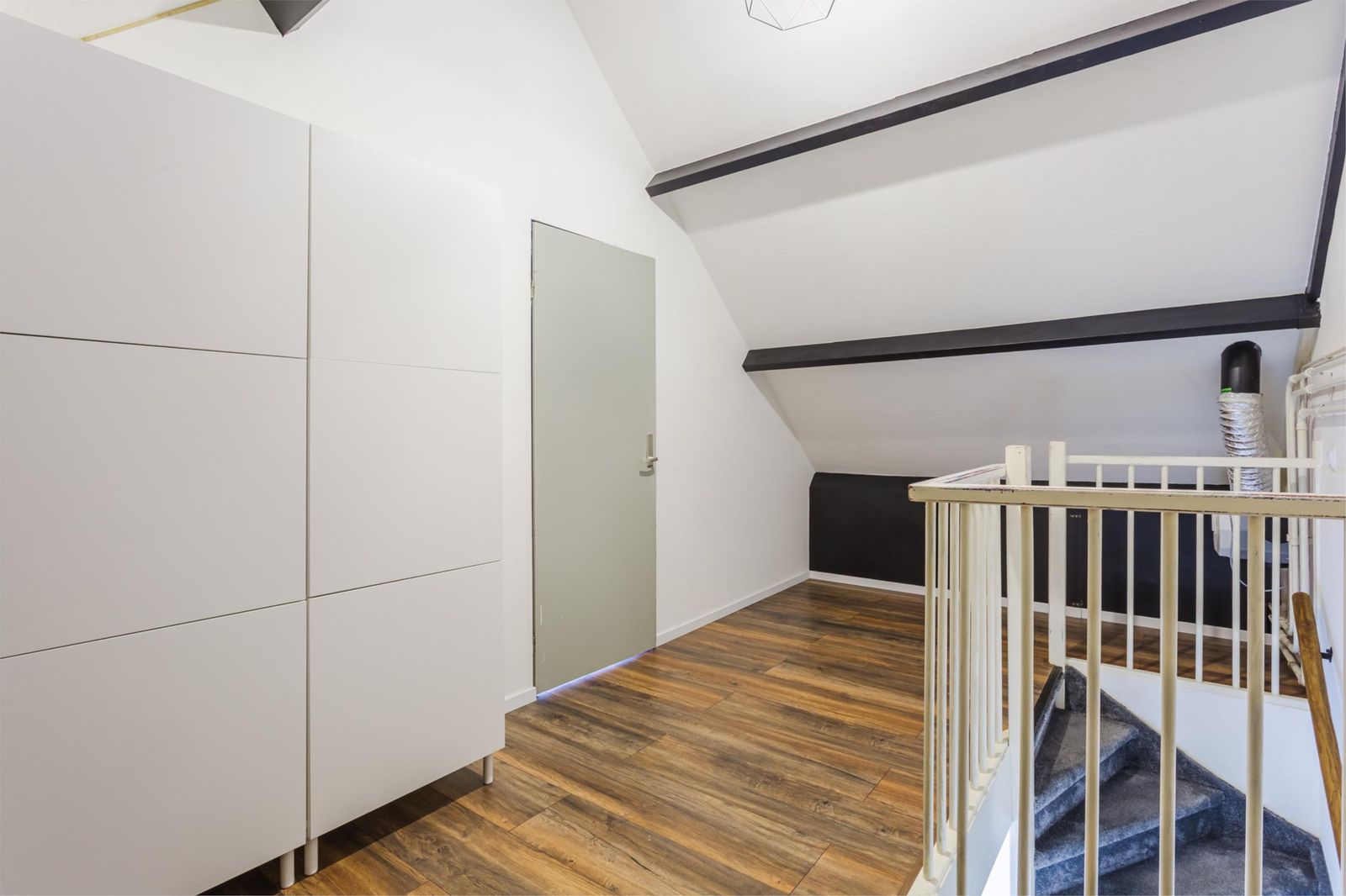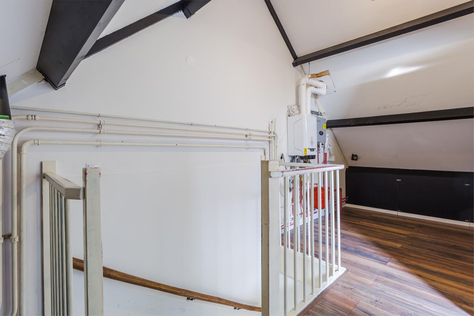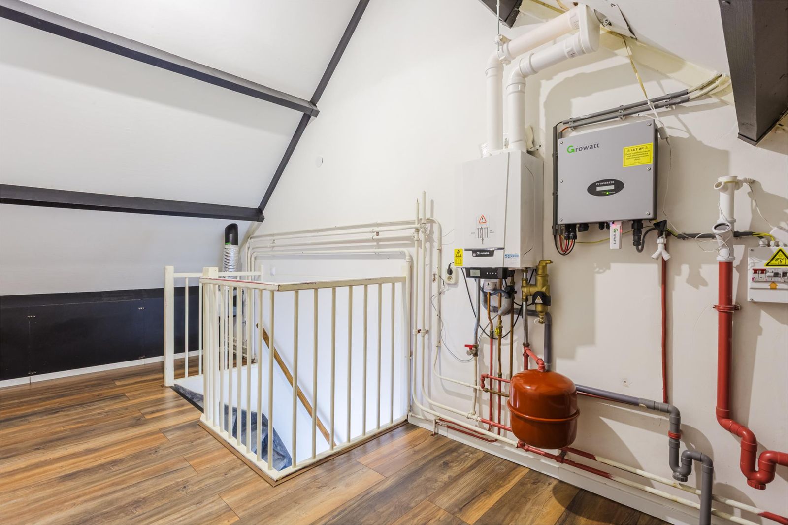 Via een vaste trap bereik je de ruime vierde slaapkamer. Hier bevinden zich ook de cv-installatie, aansluiting voor de wasmachine en de mechanische ventilatie.