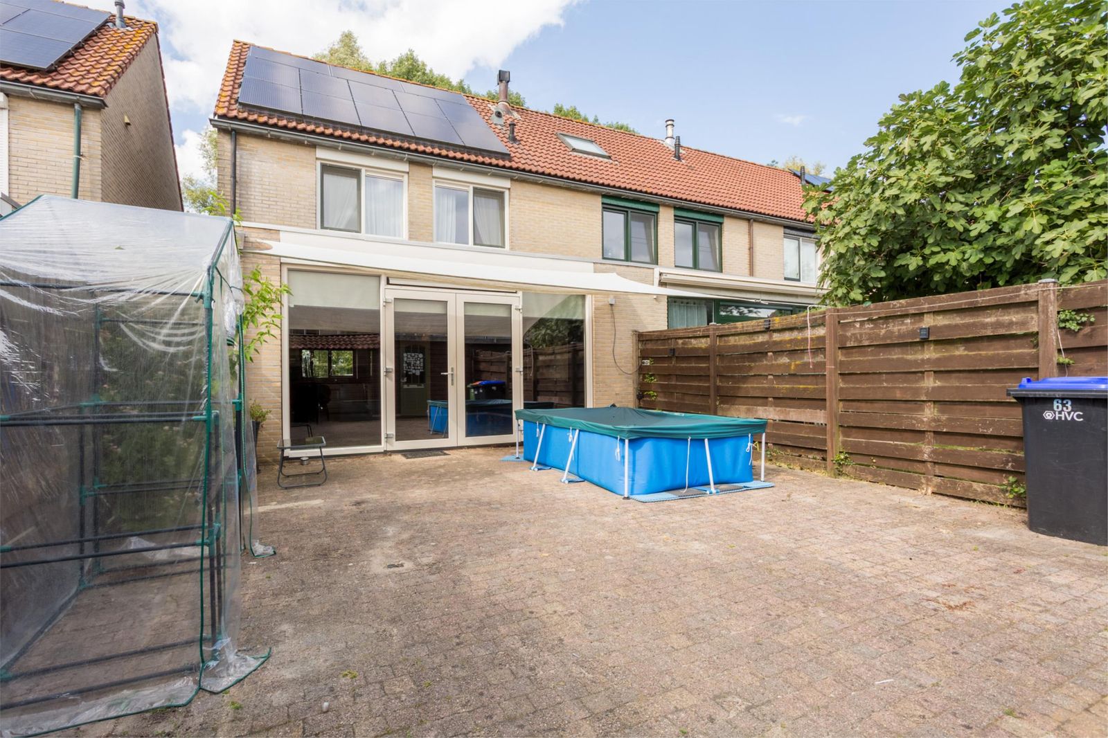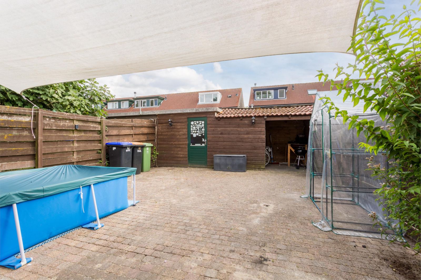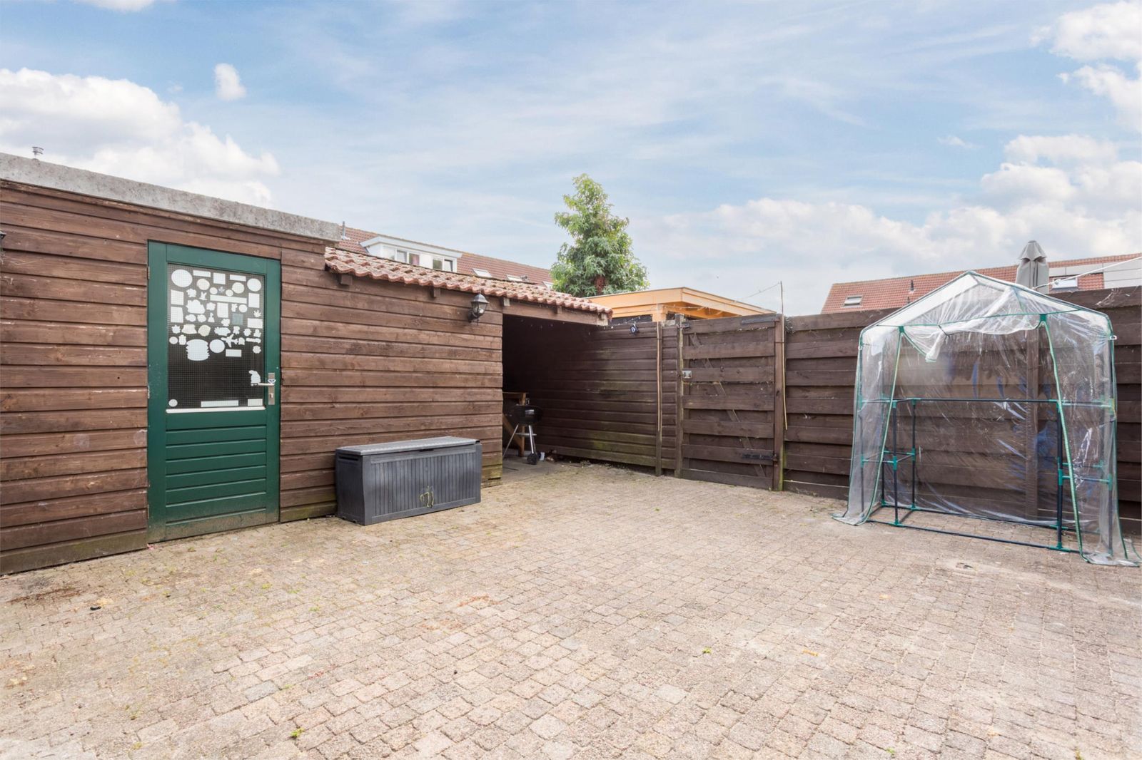 De achtertuin ligt op het zuiden en beschikt over een vrijstaande berging met overkapping en bestrating.