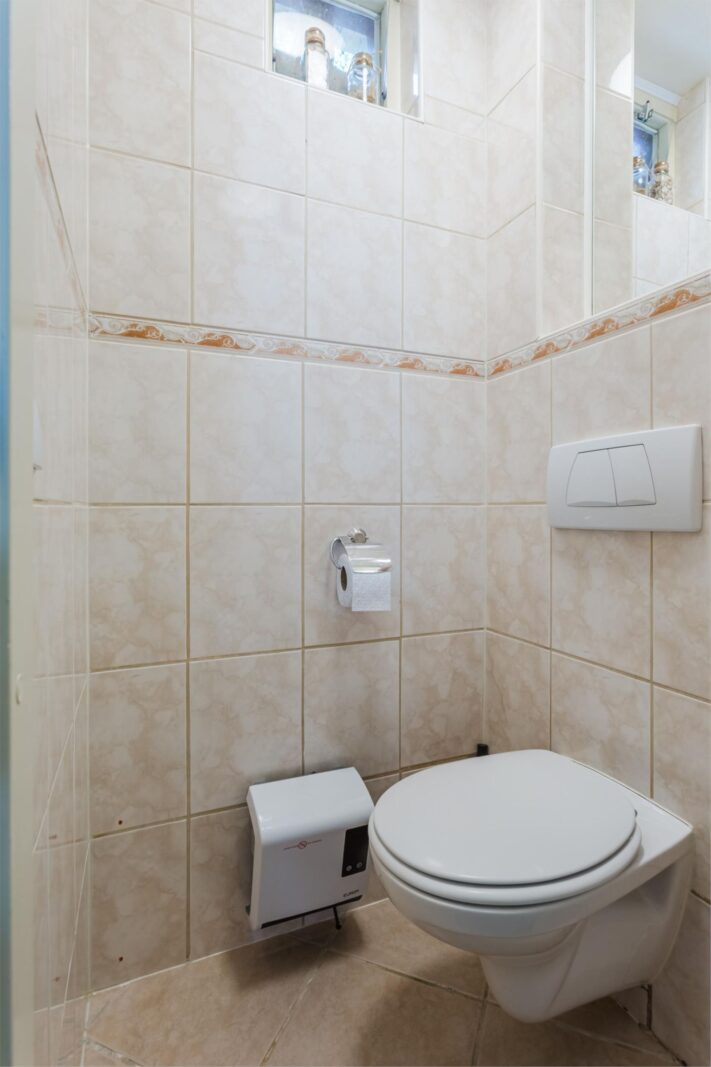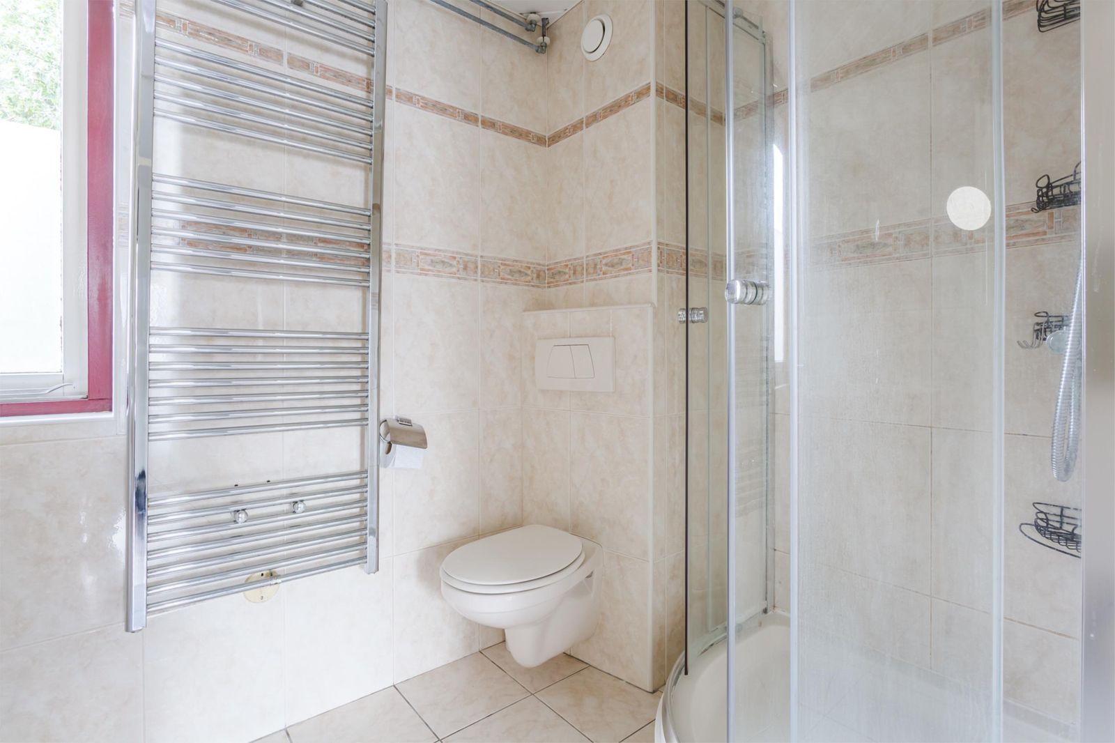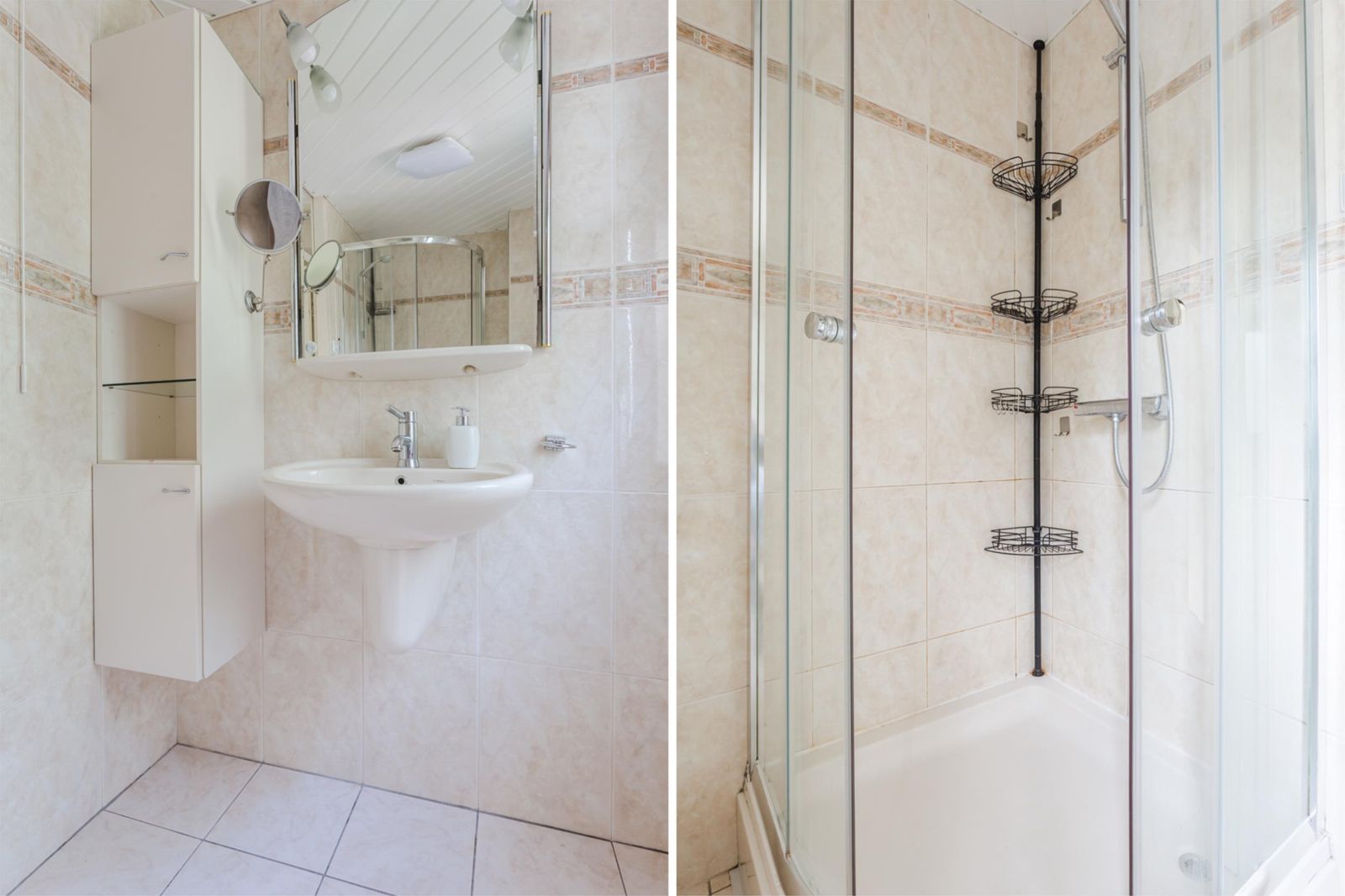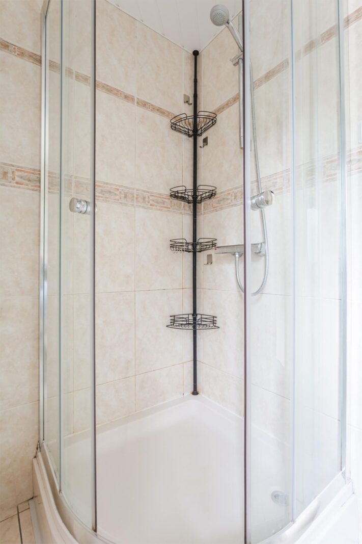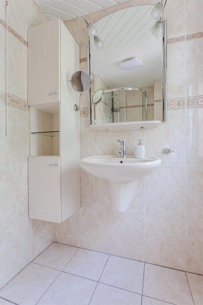 Drie slaapkamers en een badkamer met douchecabine, tweede toilet en wastafelmeubel.