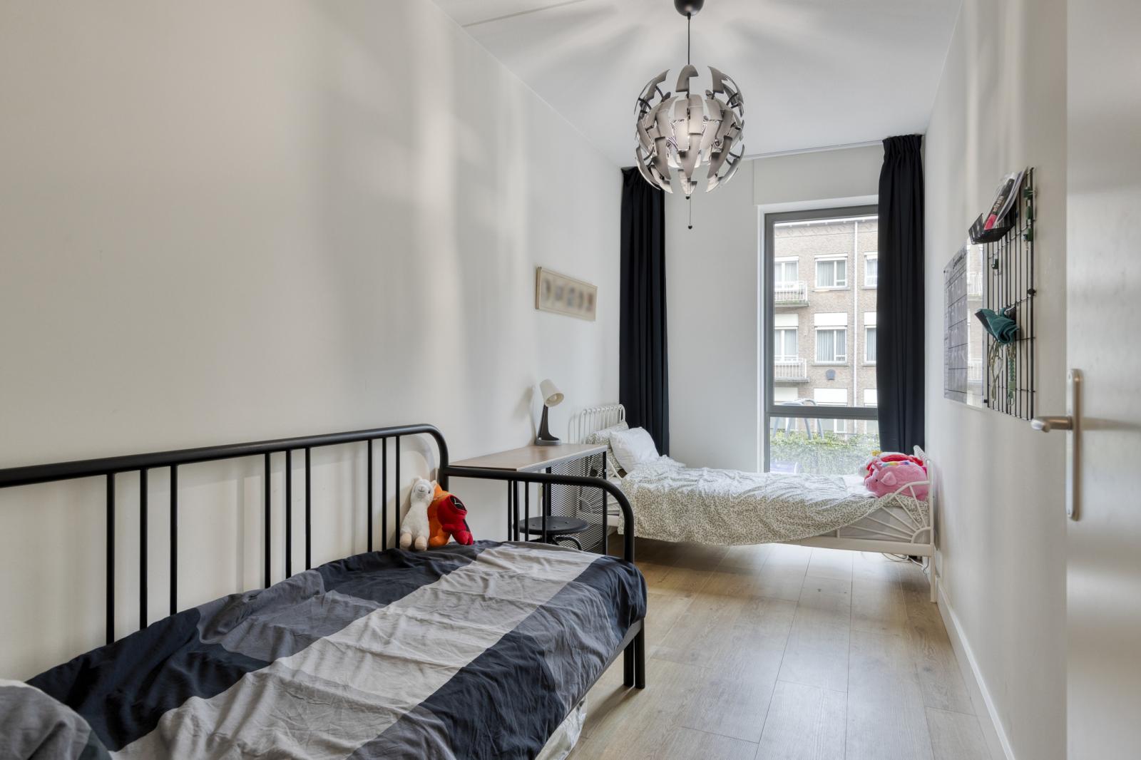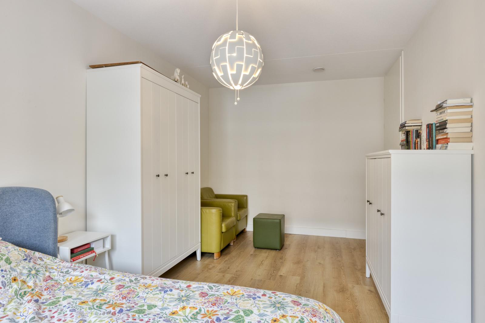 Het appartement beschikt over twee slaapkamers van ca. 18 m² en 9 m², eveneens strak afgewerkt met laminaatvloer en schilderwerk.