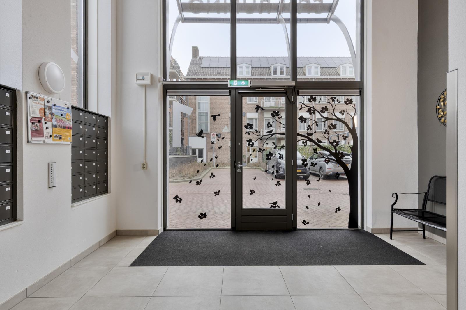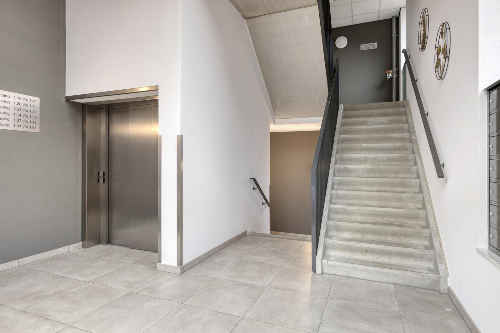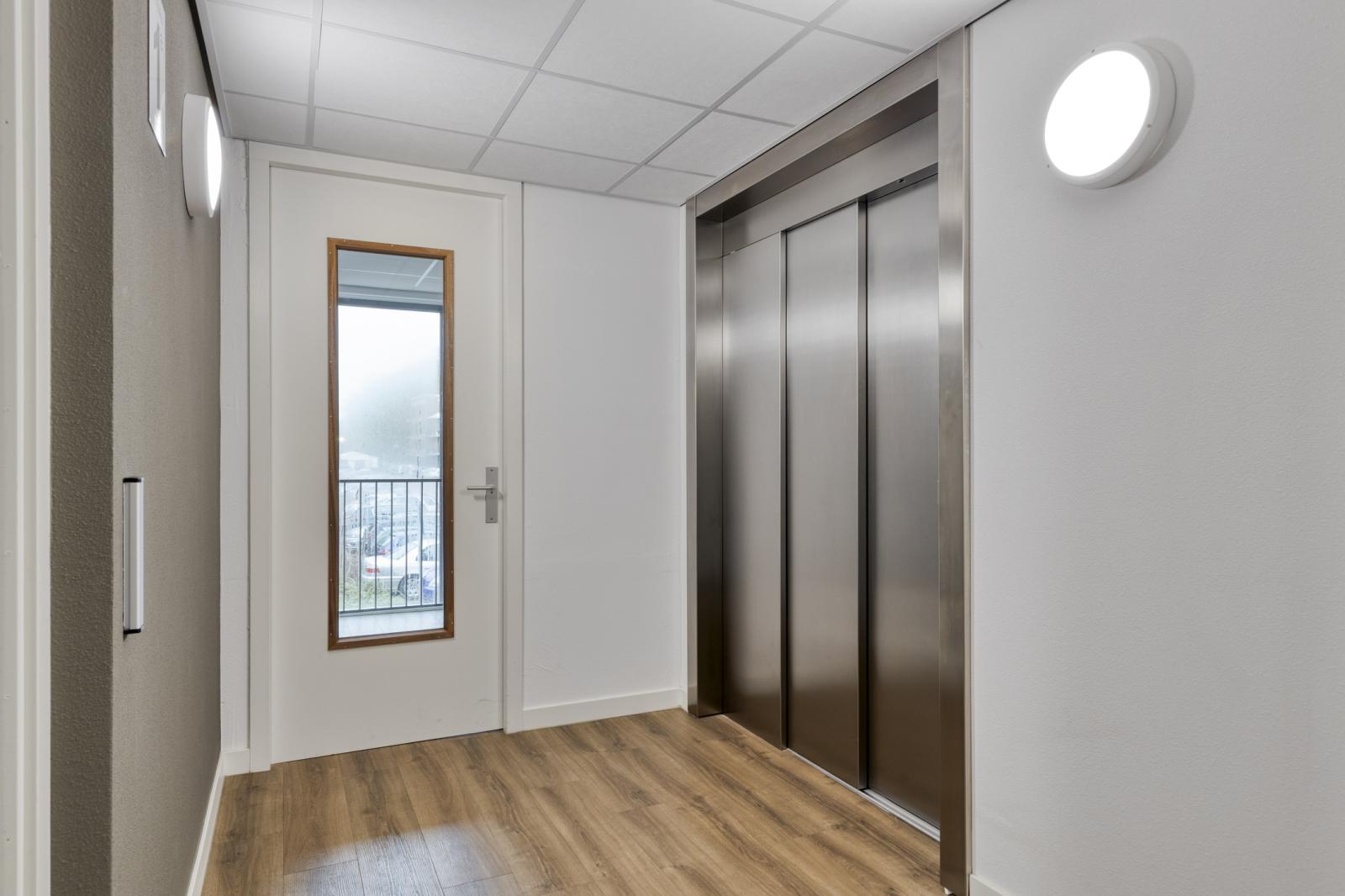 Via de centrale entree met bellentableau, intercom, lift en trap bereikt u het appartement. De lift bevindt zich gunstig nabij de woning.