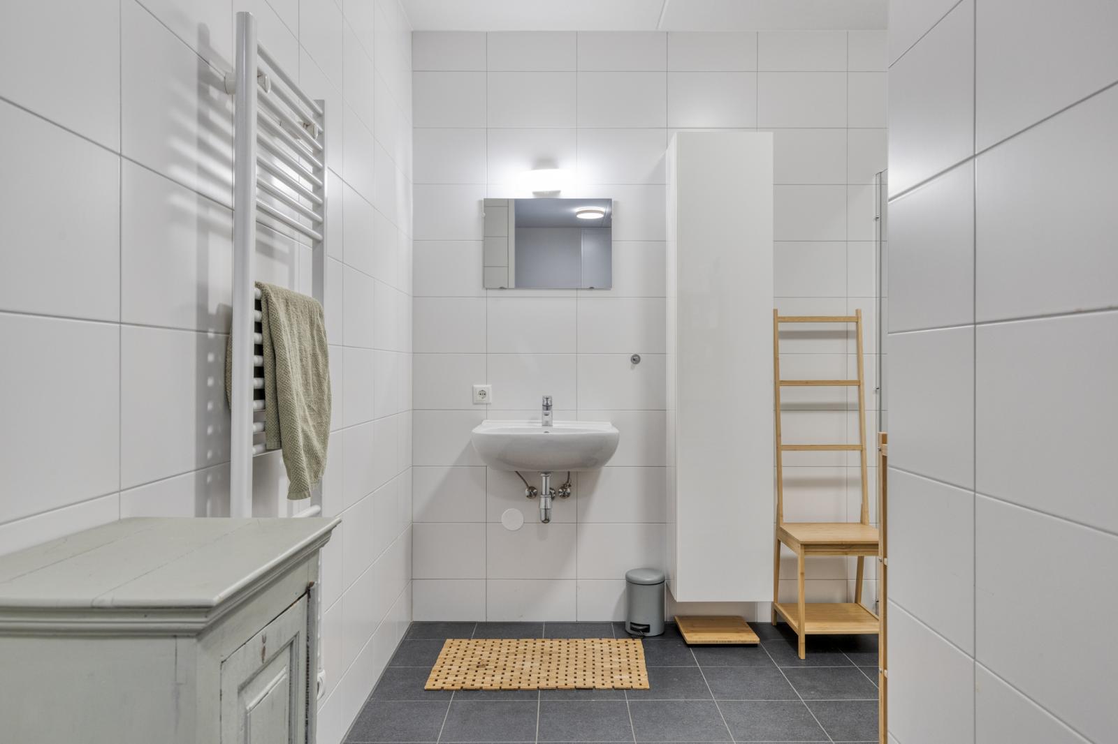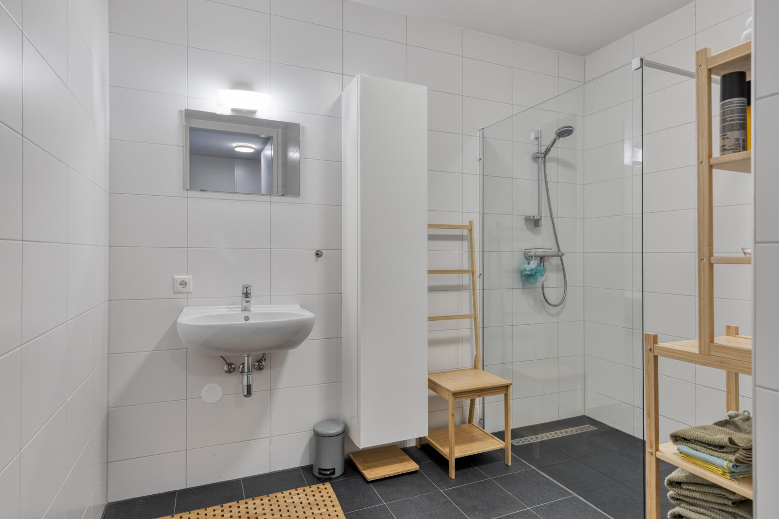De ruime, volledig betegelde badkamer (ca. 7,5 m²) is voorzien van: