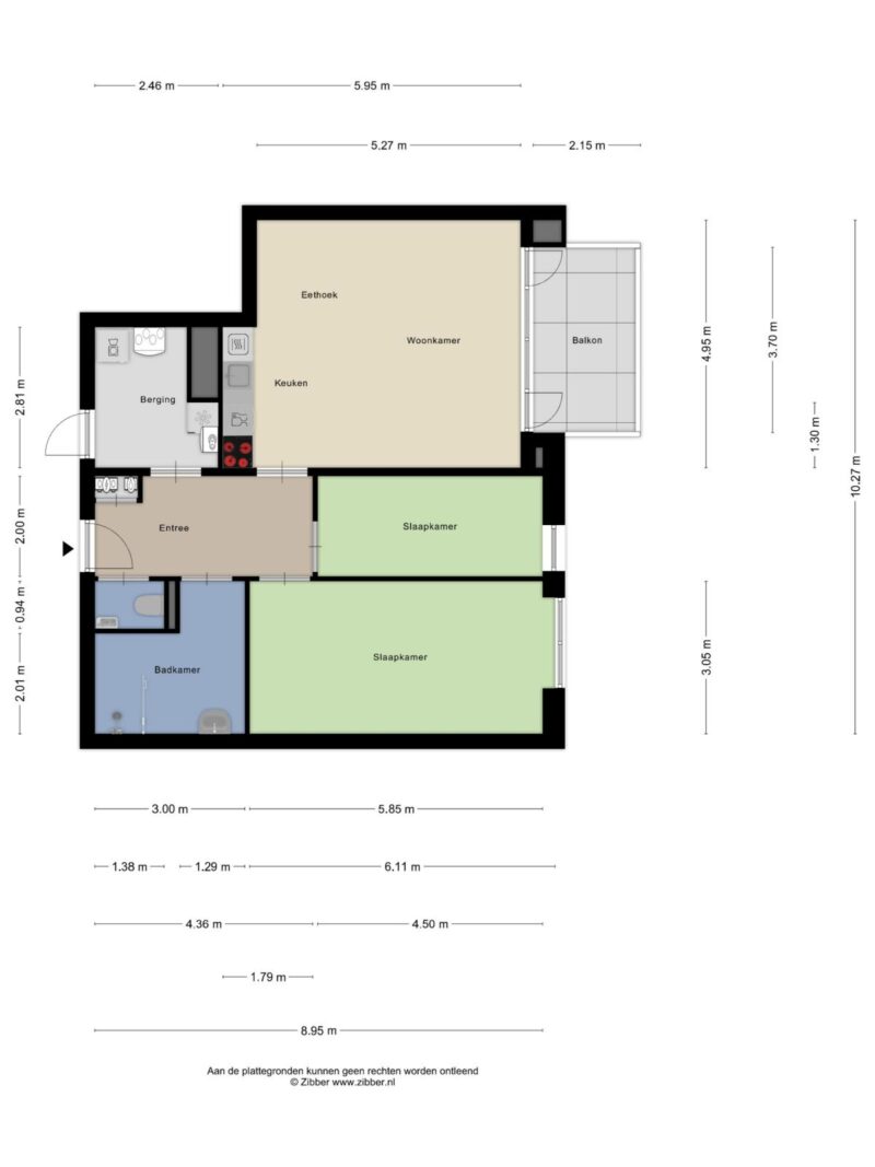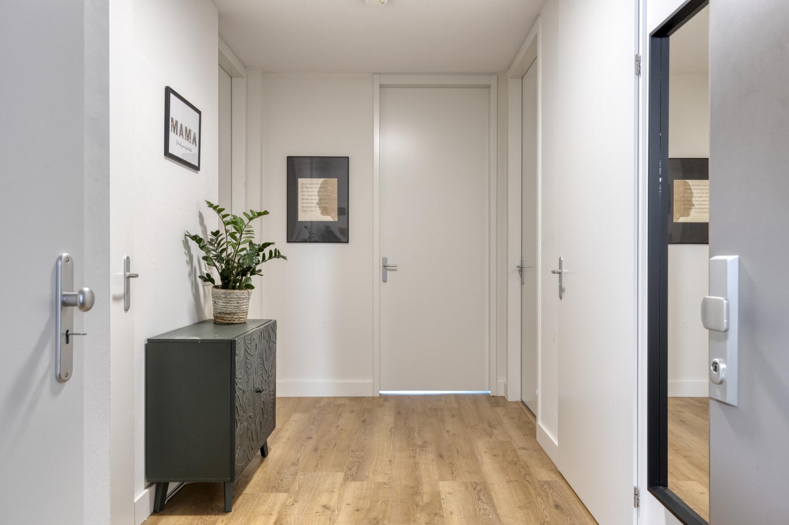 Entree met royale hal (ca. 8 m²) die toegang biedt tot alle vertrekken: de living, twee slaapkamers, badkamer, separaat toilet en technische-/witgoedruimte.
