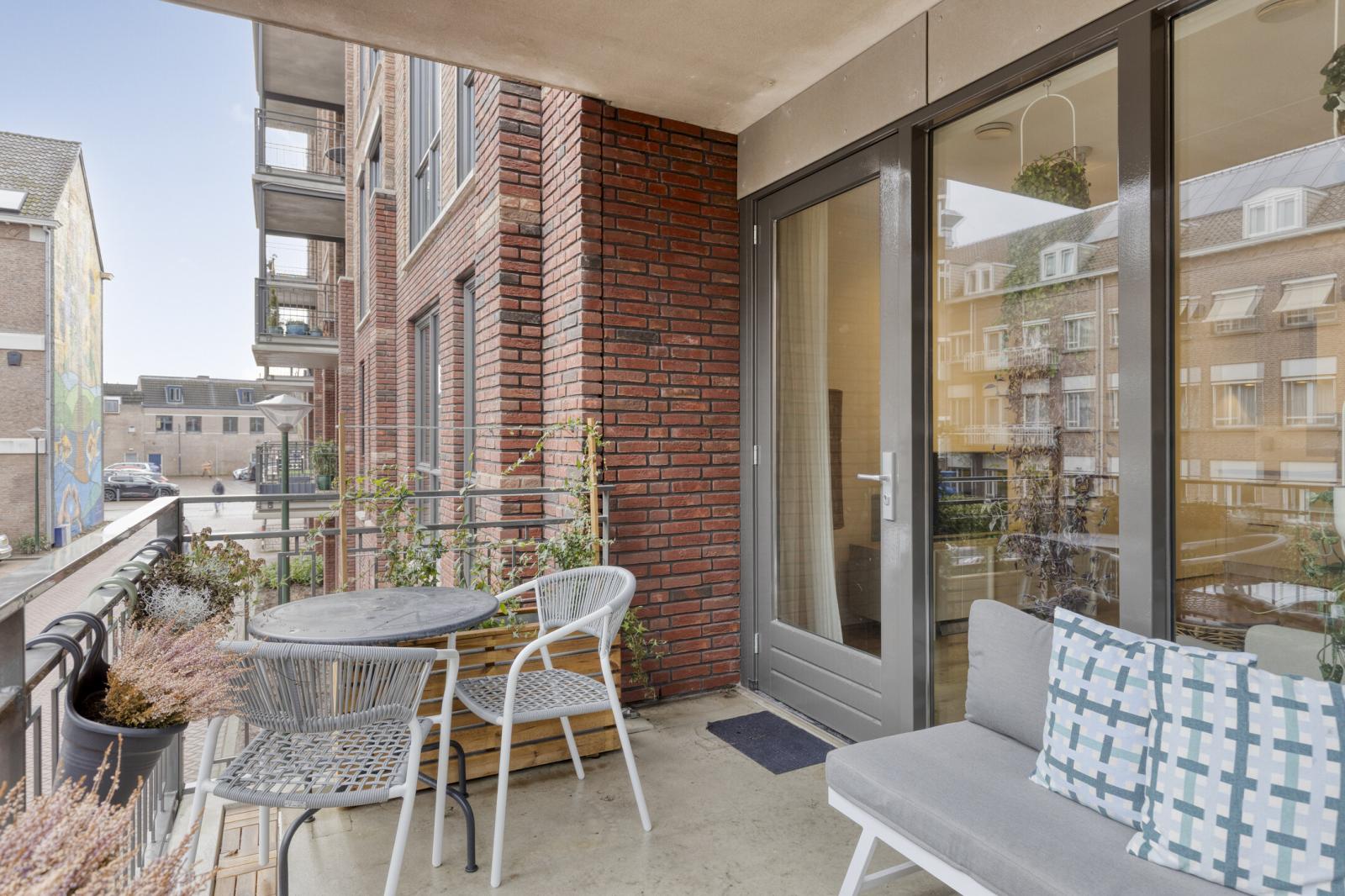Vanuit de living stapt u zo het balkon op (ca. 8 m²), gelegen op het oosten met een prettig groen uitzicht _ ideaal voor een kop koffie in de ochtendzon.