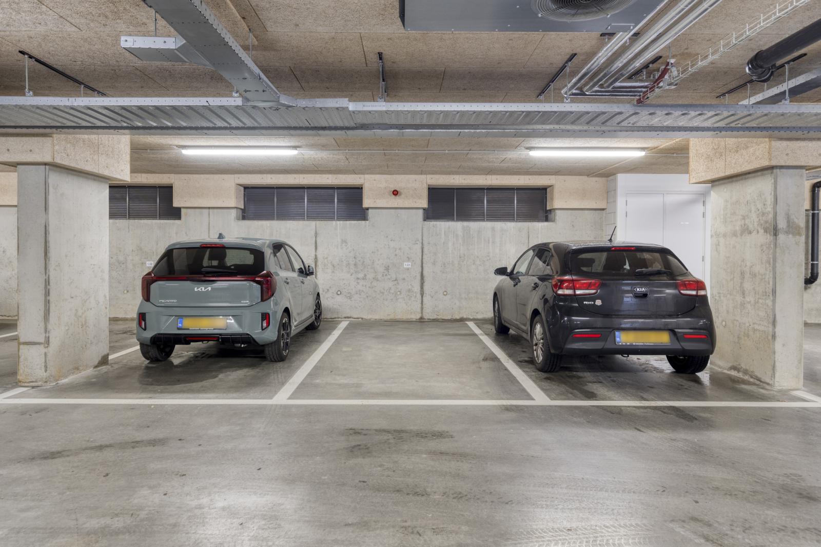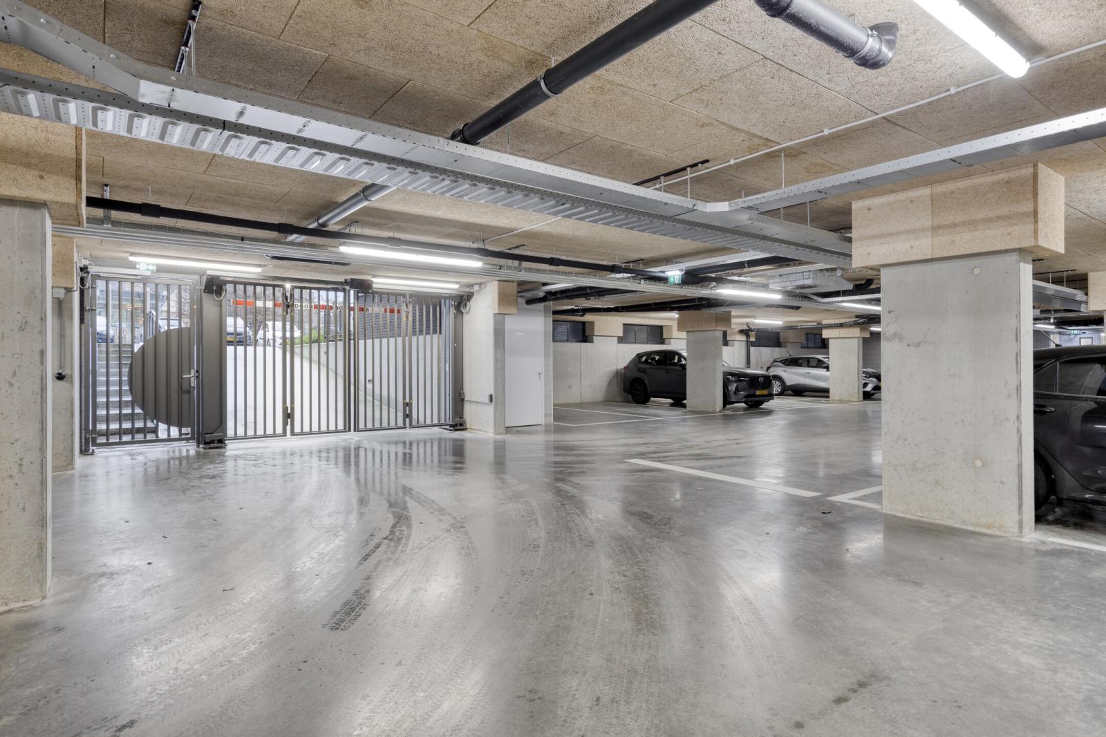 -Eigen parkeerplaats in de parkeerkelder van het naastgelegen gebouw, voorzien van elektrische toegangspoort