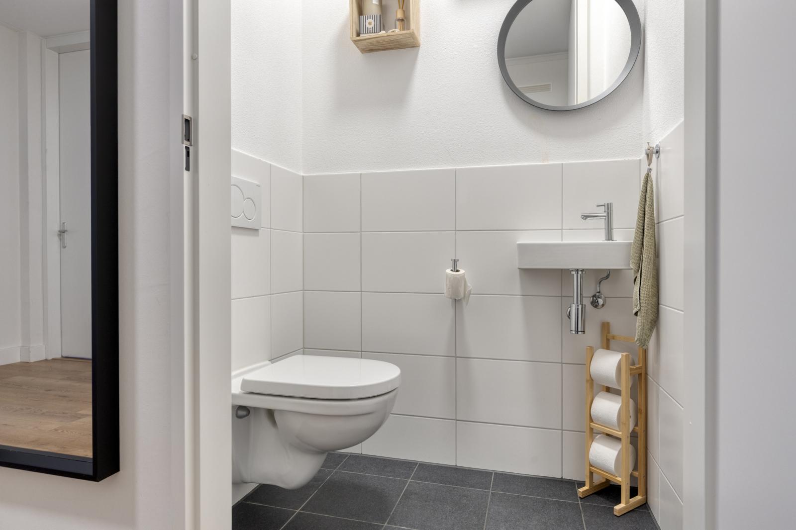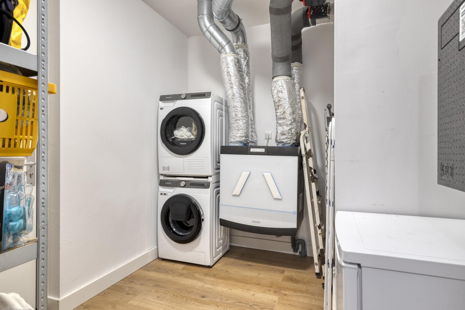 Daarnaast is er een separaat toilet met hangcloset en fonteintje én een praktische technische-/witgoedruimte (ca. 6 m²) met aansluitingen voor wasmachine en droger en extra bergruimte.