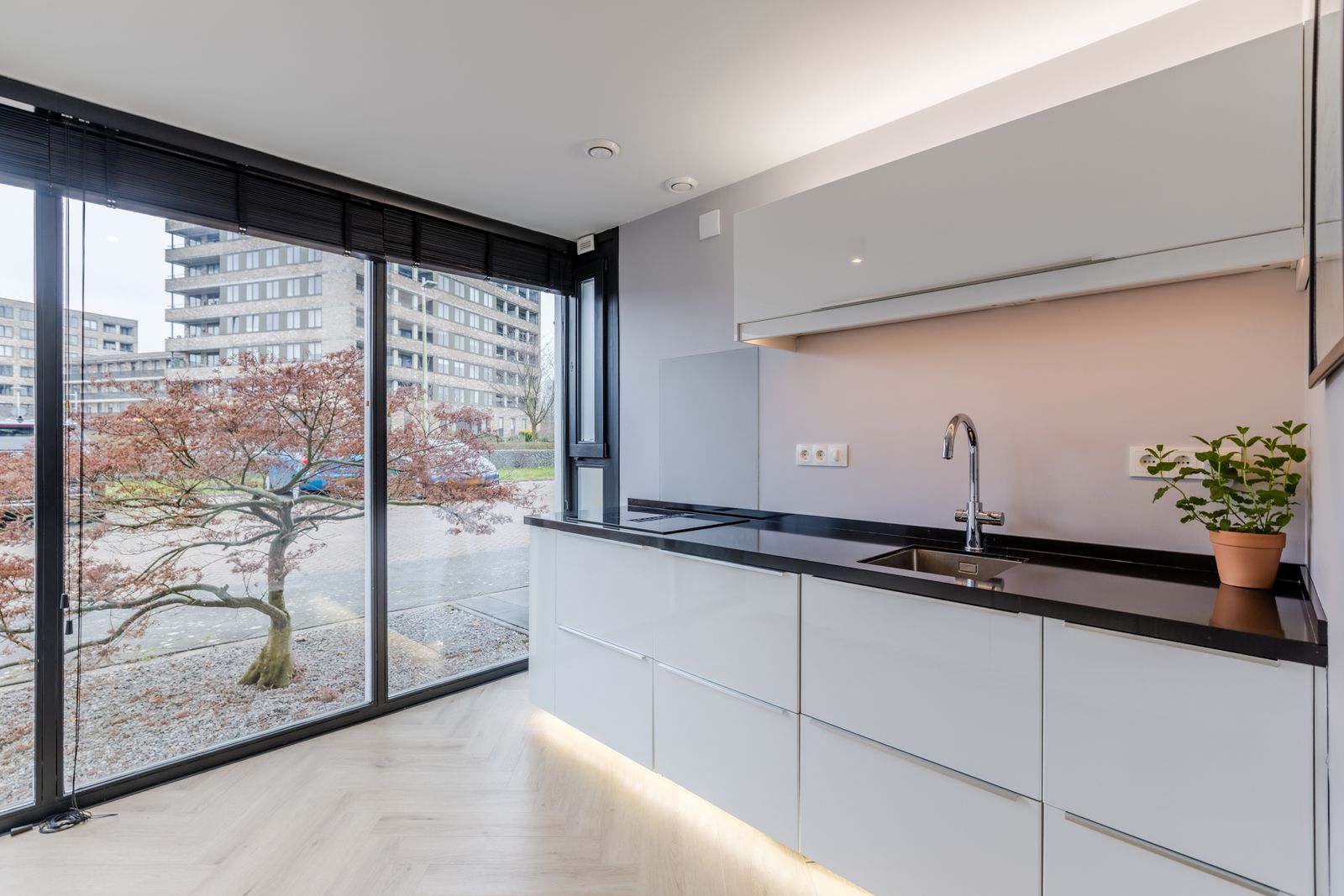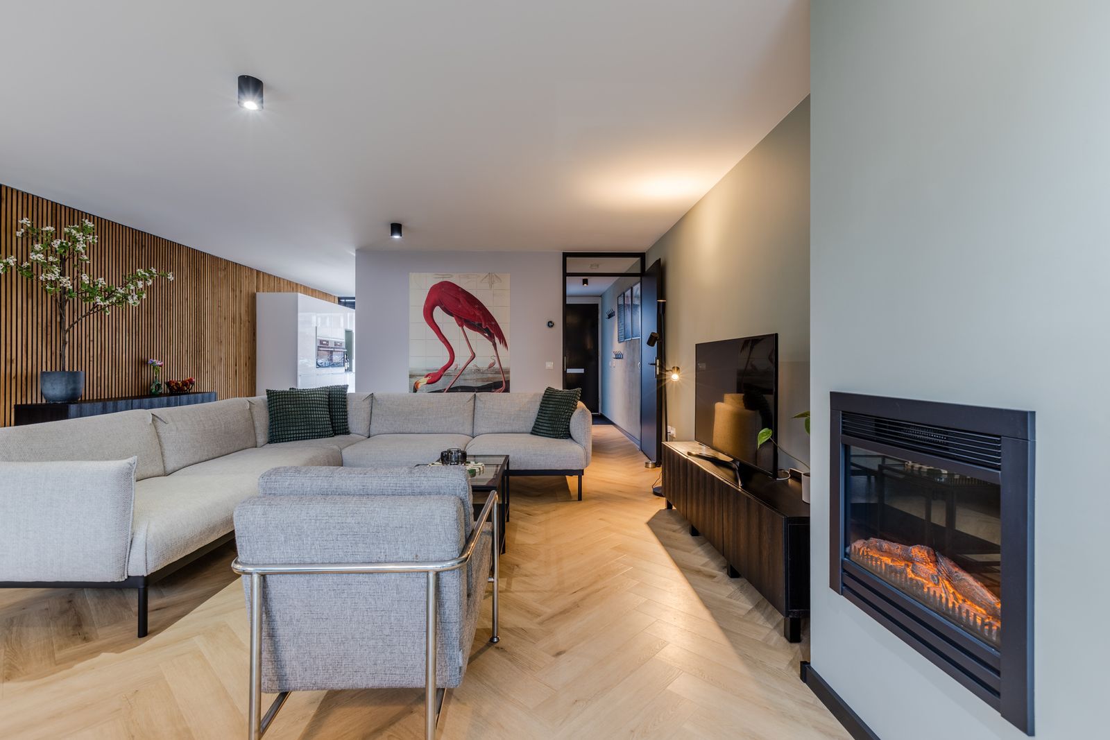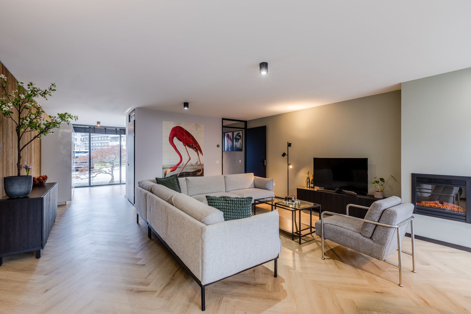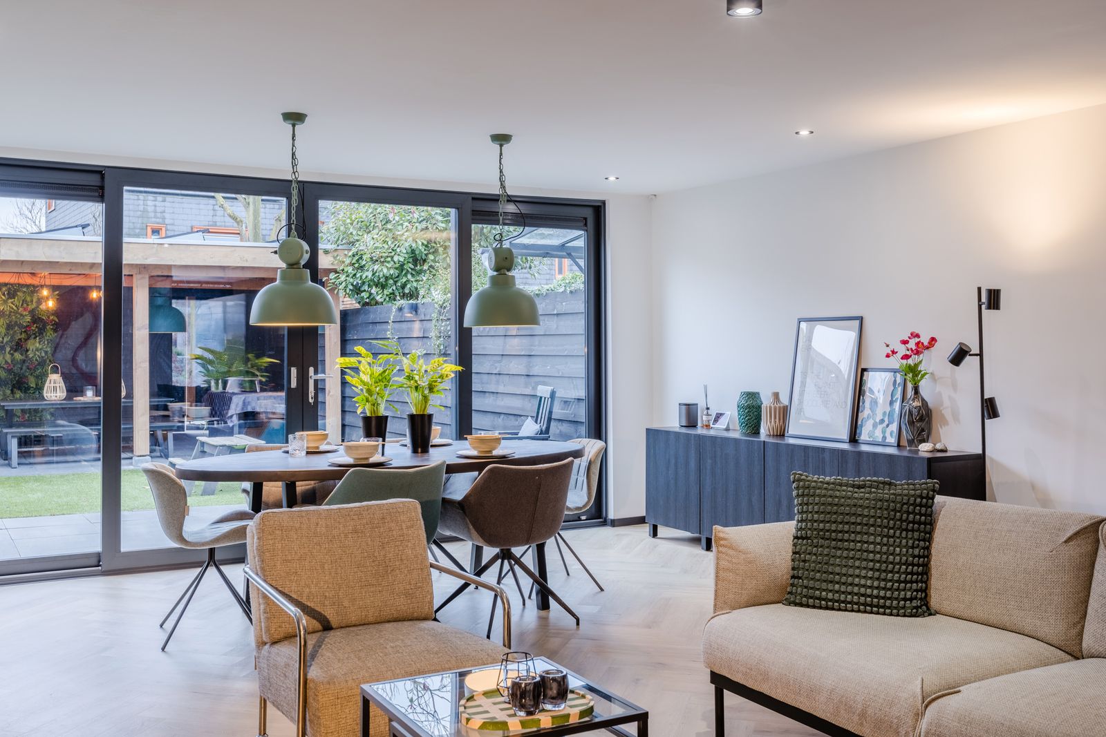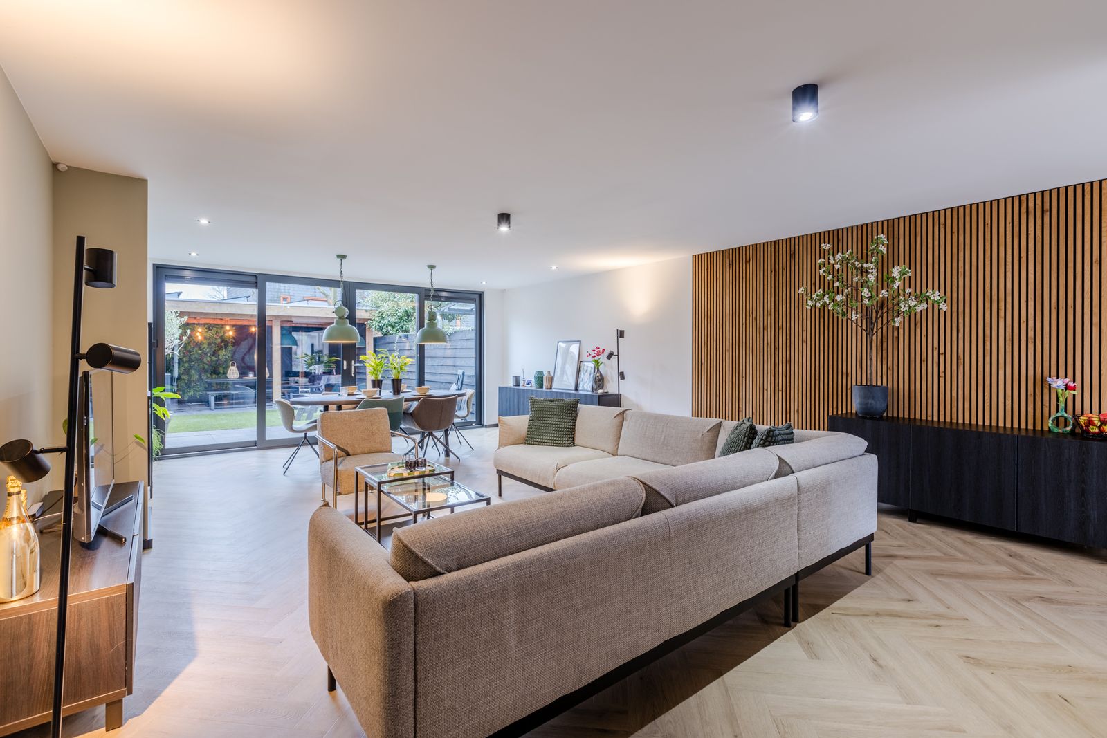 De ruime woonkamer (met visgraat PVC-vloer) is dankzij de uitbouw heerlijk royaal en comfortabel door de vloerverwarming (stadsverwarming). Via de grote aluminium schuifpui met triple glas loop je zo de tuin in. Op zonnige dagen zorgt het elektrische screen voor extra comfort. De uitbouw is afgewerkt met een sedumdak en voorzien van 2 zonnepanelen.