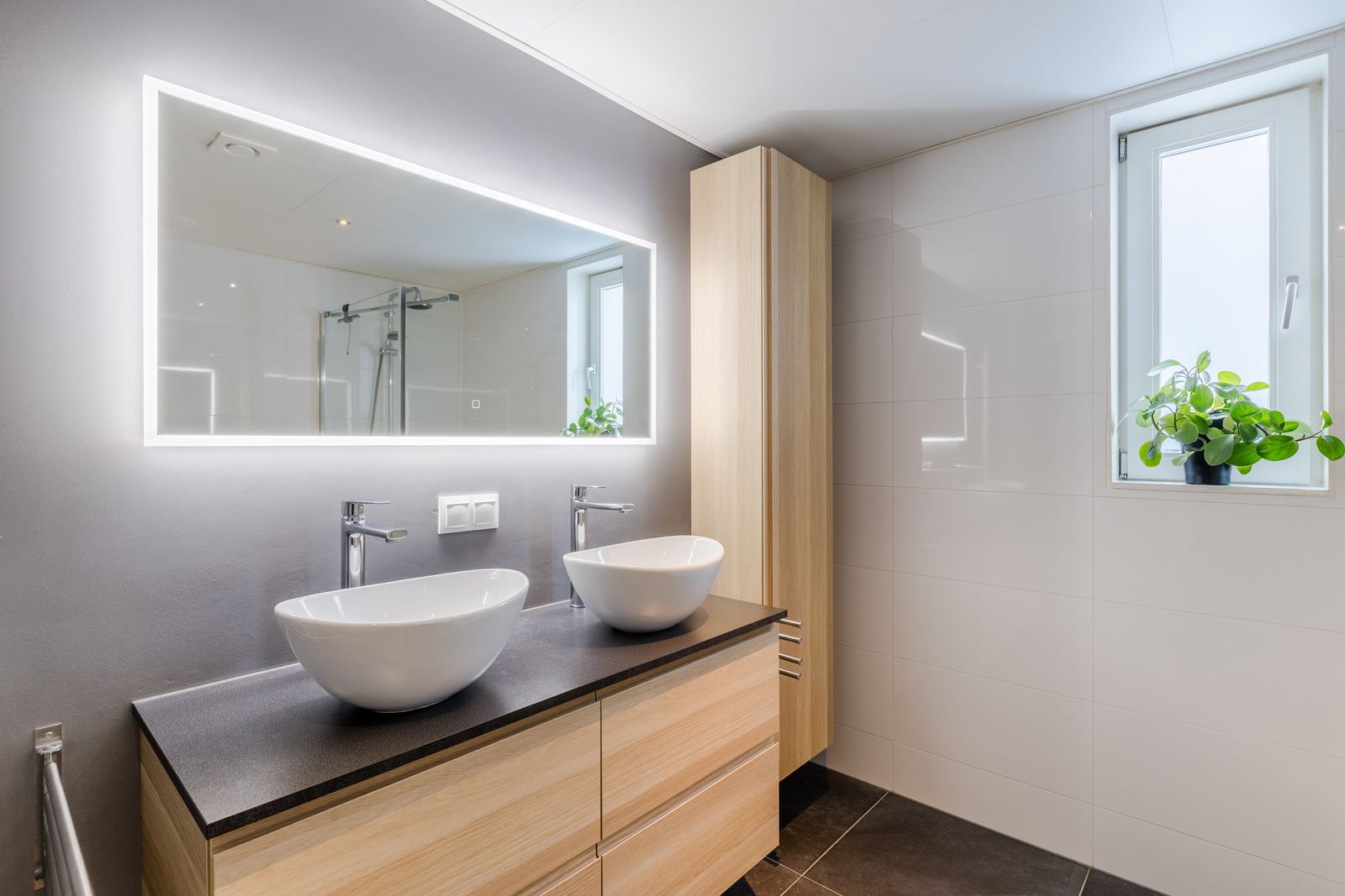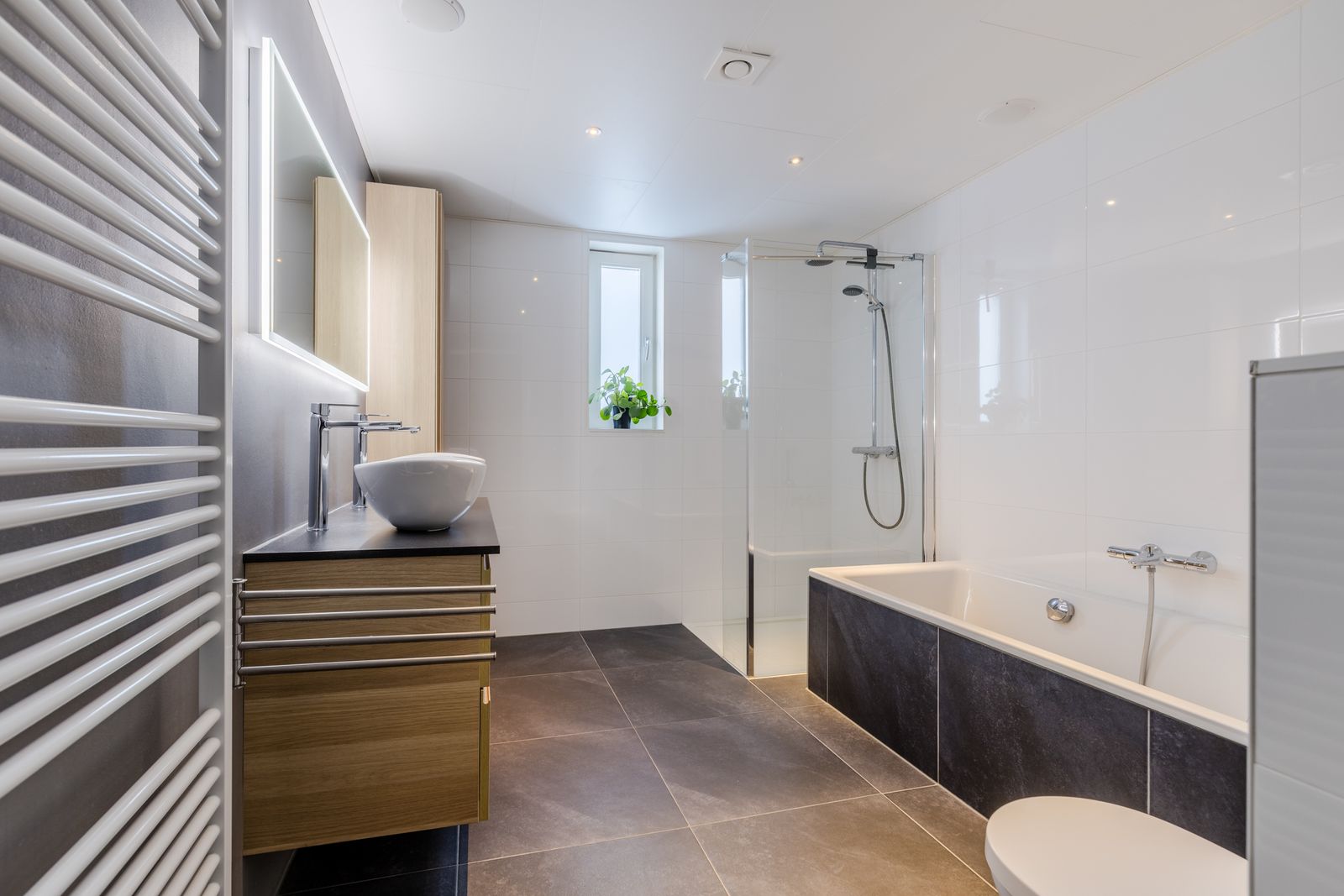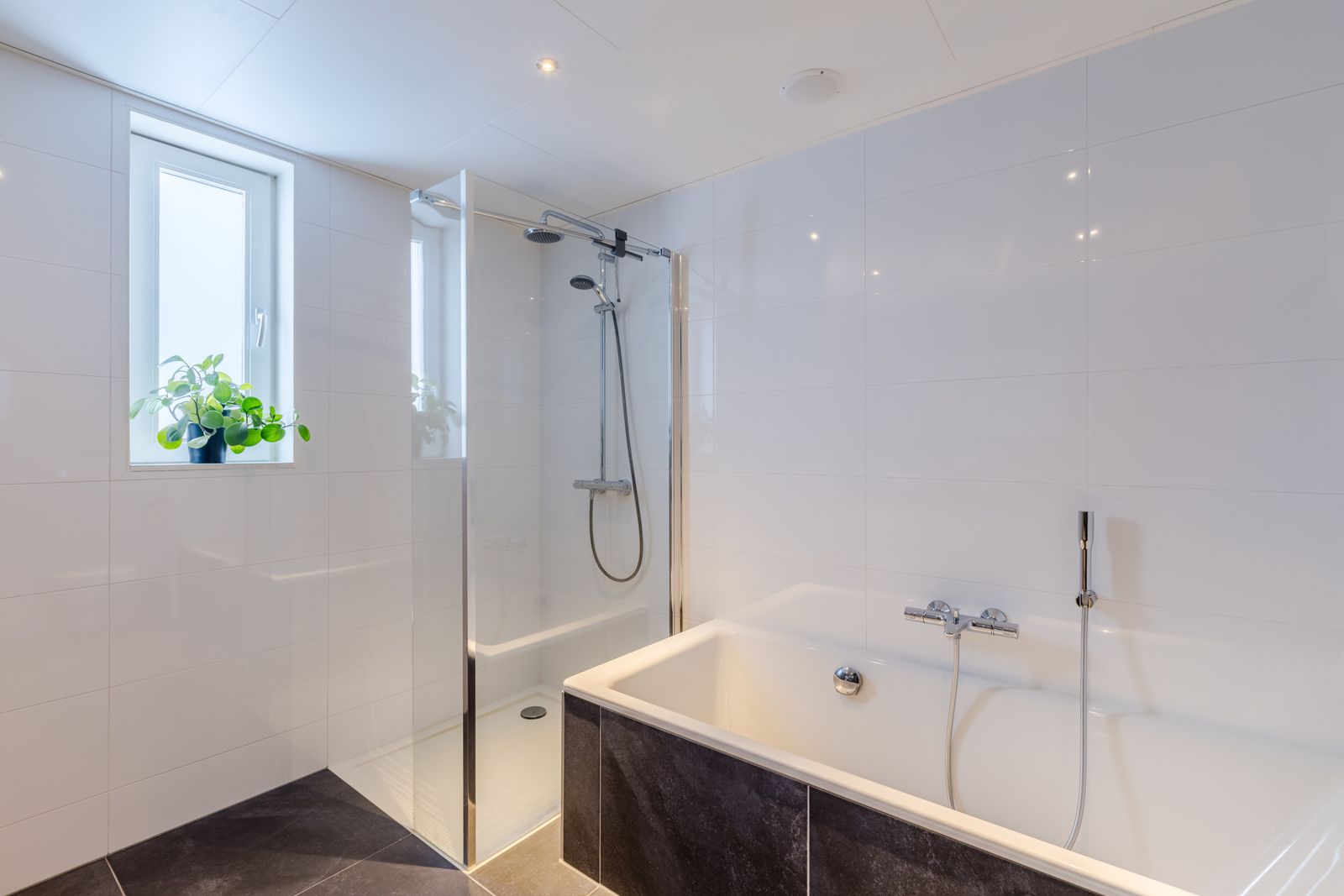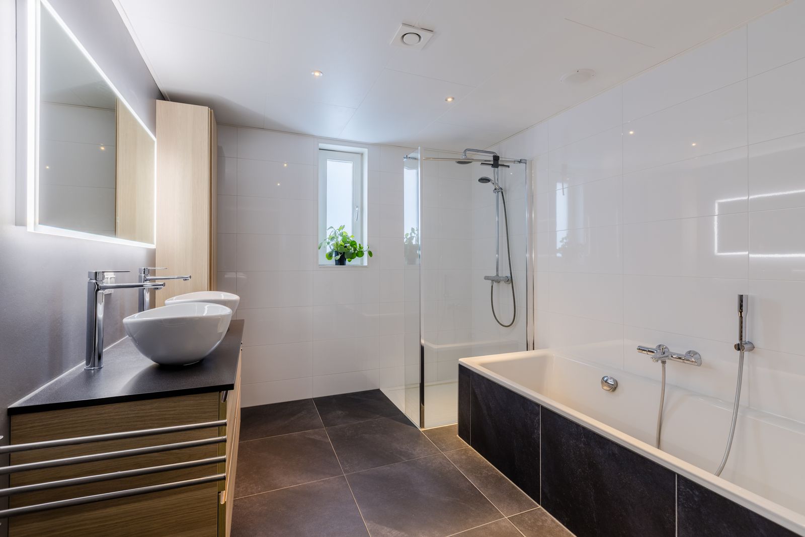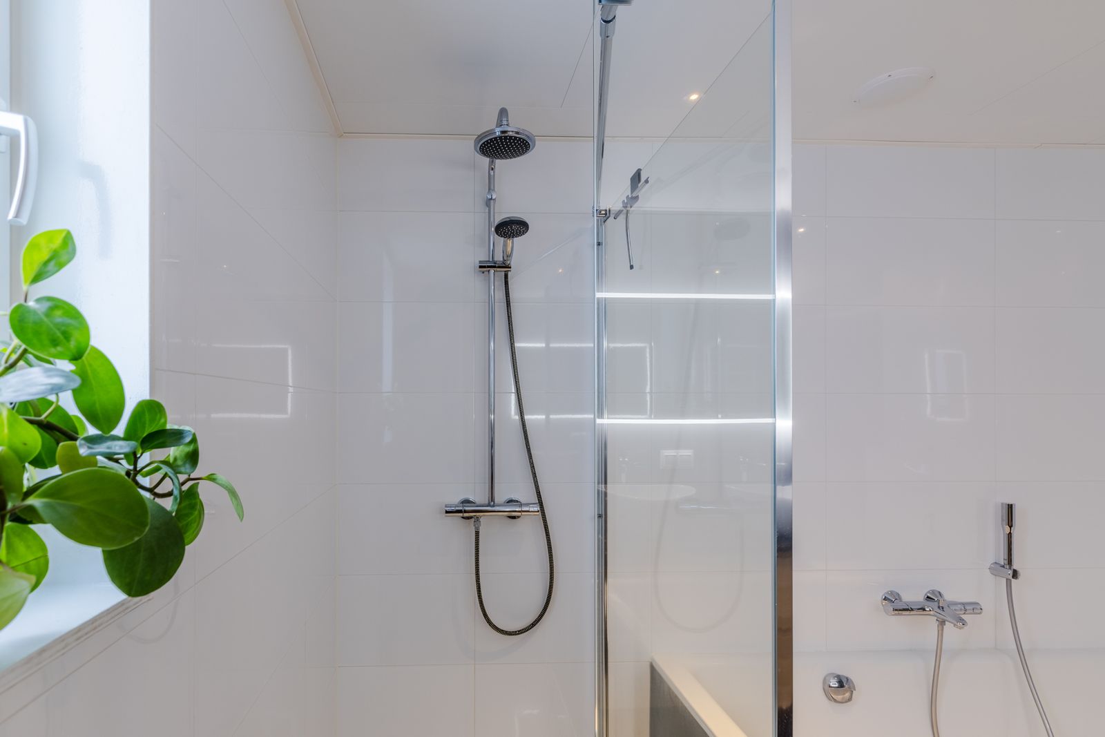 Op deze verdieping vind je een royale badkamer met inloopdouche, plaatstalen badkuip, dubbele wastafel en toilet. Extra luxe: ingebouwde plafondspeakers.