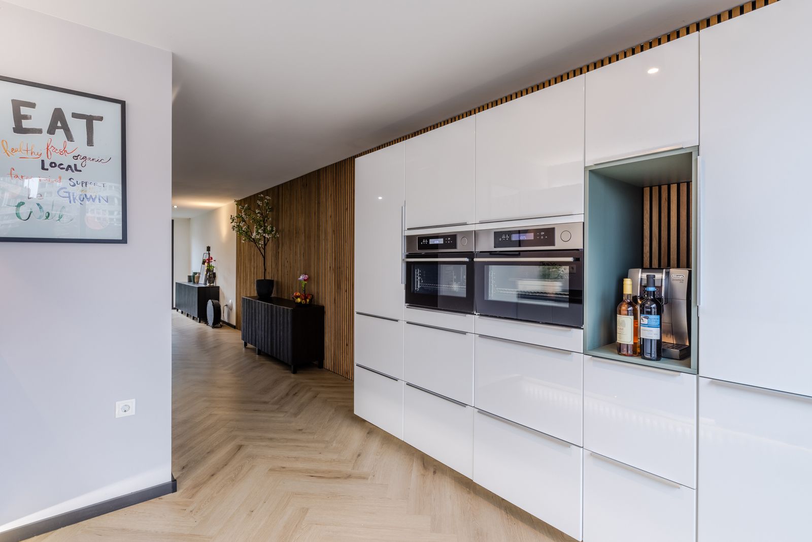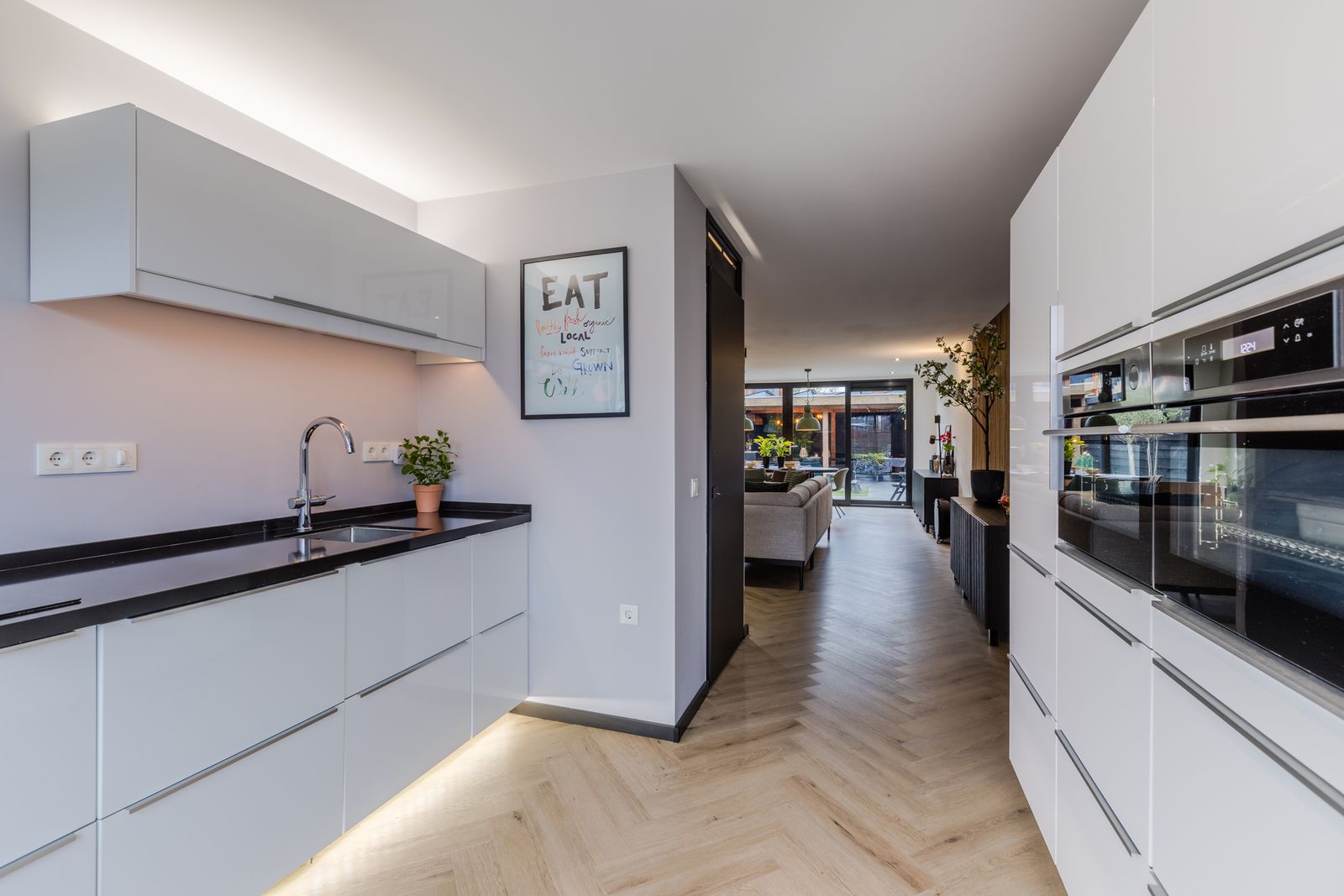 Binnenkomst in een fijne, lichte woonlaag met een moderne keuken voorzien van o.a. kokendwaterkraan, inductiekookplaat met geïntegreerde afzuiging, twee combi-stoomovens en een koel-/vriescombinatie.