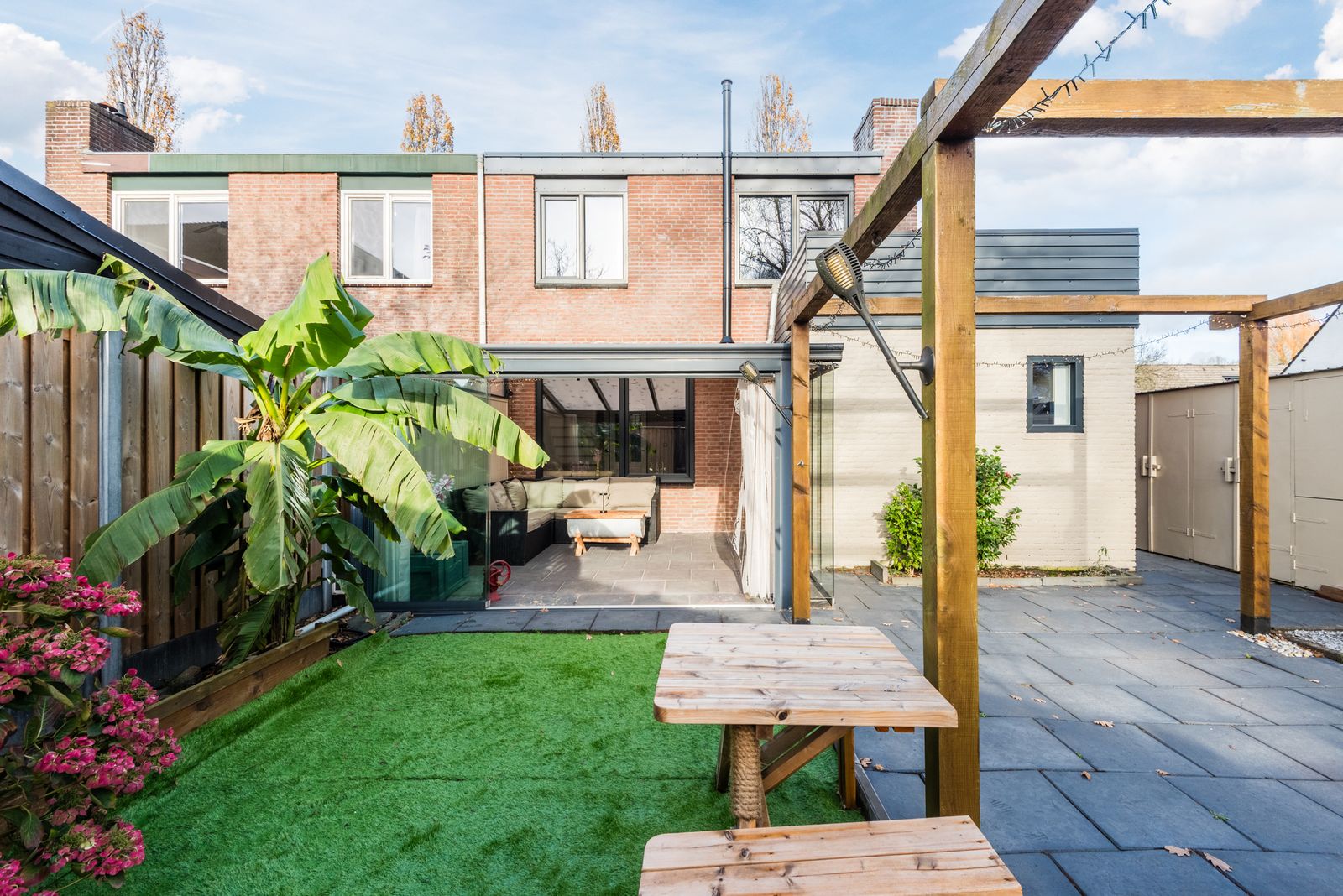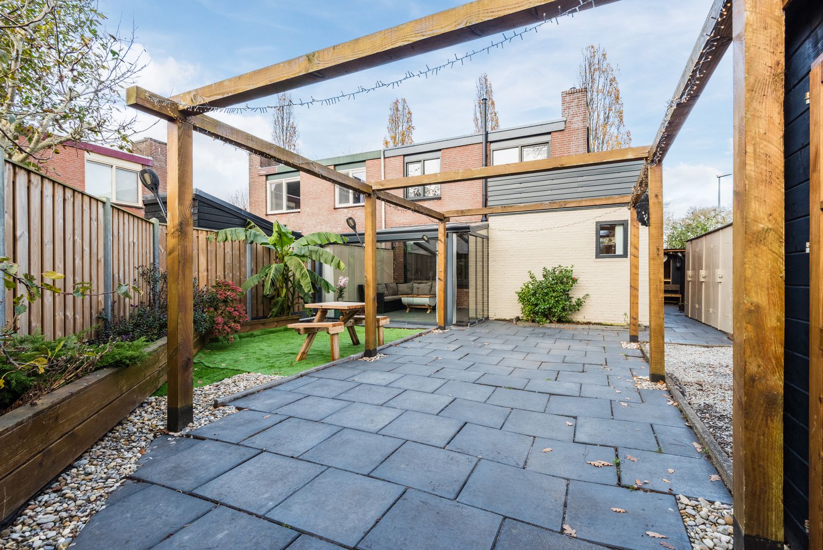 De grote achtertuin is een echte oase van rust. Hier vind je ook de buitensauna.