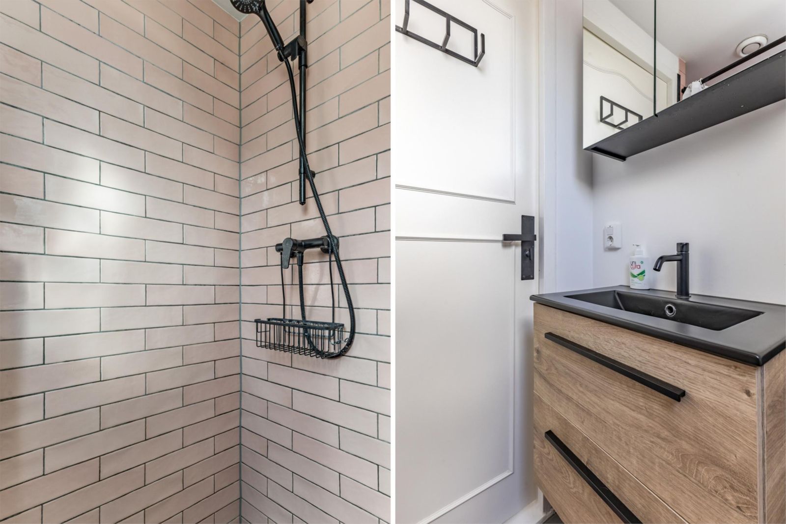 Overloop met toegang tot de in 2021 nieuw geplaatste badkamer met douche en toilet. Twee nette slaapkamers, een grote inbouwkast + meterkast en de vaste trap naar de derde slaapkamer/werkkamer.