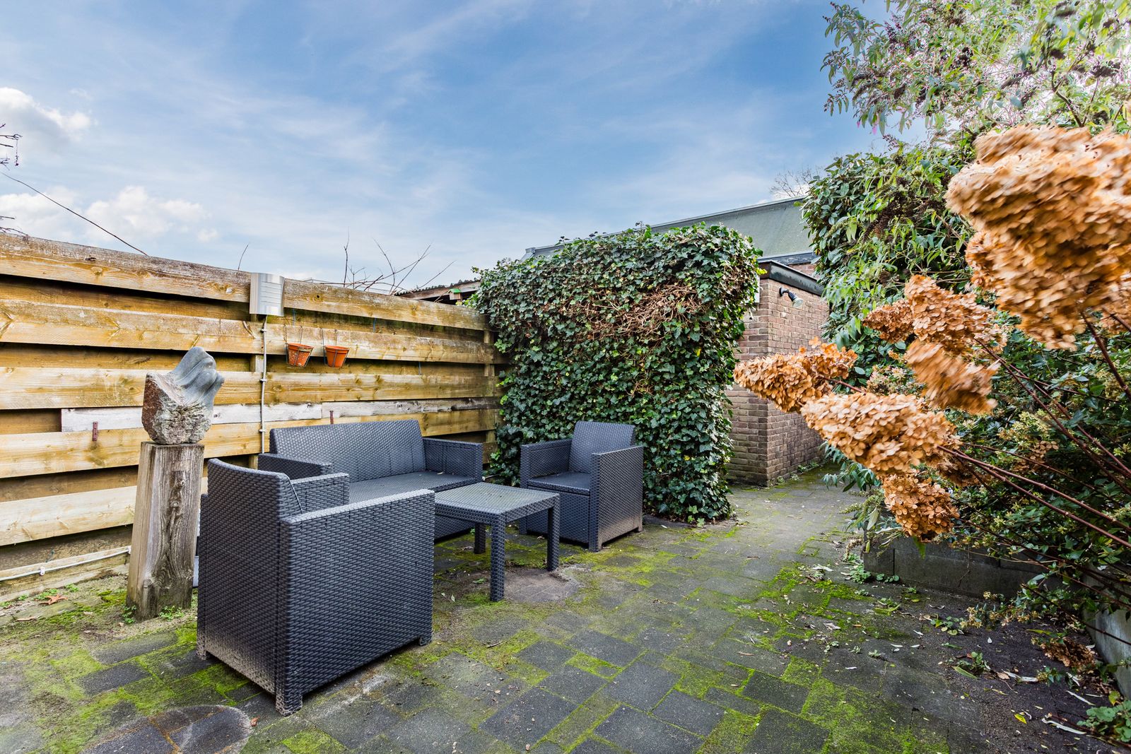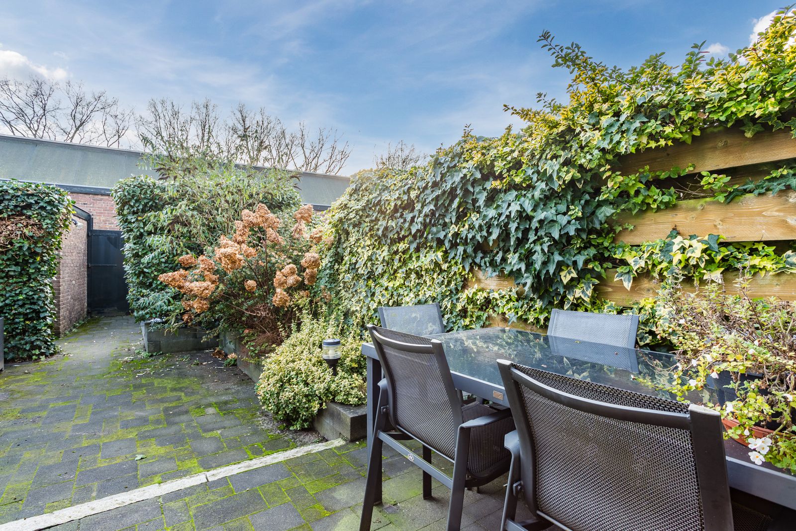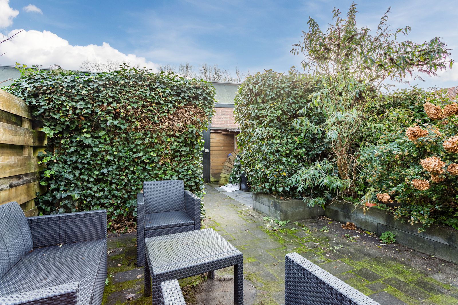 De tuin ligt op het zuiden, heeft een schuur, een achterom en biedt zeer veel privacy.