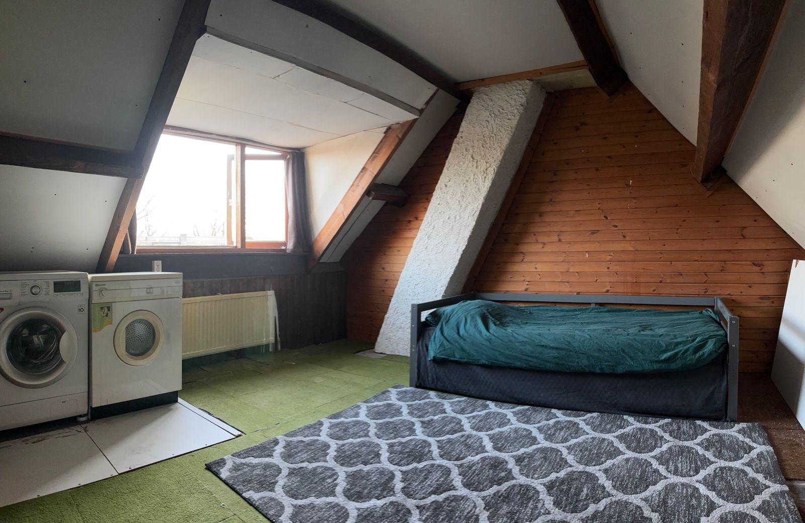 A fixed staircase leads to the large attic with a dormer window at the rear. The central heating system (2018) and the washing machine connection. The south side of the roof has 8m2 solar panels.