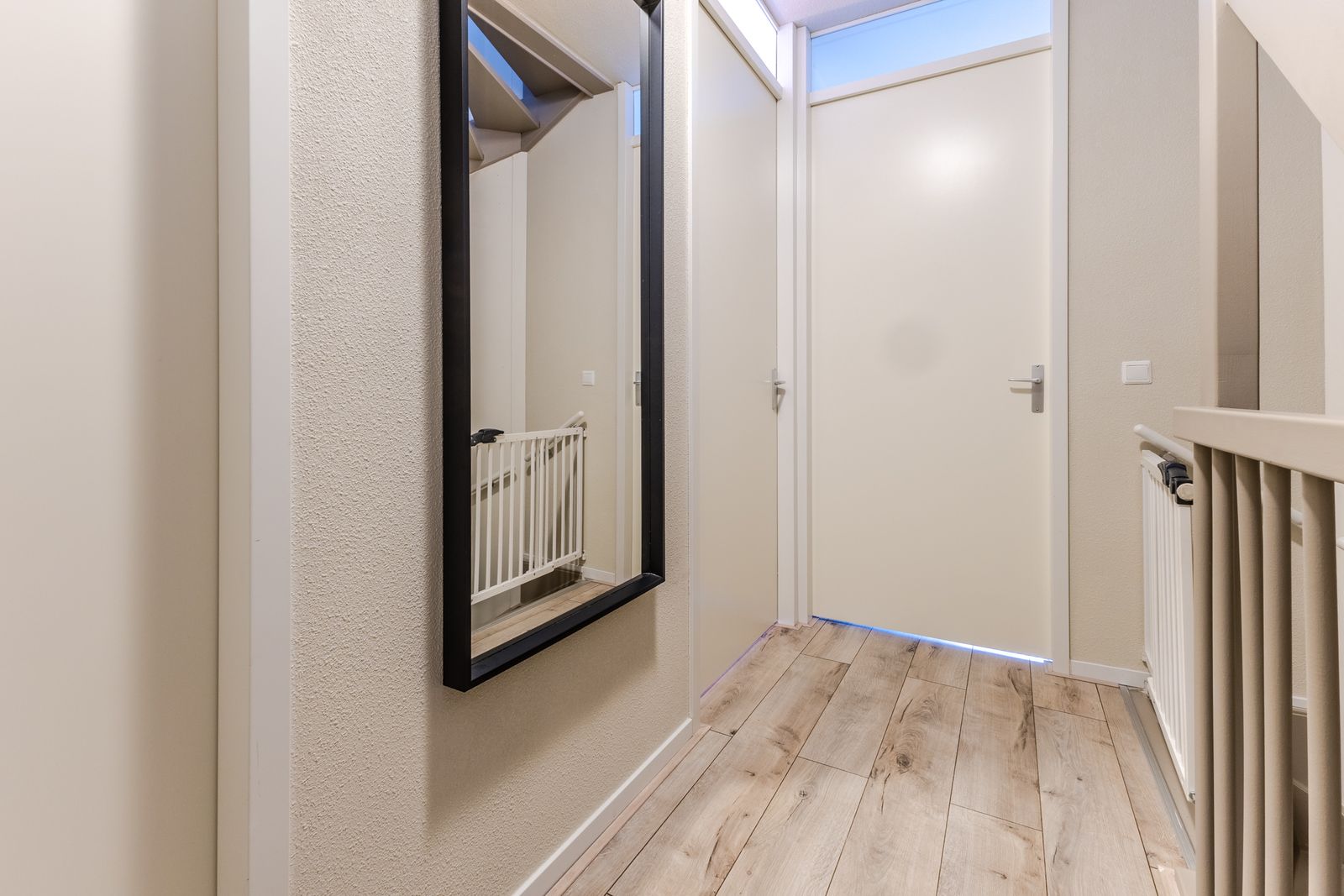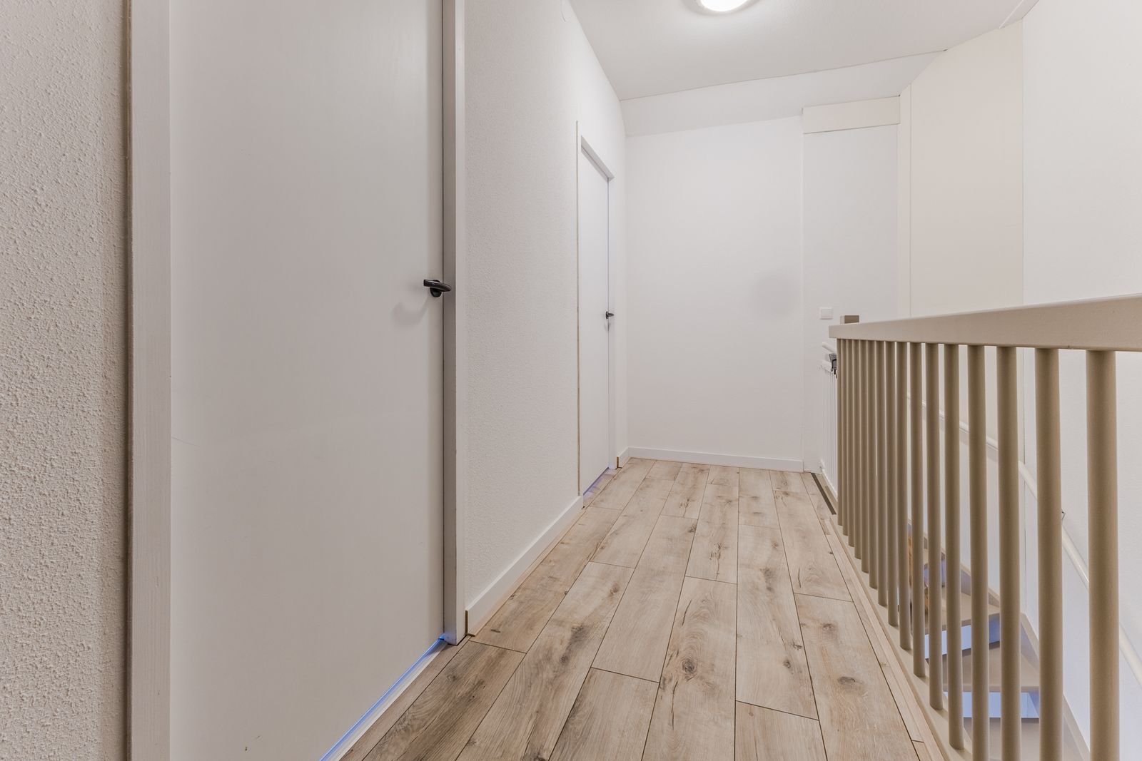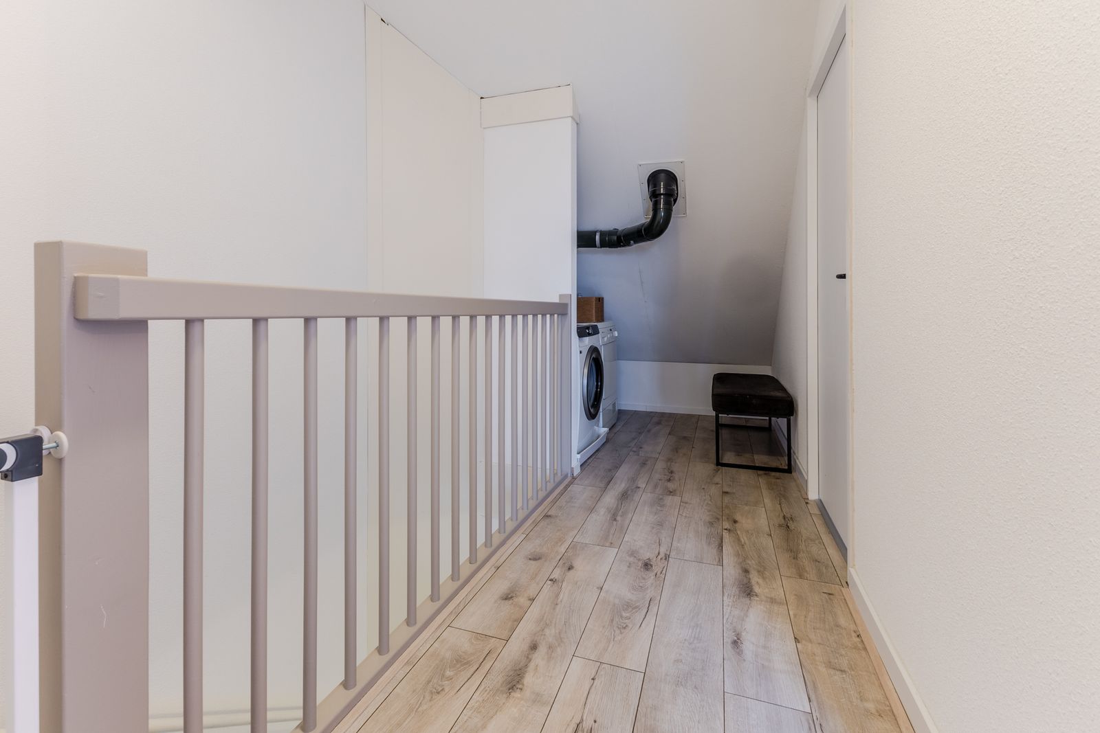 Op de overloop bevinden zich de aansluitingen voor wasmachine en droger. De cv-ketel is netjes weggewerkt in een kast in de slaapkamer aan de achterzijde.