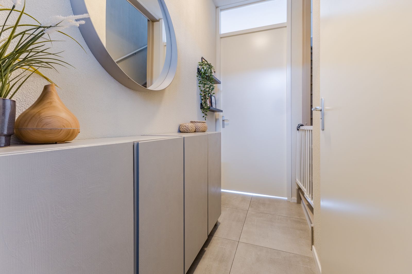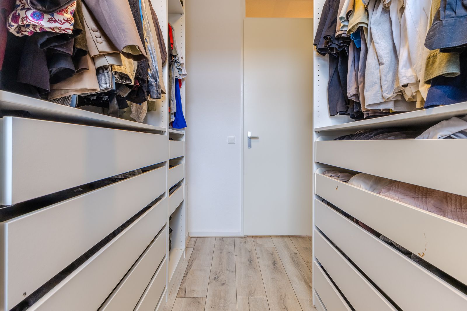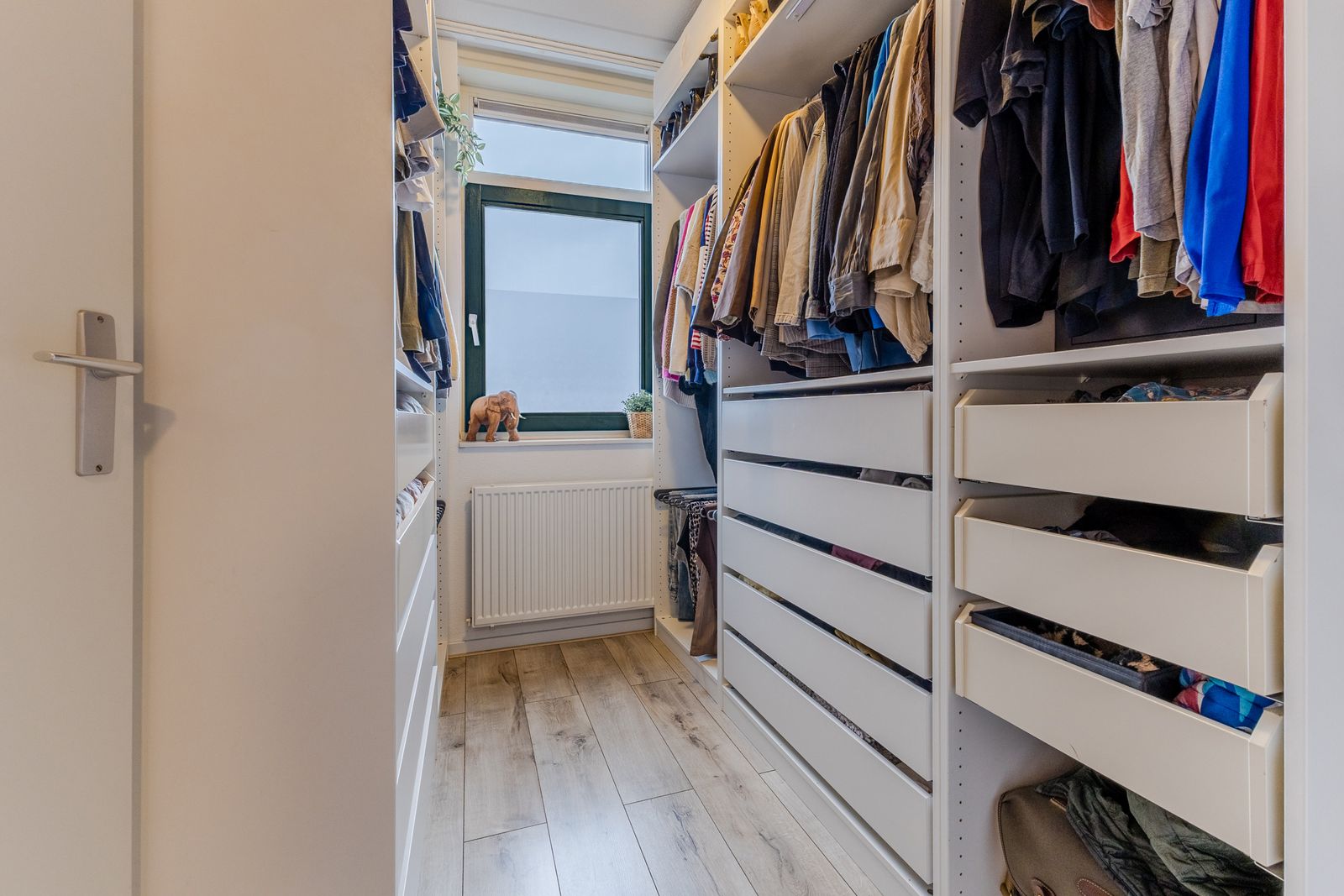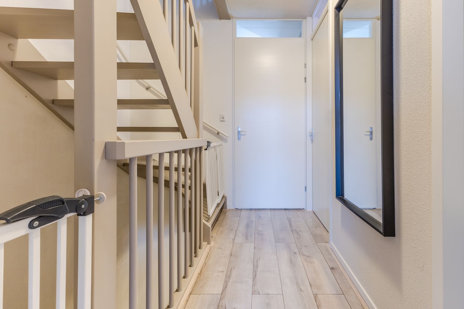 Op de overloop bevinden zich de aansluitingen voor wasmachine en droger. De cv-ketel is netjes weggewerkt in een kast in de slaapkamer aan de achterzijde.