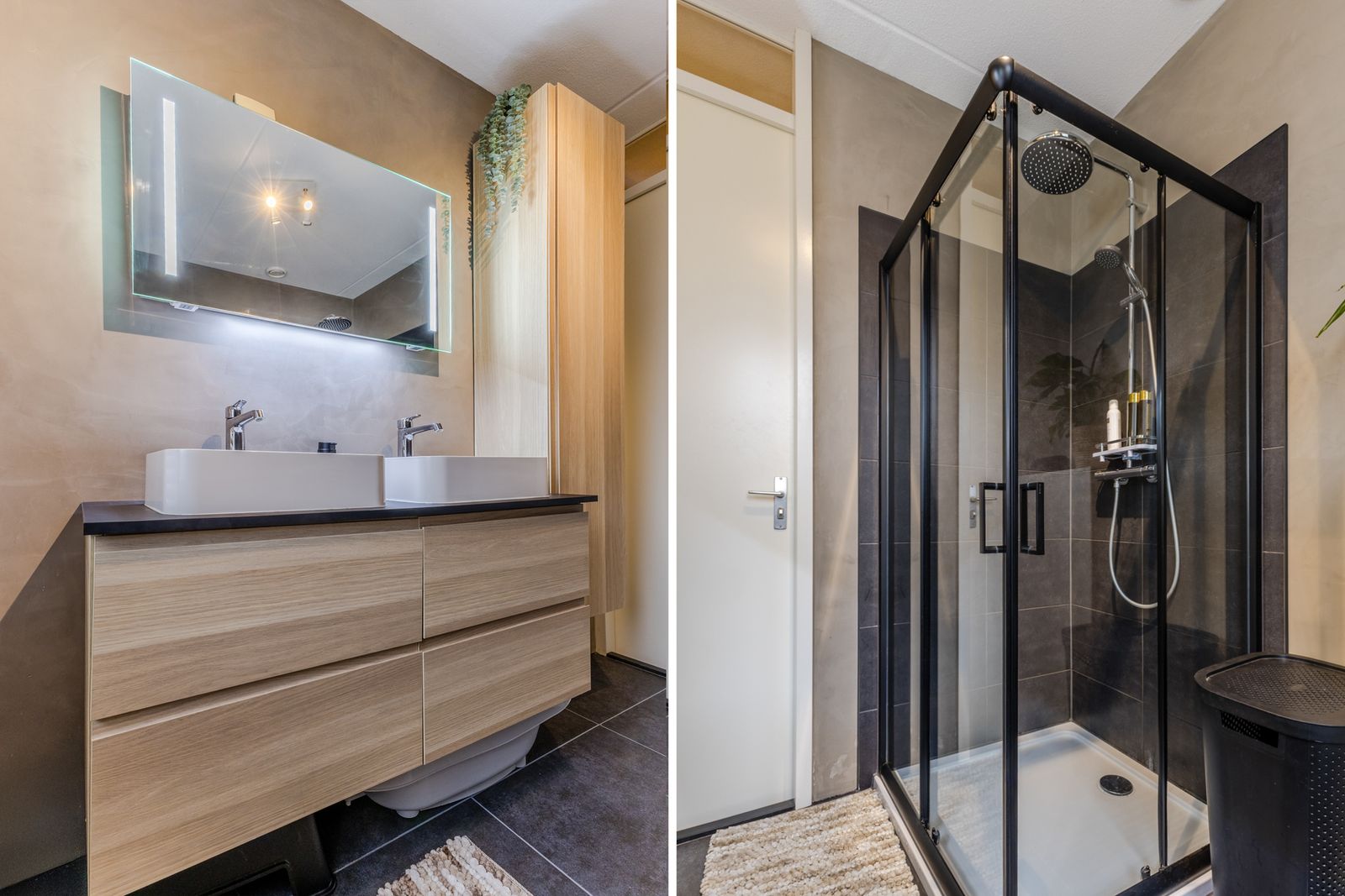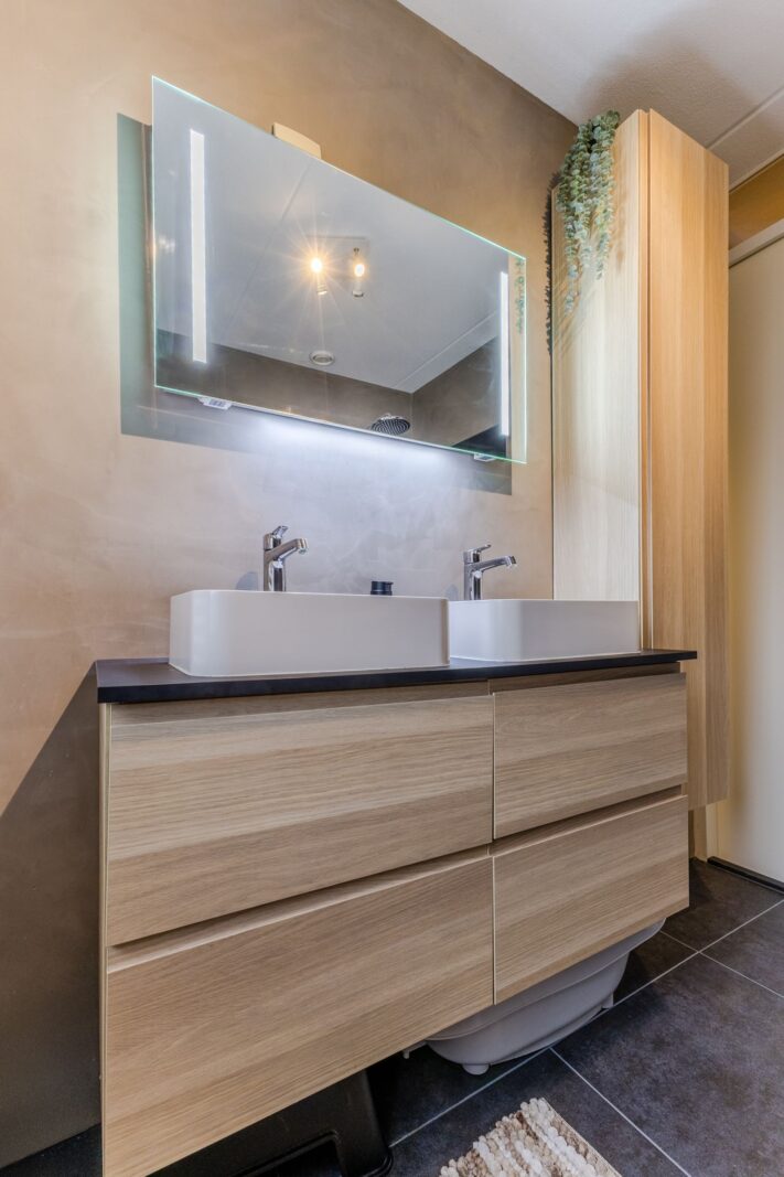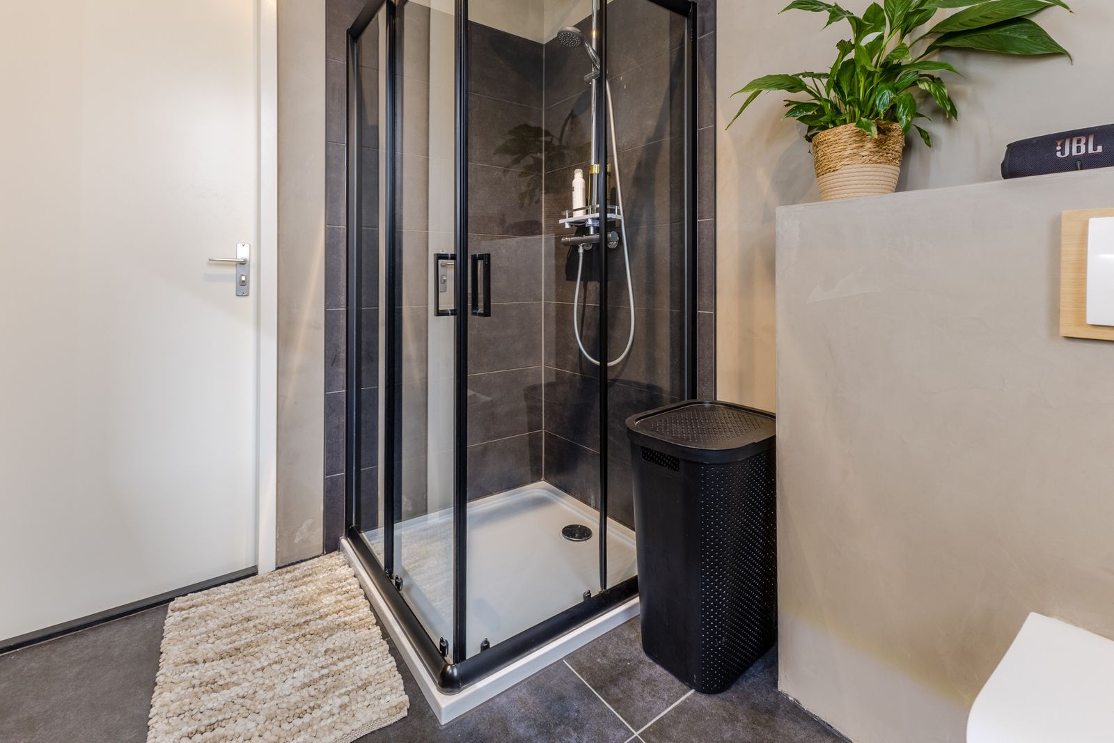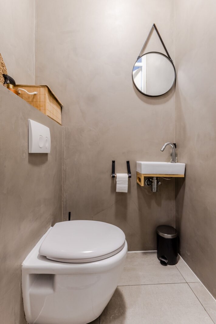 De strak afgewerkte badkamer is gestuct met betonciré en voorzien van een douche, wastafelmeubel, extra kast en een tweede toilet.